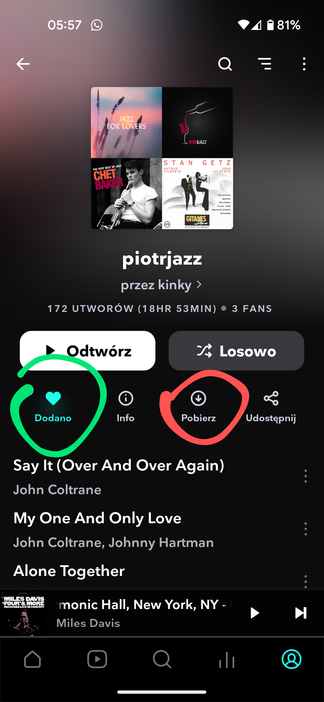Jeśli coś się w ogóle pobierało to teraz można słuchać offline. Normalnie, użytkując przez sieć komórkową czy wifi wystarczy playlistę "polubić serduszkiem" - zapisuje się wtedy ale tylko jako lista utworów. W przypadku opcji pobierz, ściągamy sobie pliki na telefon i mamy do nich dostęp bez neta. Ale to już raczej zostało wyjaśnione powyżej.