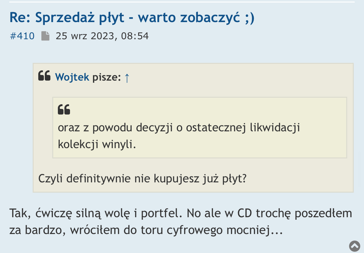 Przypomnę dla kontekstu:adamgdansk pisze:Sprzedaż z powodów finansowych oraz głównie z powodu decyzji o likwidacji kolekcji winyli.