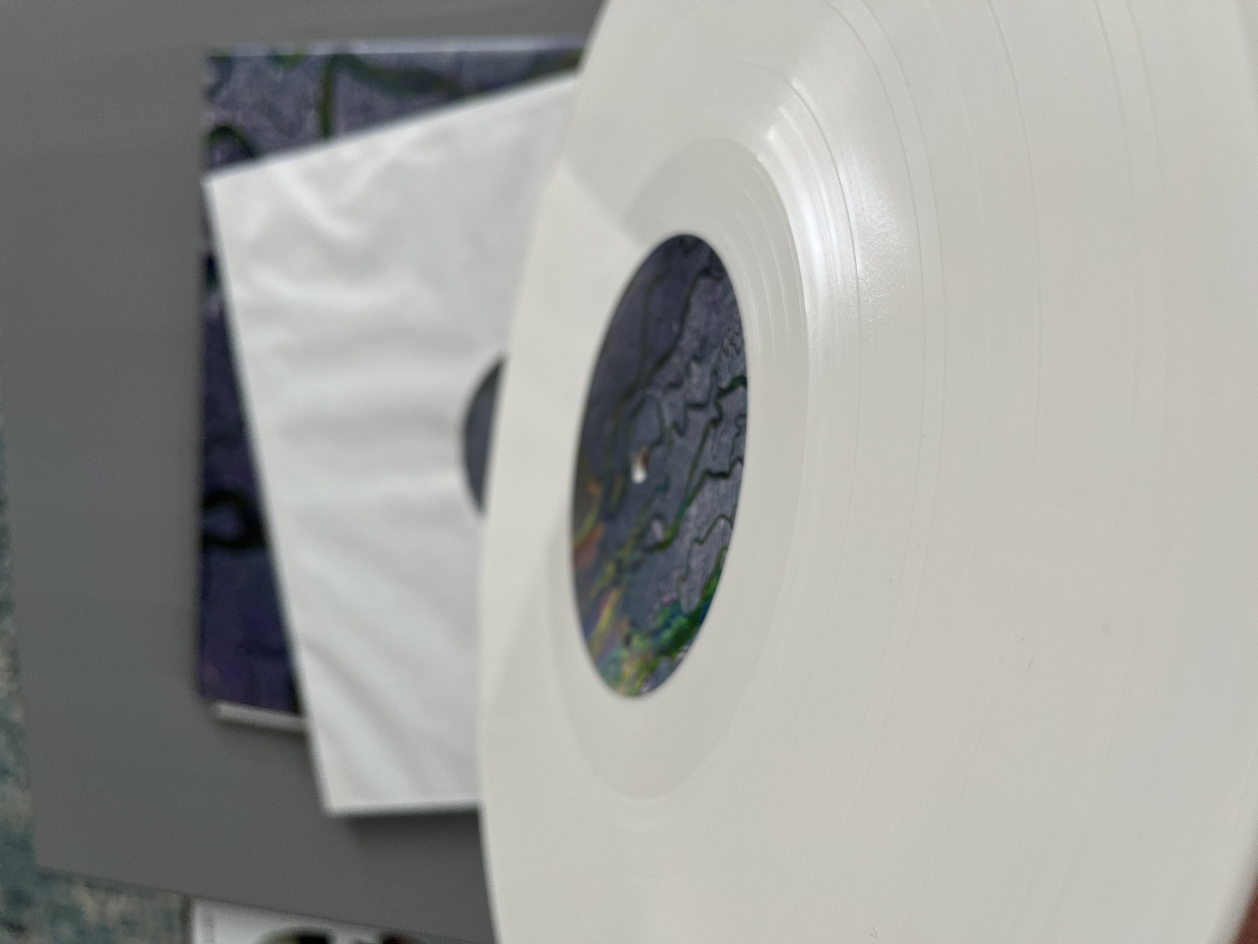 Sama płyta: strona A idealna, strona B jest kłopocik: pewnego razu po odsłuchu jak podnosiłem płytę z talerza wypadła mi z ręki i zarysowałem jej część o kant półki (jakoś ją złapałem). Szkody widać na zdjęciu: 3 ostatnie utwory pykają na rysach, nie starałem się ich „wyczyścić” w knosti, więc jest jak jest. Sprzedaję jako „uszkodzoną”, mam jeszcze jeden egzemplarz z tłoczenia 2022r, więc…może ktoś będzie chciał sprawdzić jak brzmi alt-J na winylu.