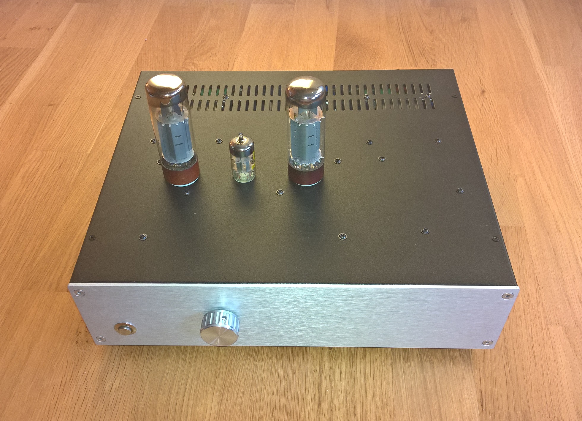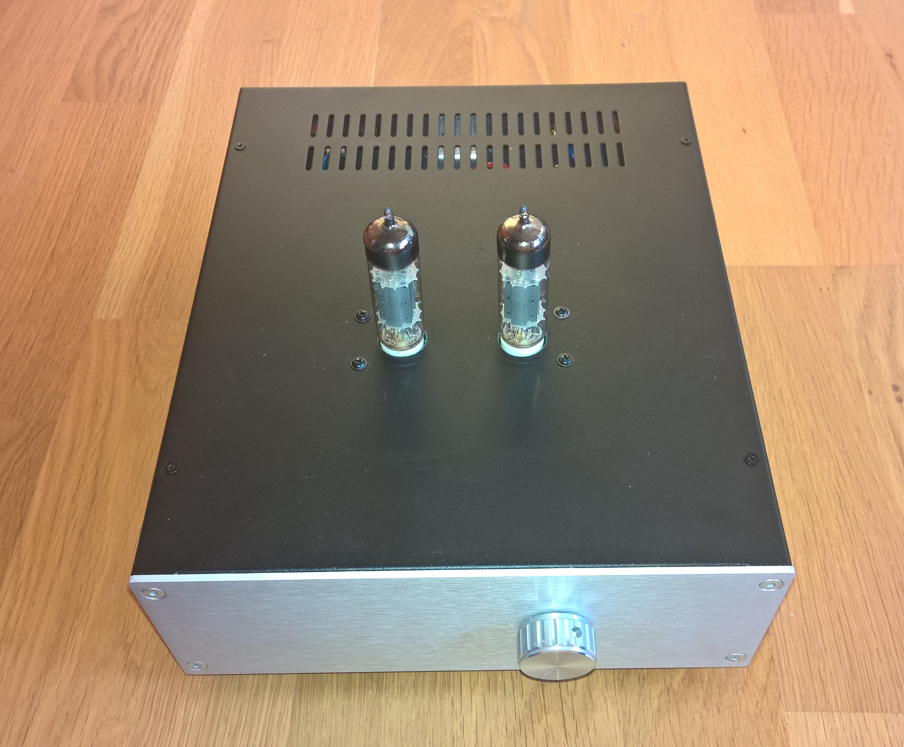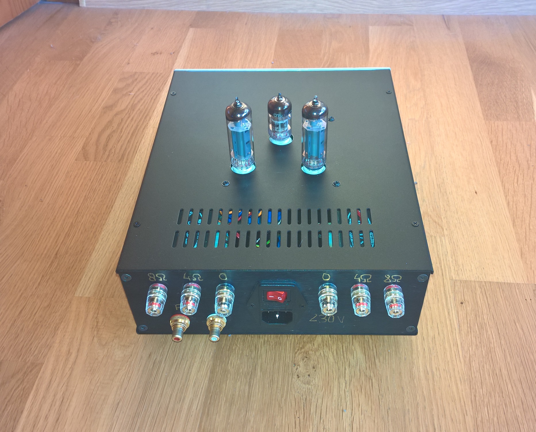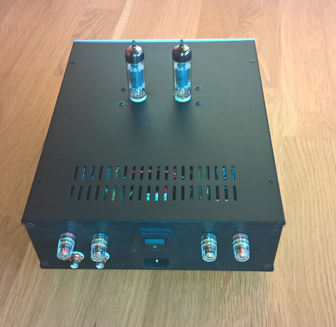 Lampy 6n2p + 6p14p (Rosyjskie wersje wojskowe o podwyższonych parametrach odpowiednik ECC83 i EL84 NOS). Obudowa z Modusa.