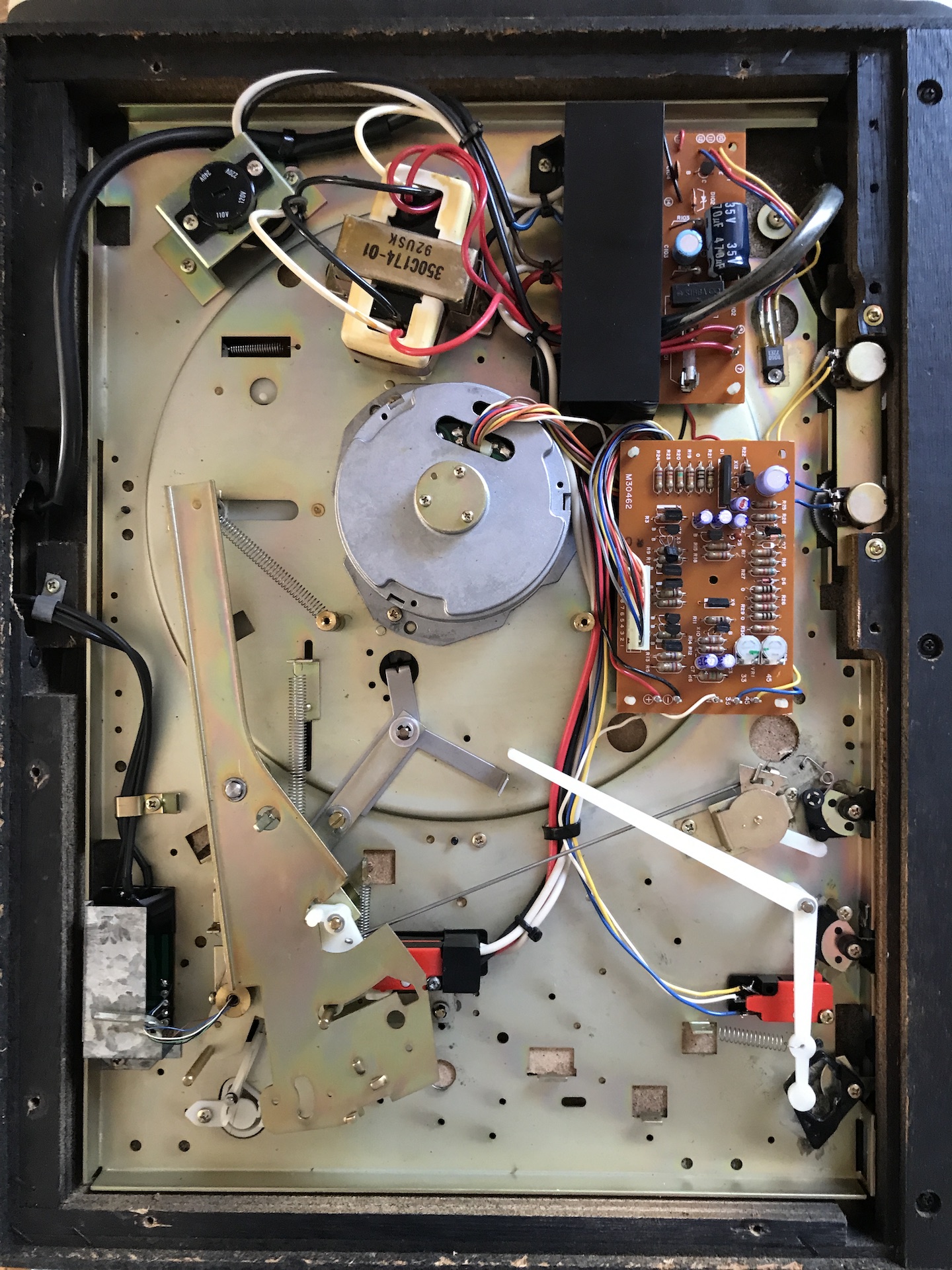 Stan ogólny dobry, jest kilka mankamentów takich jak dorobiona blokada ramienia, odklejająca się na rogach okleina, no i pokrywa do polerowania, aczkolwiek jest cała, bez pęknięć.