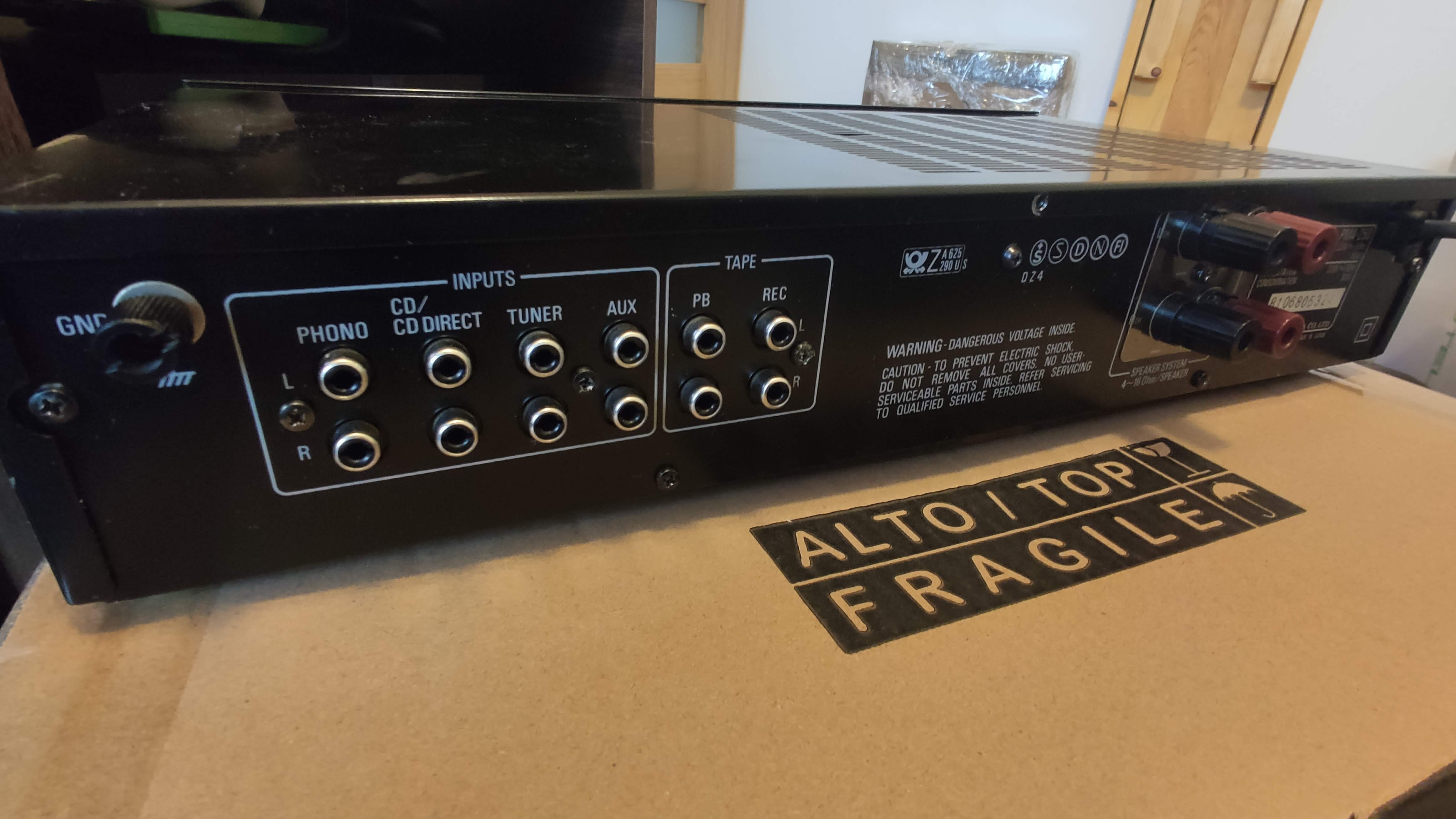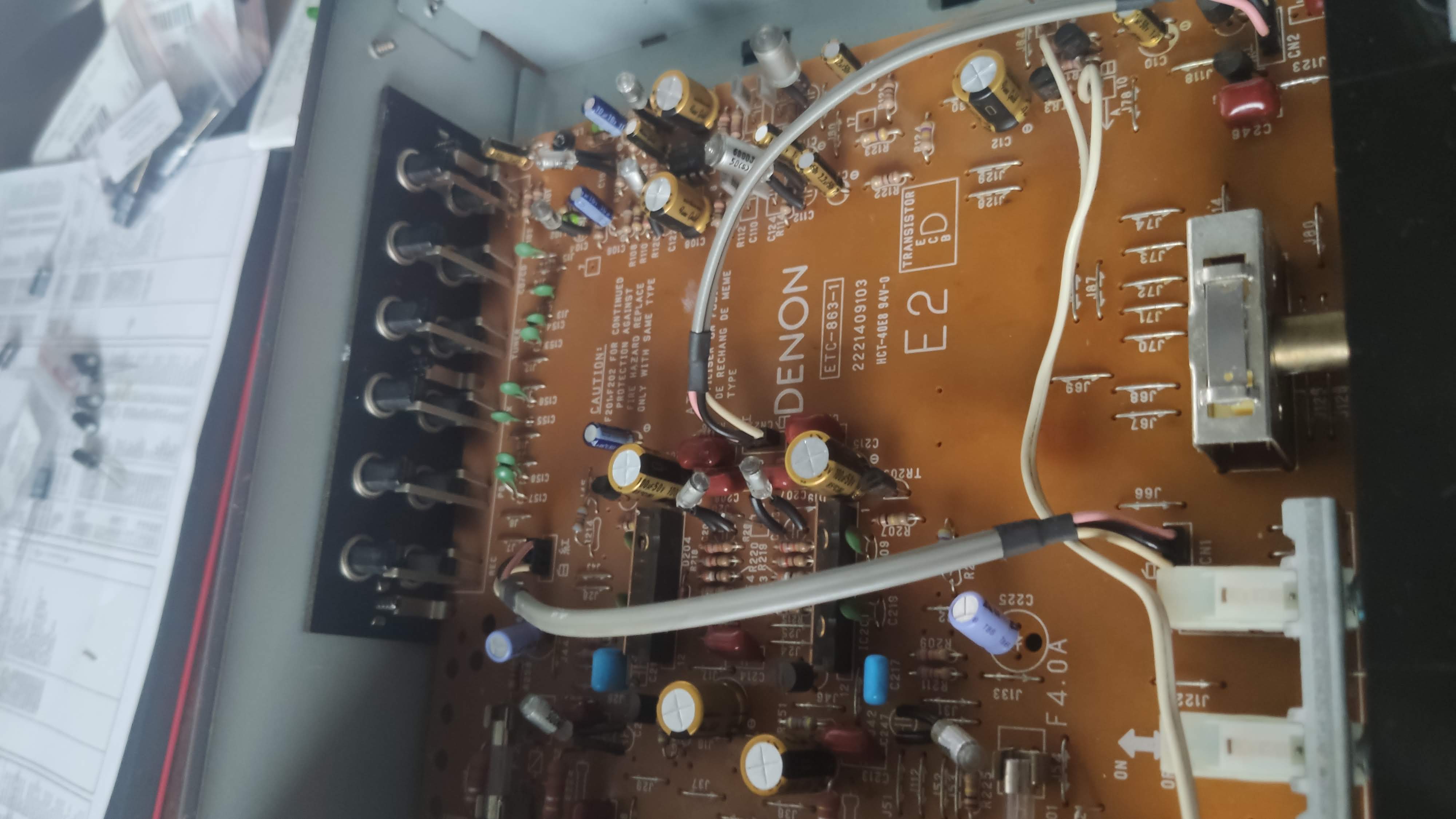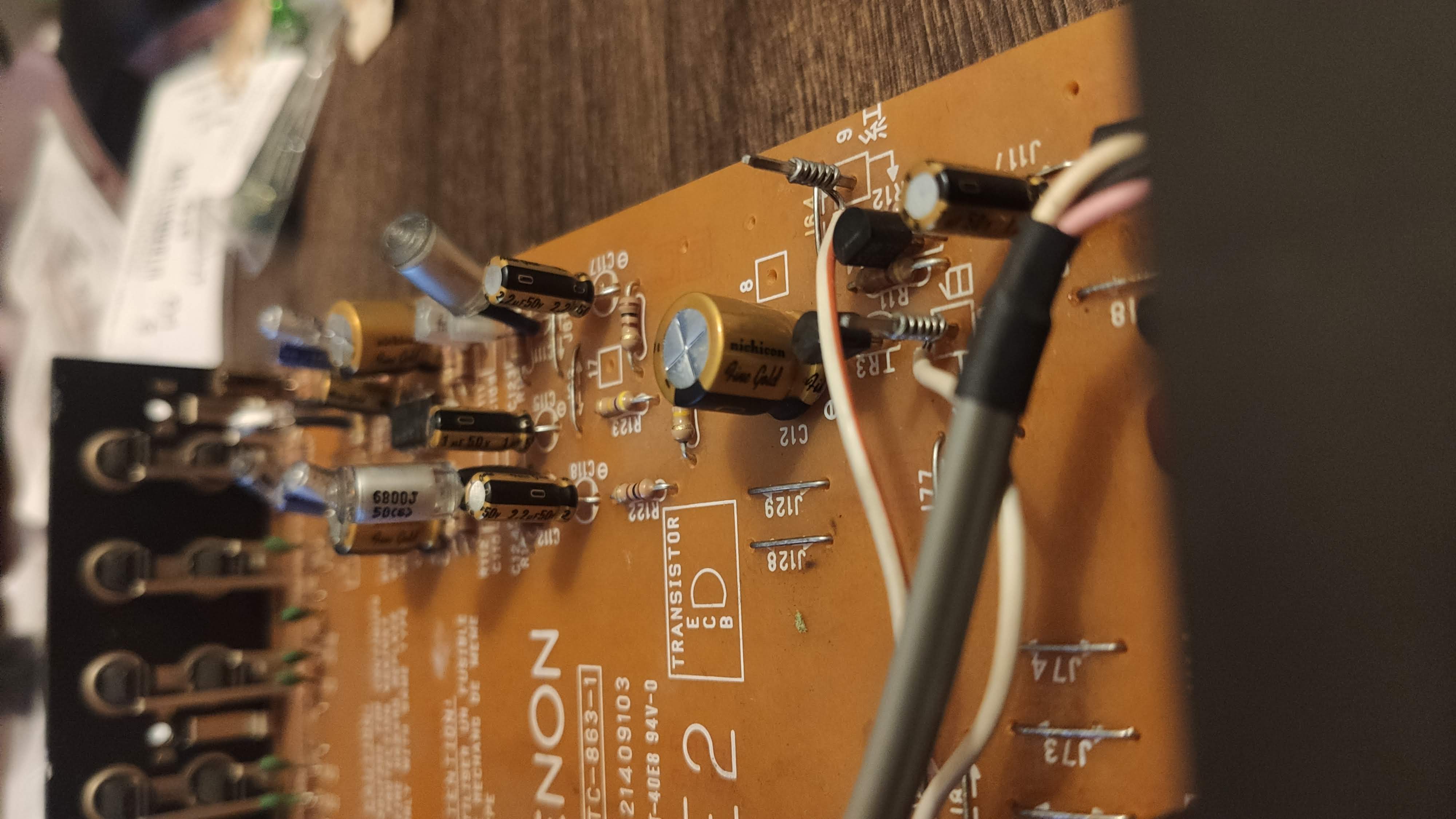 Wzmacniacz jest po serwisie, wymienione zostały kondensatory w torze zasilania, w torze przedwzmacniacza gramofonowego oraz pozostałe, jeśli tego wymagały. Tam, gdzie to było możliwe wsadzone zostały chyba najlepsze możliwe kondensatory audio, złote Nichicon FG.