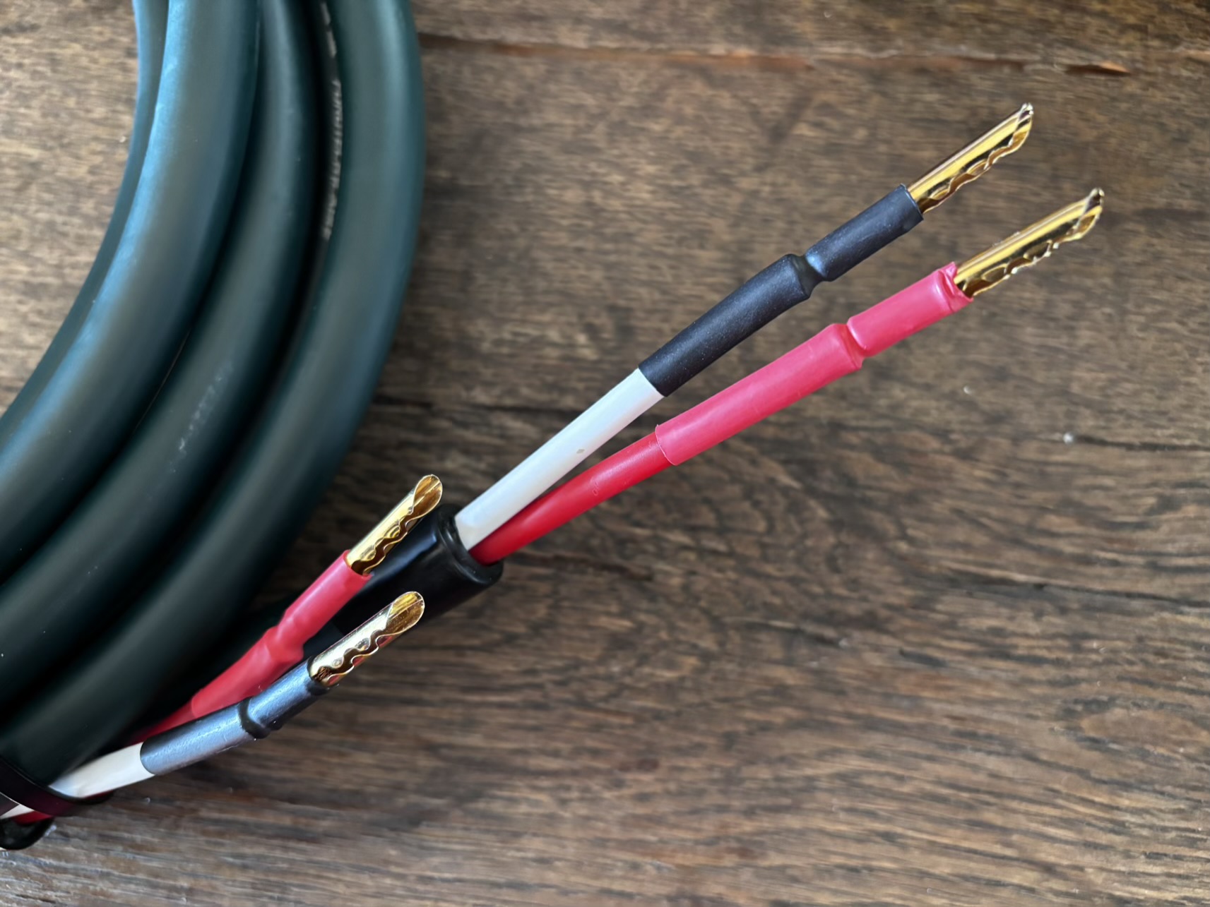 Kable głośnikowe Furutech µ-2T o długości 2x2,3 m, konfekcjonowane widłami Furutech FP-201 G (od strony kolumn) oraz bananami Eagle Cable Hollow Banana z miedzi berrylium, lutowane cyną WBT z dodatkiem srebra.