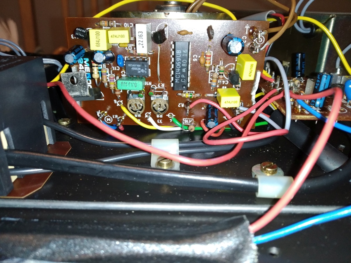 1. Wymiana kondensatorów elektrolitycznych. Część z nich wymieniona została na nowe elektrolity, część (mniejsze pojemności) na kondensatory foliowe. Wykonano zgrubną regulację obrotów. Silnik wchodzi na założone obroty bardzo szybko i nie ma problemów ze stabilnością