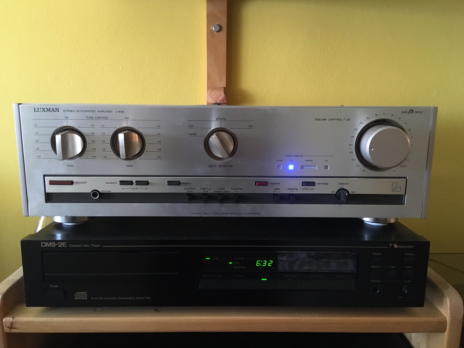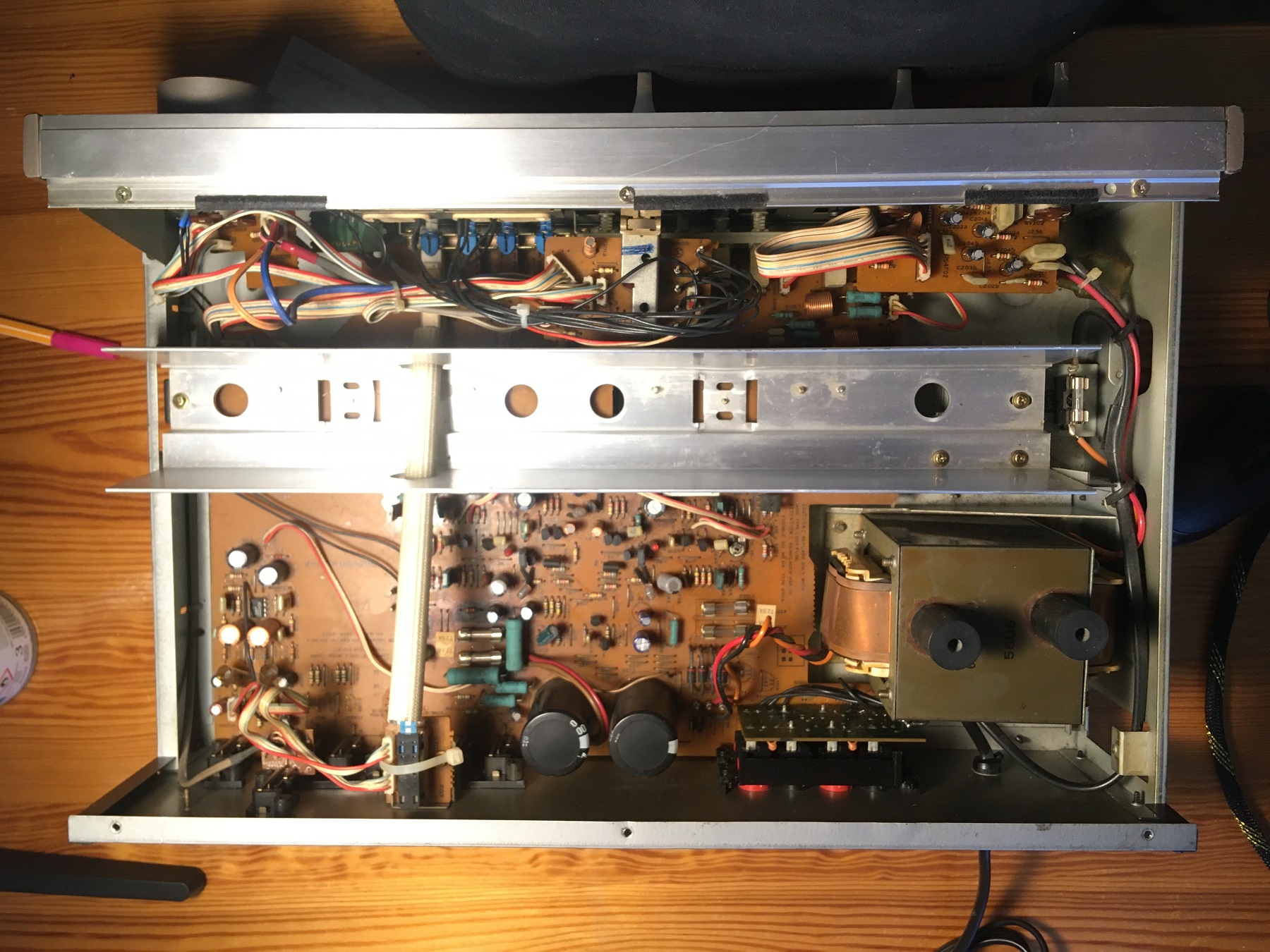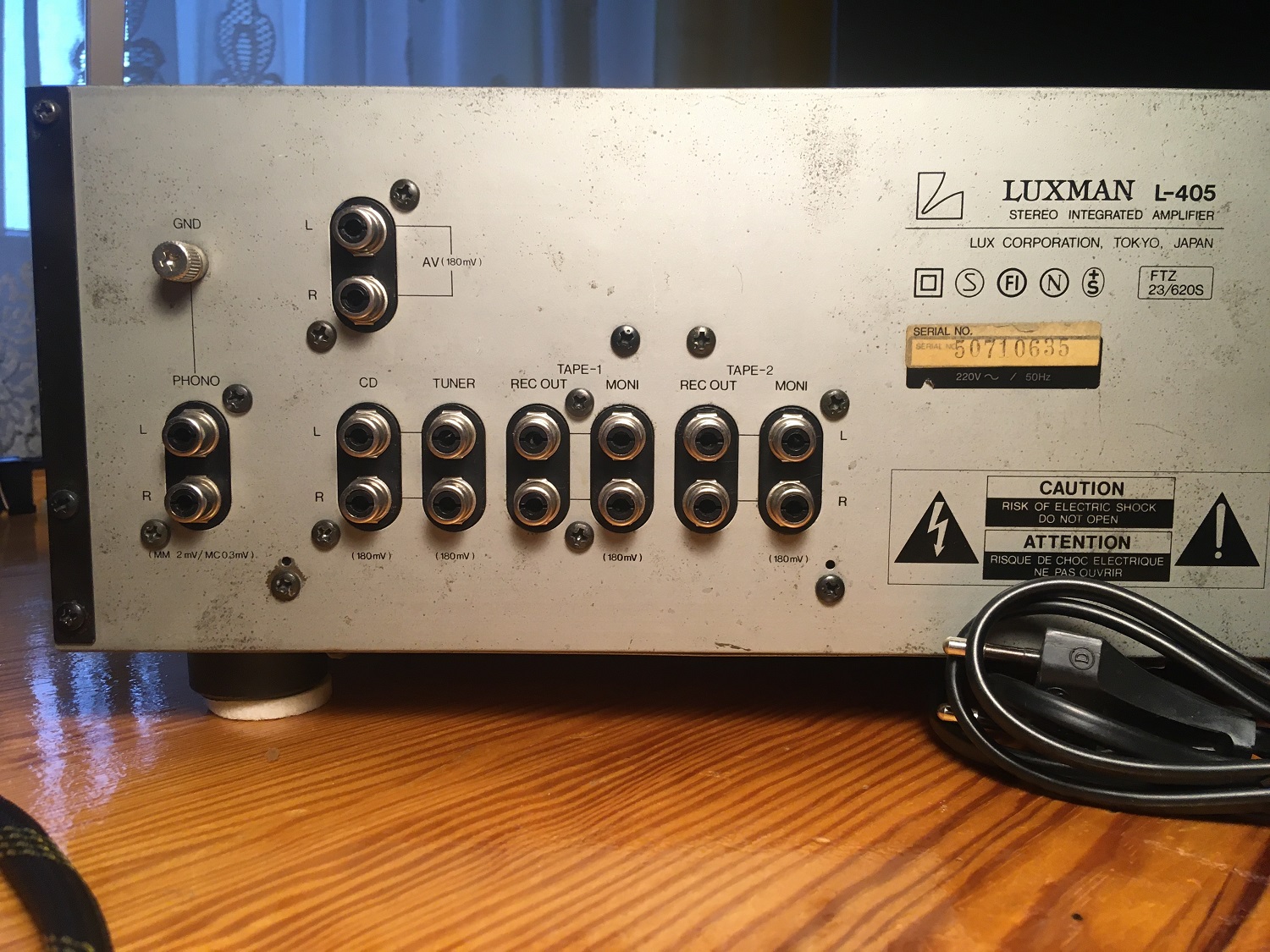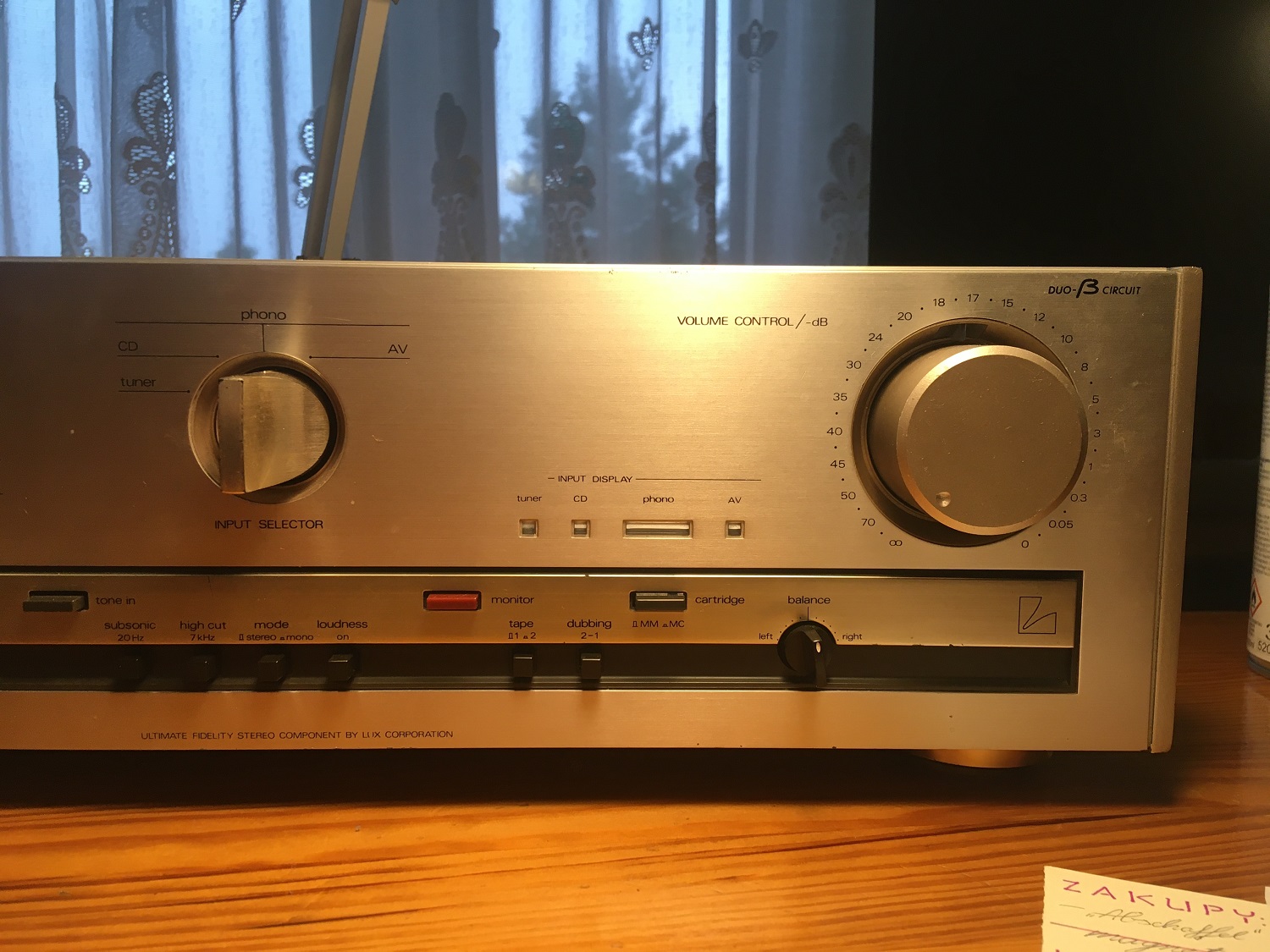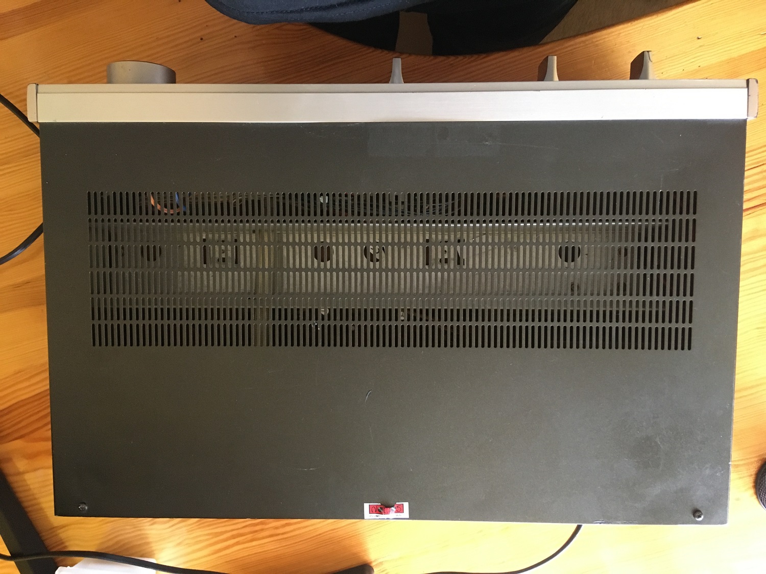 Sprzęt w dobrym stanie. Używałem go regularnie (co nie znaczy, że zbyt intensywnie) przez osiem lat, sparowany z wkładkami AT. Myślę, że to dobra kombinacja - z szurami mógłby być zbyt basowy. Dla pewności sprawdziłem dziś wszystkie funkcje, wejścia, terminale głośnikowe. Wyniki pomyślne. Przyciski i pokrętła chodzą, jak powinny. Światełka świecą. Nic nie trzeszczy, nie parska, nie buczy. Oba kanały równe.