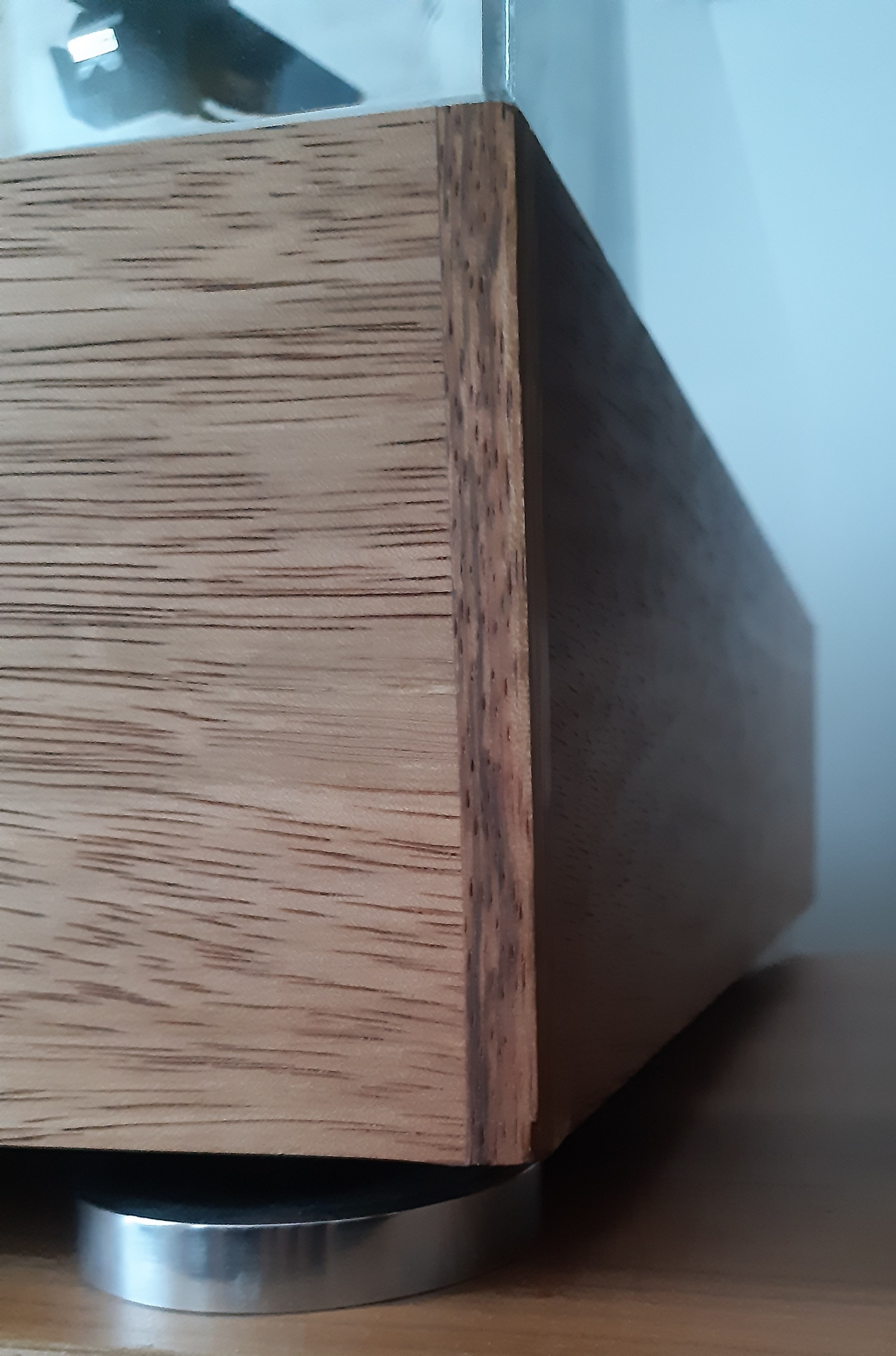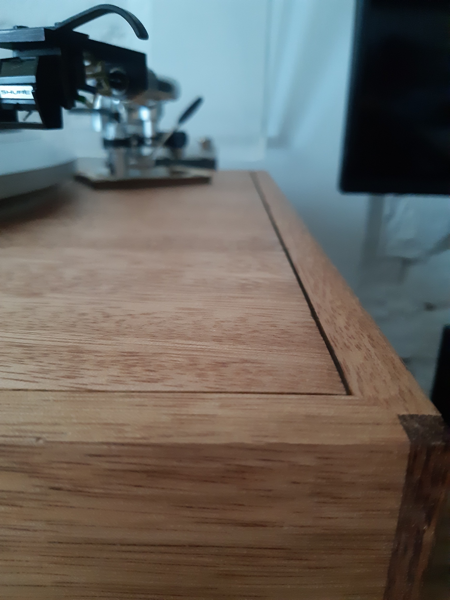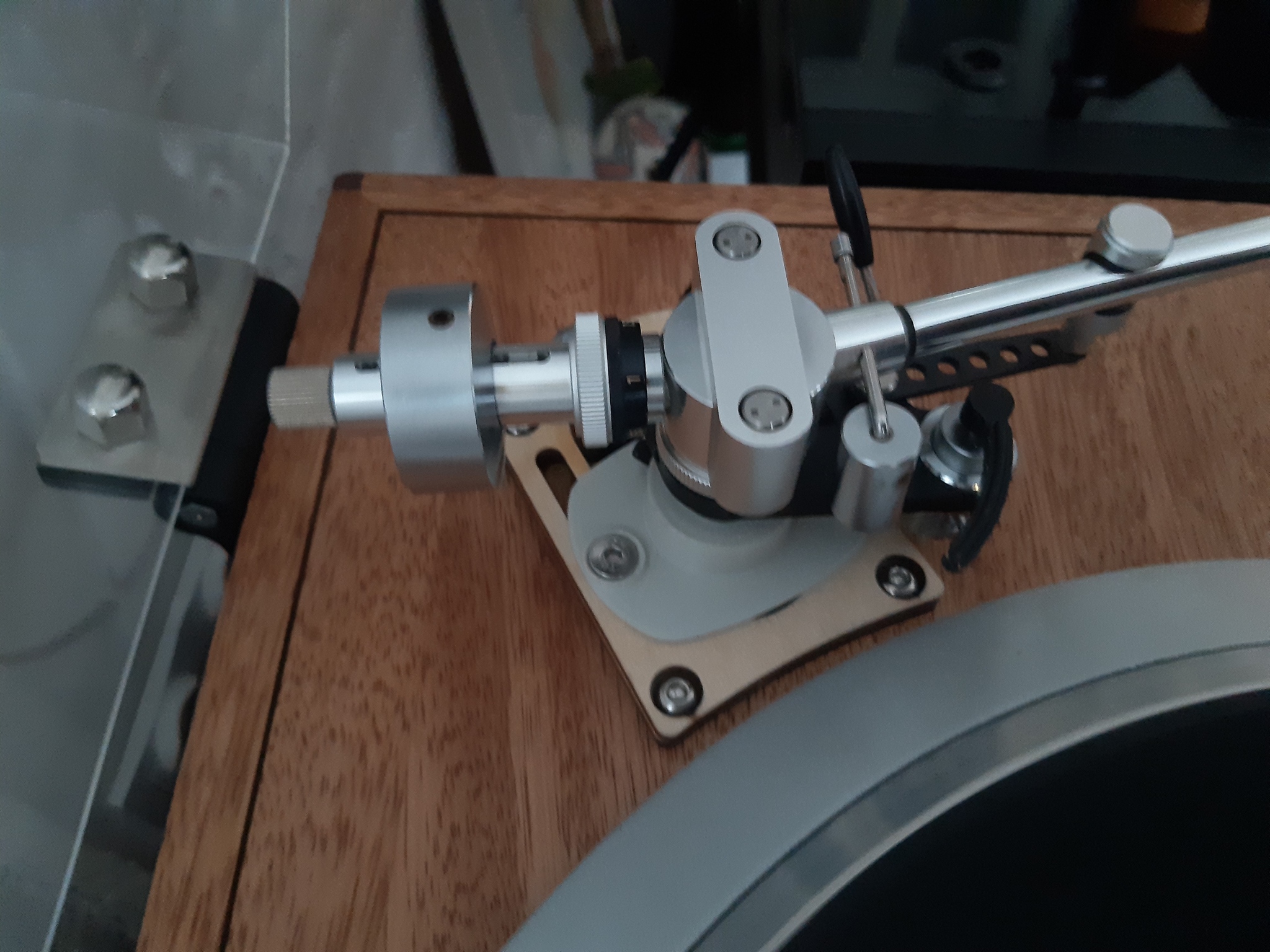 • Plintę z pokrywą, trafem, zawiasami z regulacją pozycji i siły jej utrzymywania, nóżkami z polerowanego aluminium, podstawkami pod różnego rodzaju ramiona. Całość jest moim pomysłem, połączeniem sklejki wyciętej laserowo z wydrukami 3D z ABS. W zestawie są mocowania do ramion o średnicach podstaw Fi 16 (np. Denon DA-307), Fi 18 (Sony PUA-1600-S), Fi 20 (np. AT-1100). Zakres regulacji podstawki obsłuży większość, jeśli nie wszystkie ramiona 9". Ramiona 12" już się do tej plinty nie zmieszczą. Plinta jest wykonana z litego drewna mahoniu afrykańskiego, oraz fragmentu płyty MDF. Drewno jest olejowane. Pokrywa jest dorobiona na zamówienie do wymiaru plinty.