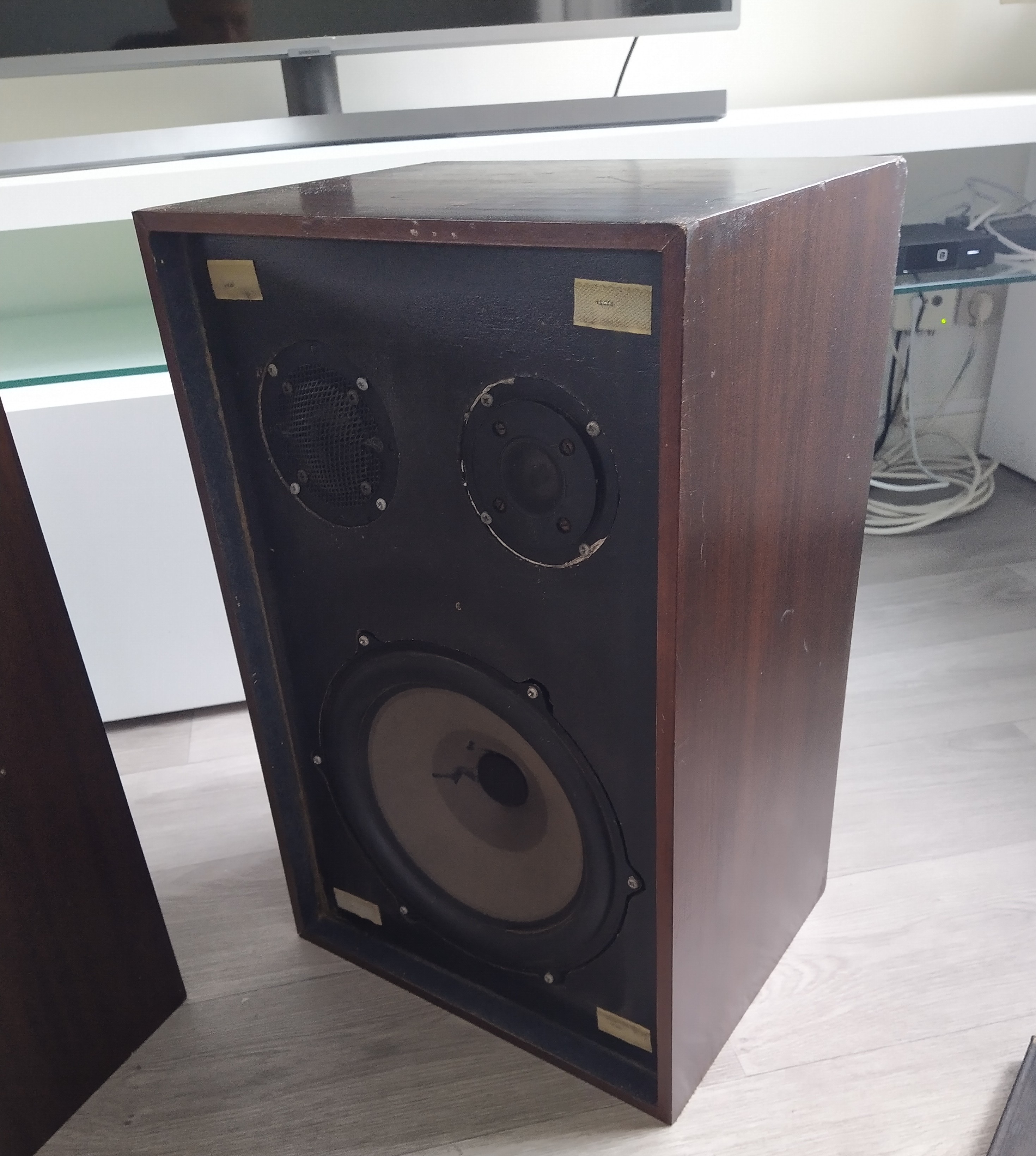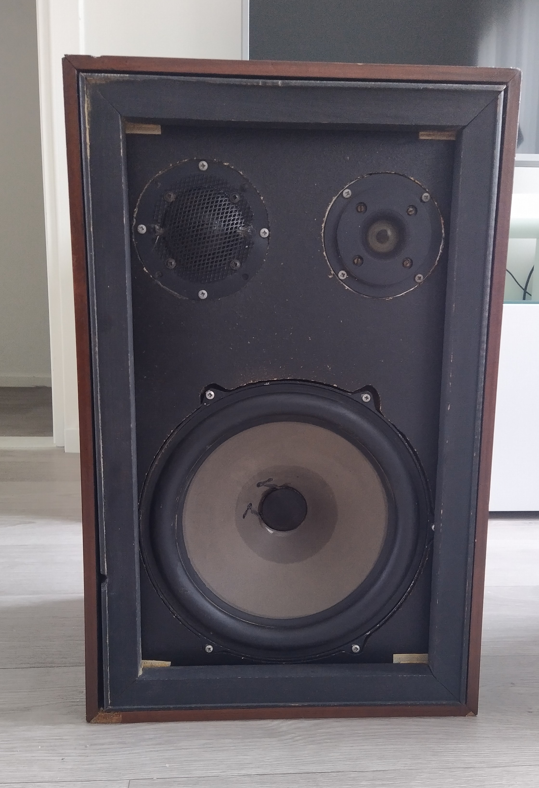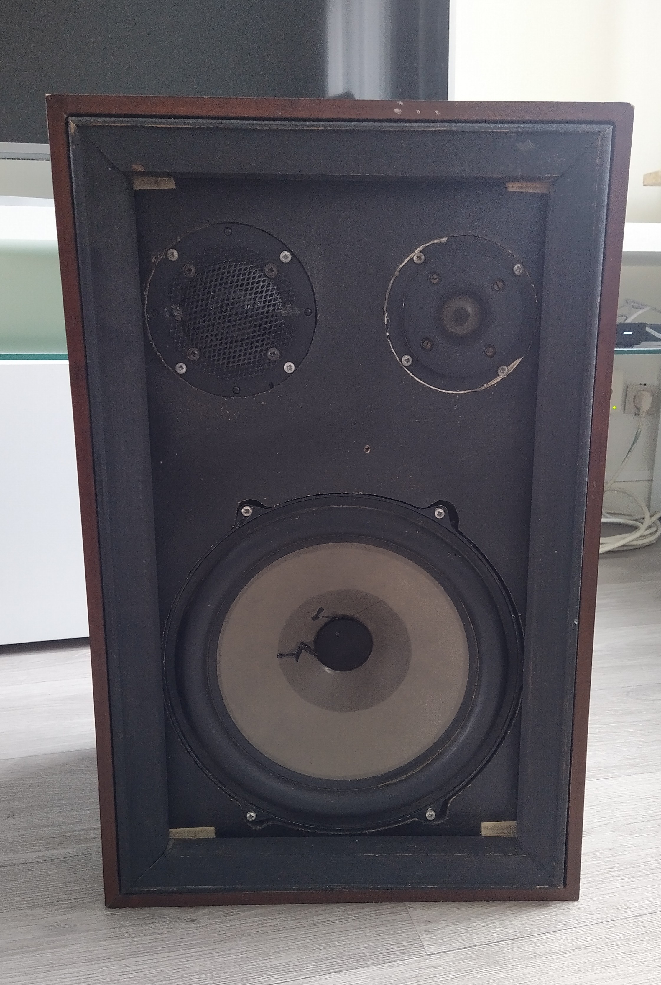 Oferuję belgijskie kolumny z 1973roku. Kolumny sprawne, wszystkie głośniki grają ciepło i pięknie, membrany w bardzo dobrym stanie. Obudowy wymagają renowacji, z braku czasu nie doczekały się tego. Kolumny stały cały czas w mieszkaniu, nie na żadnych strychach czy piwnicach. Są ciężkie wymiary: