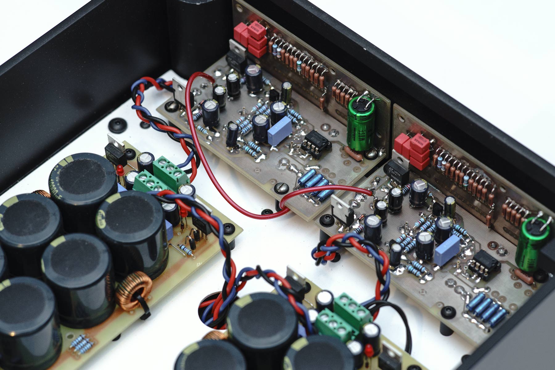 Wszystkie stabilizatory to Linear LT, dławiki i dużo pojemności (60000uF na kanał) zbocznikowanej zgodnie z zaleceniami.