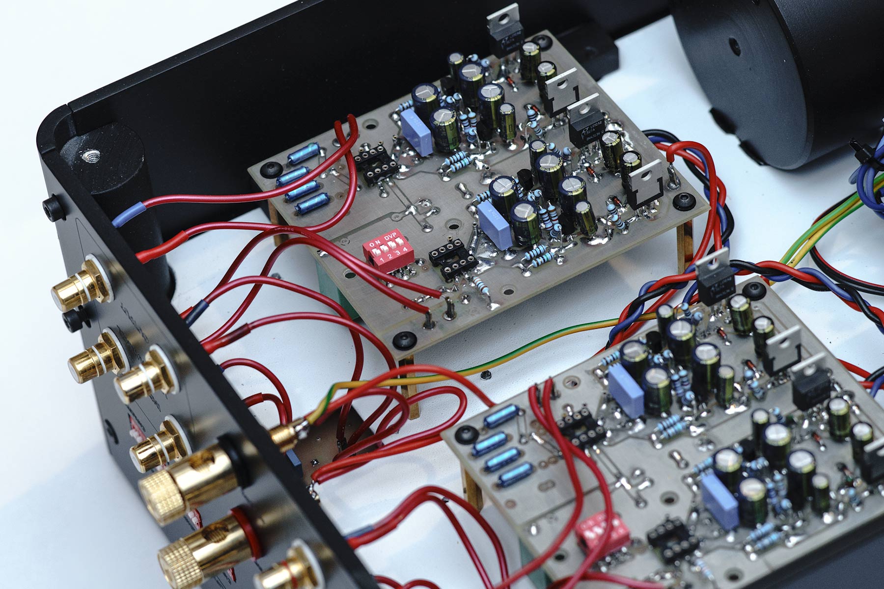 Na płytkach poszczególnych sekcji również stabilizatory LT. Kondensatory elektrolityczne Nichicon, rezystory o niskim ppm, małej tolerancji - Dale, Vishay. W układzie korekcji kondensatory o niskiej tolerancji. Okablowanie sygnałowe Neotech. W sekcji MM najlepsze możliwe scalone opampy - BB OPA627. Sekcja MC jest nie obsadzona - dołączam do oferty pary BB OPA27, LME49710 - można samemu sprawdzić i dobrać dźwięk pod osobiste preferencje.