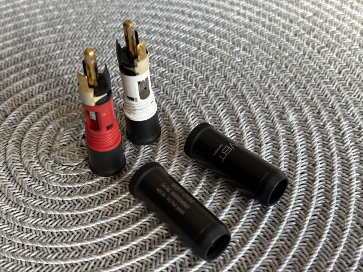 Wtyki raz lutowane cyną WBT z dodatkiem srebra, w stanie idealnym. Kupione w Polsce u oficjalnego dystrybutora WBT.