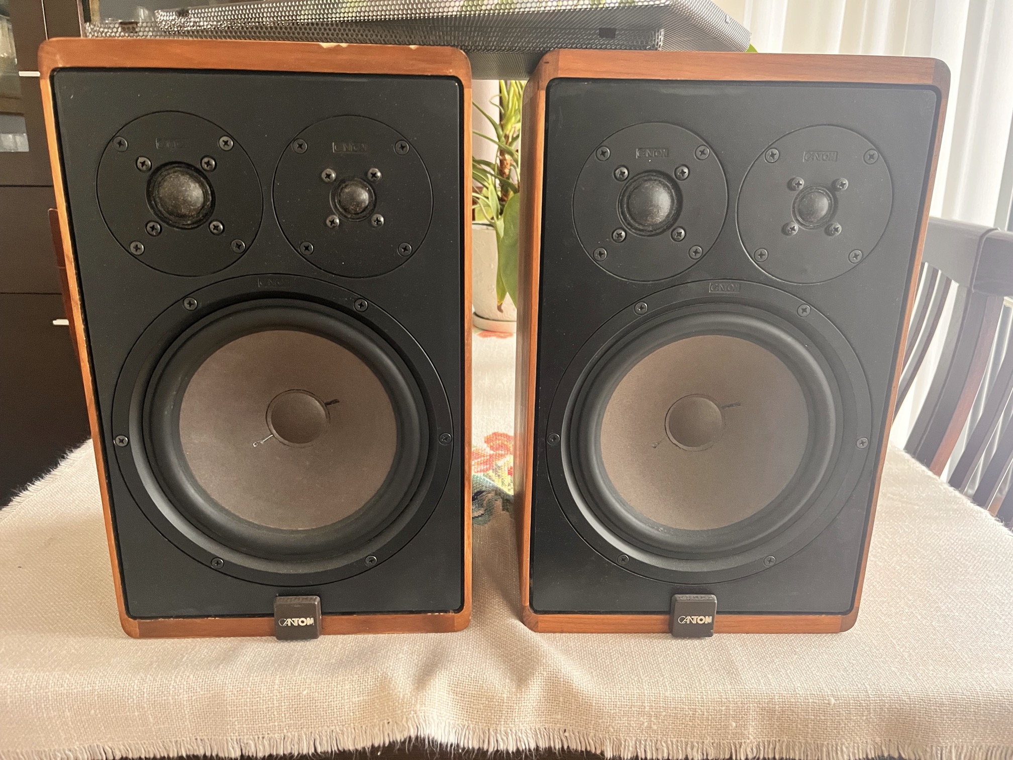 2) Canton Quinto 520 - przez kilka lat grały w drugim zestawie, głównie umilając pracę w formule home-office. ze względu na gabaryty (znacząco zmniejszały przestrzeń roboczą biurka) oraz na charakter grania w dość małym i zabudowanym pomieszczeniu zamieniłem je na ATL 304 i tak cantony poszukują nowego domu. kupiłem je dość sfatygowane, poszły do spa do Martynki - serwis zwrotnic oraz pudeł (szlif i lakier). nie wyglądają niestety jak milion dolarów (skrzynki wymagają trochę pracy żeby doprowadzić je do stanu salonowego), ale technicznie są bez zarzutu: