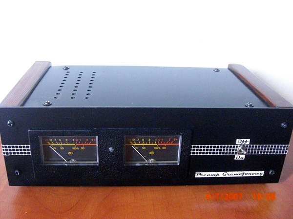 Sprzedam moją kolejną konstrukcję jaką jest przedwzmacniacz lampowy RIAA do gramofonu z wkładką MM (magnetoelektryczna) na dwóch lampach E88CC gold pin. Preamp charakteryzuje się dużym wzmocnieniem, ciepłym lampowym dżwiękiem, poprawia niskie tony,dynamikę. Bije na głowę przedwzmacniacze tranzystorowe. Obudowa aluminiowa ,pomalowana na czarno, boczki drewniane -kolor machoń (lakierobejca). Wskaźniki analogowe podłoczone do sygnału wyjściowego preampa. Świetnie się prezentuje no i gra wyśmienicie, o wiele lepiej wygląda na żywo, zdjęcia słabej jakości. Podłącza się go między gramofon a wzmacniacz lampowy lub tranzystorowy (współpracuje z każdym typem wzmacniacza). Zachęcam do kupna bo naprawdę warto. Cena 550zł do negocjacji, rozważę każdą ofertę. W razie pytań i propozycji cen podaje GG:2906155 lub email artek87@o2.pl (preamp wystawiony również w innym mediach).