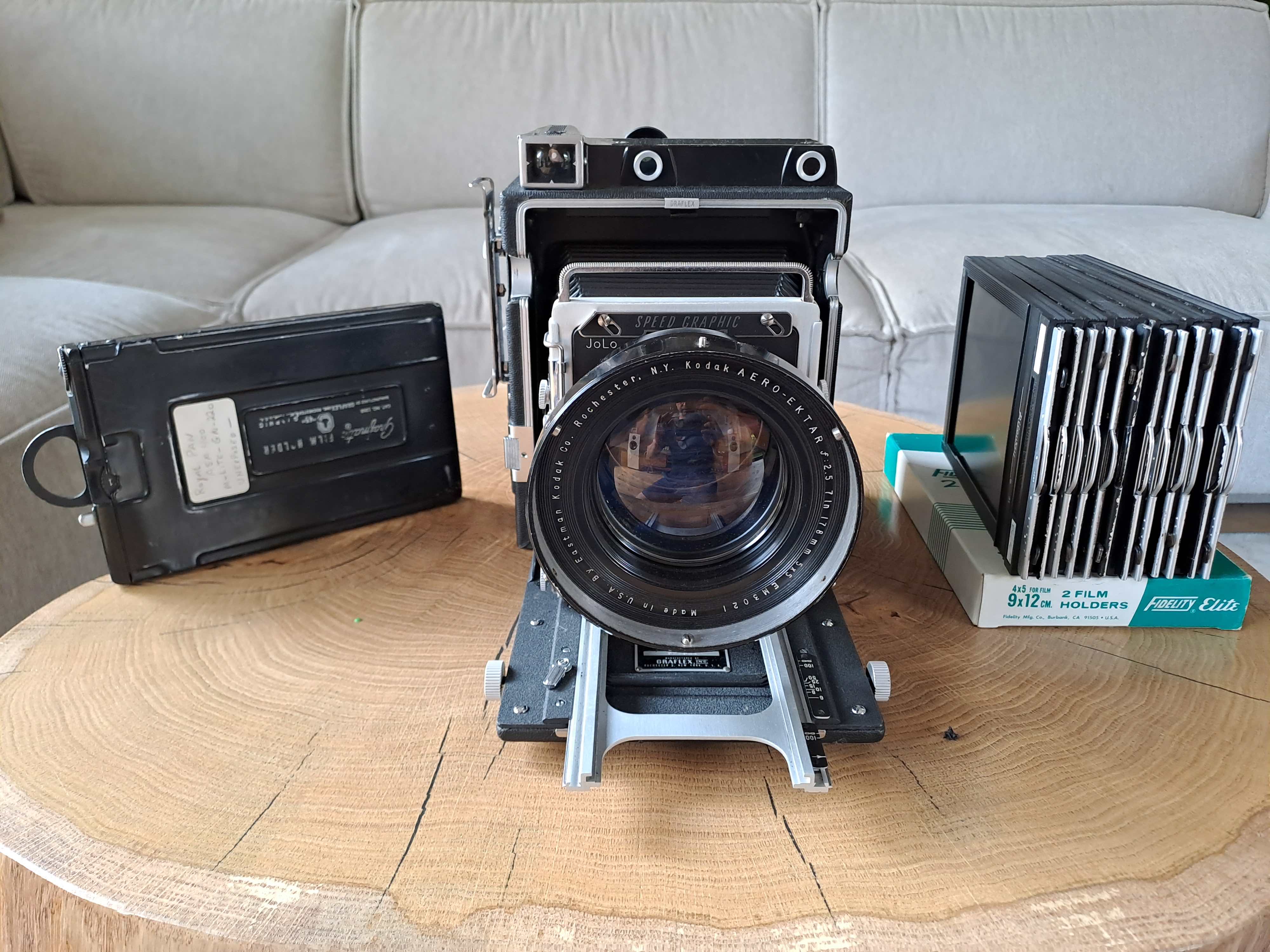 Oryginalna skrzynia na Graflex, z oryginalną lampą błyskową (szczególnie chętnie przerabiana przez fanów gwiezdnych wojen na miecz świetlny) oraz żarówki dedykowane do lampy.