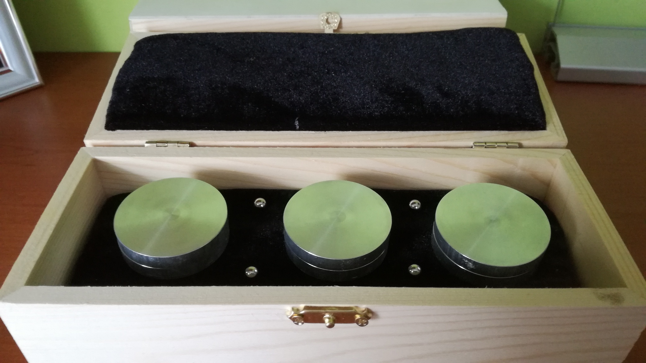 Komplet składa się z trzech zespołów rozdzielonych kulkami stalowymi (6 krążków - 3 podstawy, 3 przykrywki oraz 4 kulek stalowych - 1 kulka jako zapas w razie utraty/zagubienia).