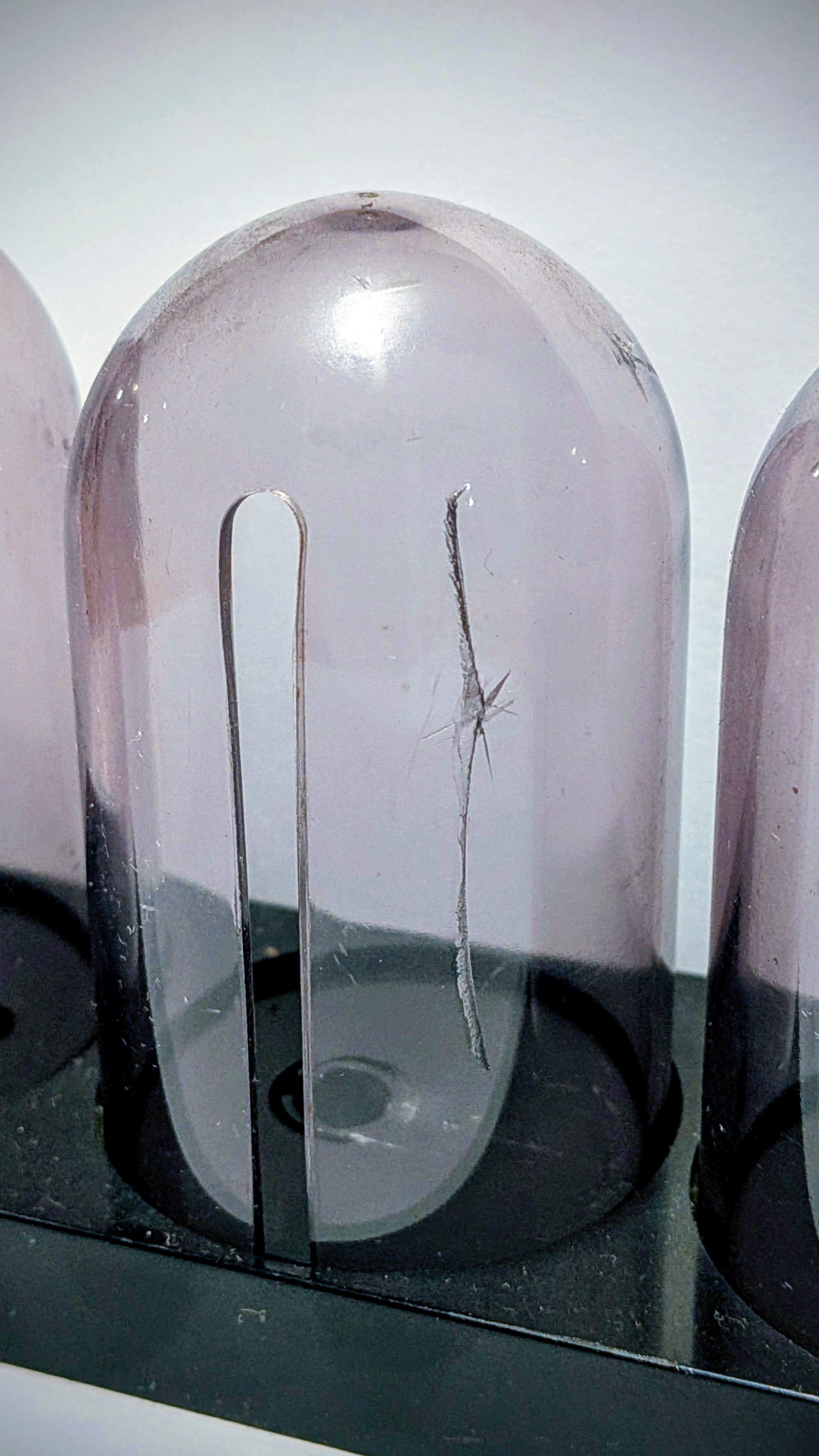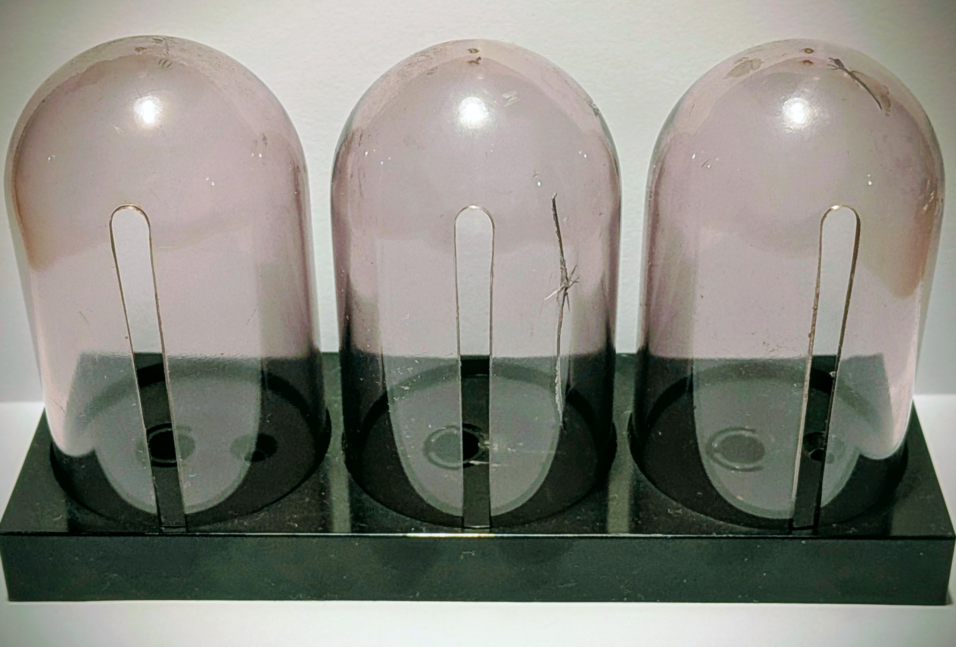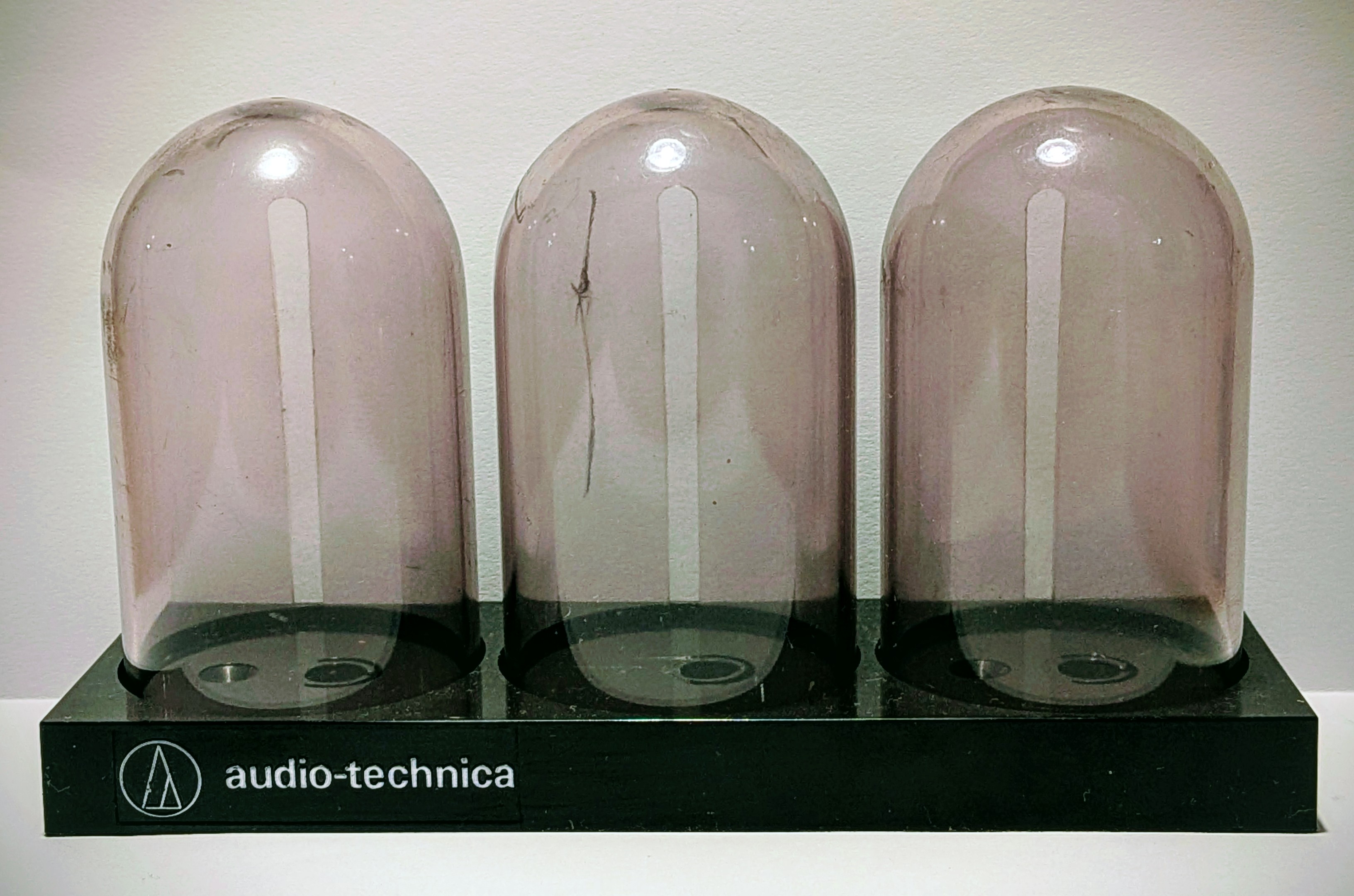 Pudełko na wkładki Audio Technica (3 sloty). Stan dostateczny. Długie pęknięcie na jednej kopułce, małe na drugiej (zdjęcia) - bez wpływu na użytkowanie.