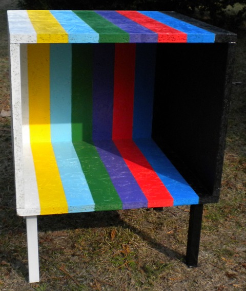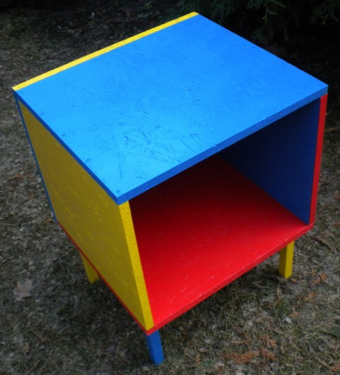 W tym przypadku prosty sześcian z płyty, z jednym otworem + nogi.