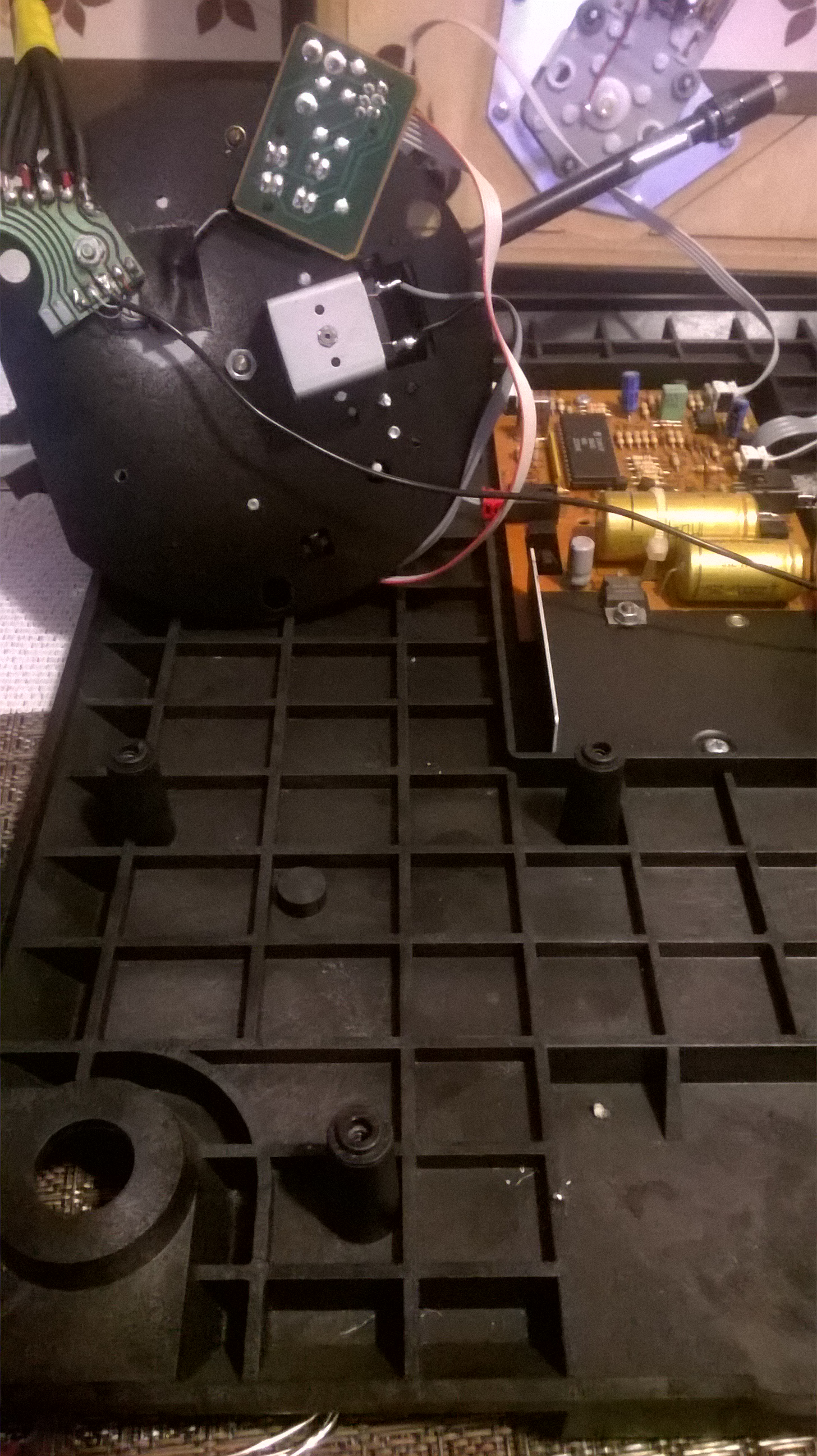 Dziś przy okazji wymiany kabelka sygnałowego w moim Dualu 750 mając wgląd do środka, zrobiłem przymiarki, szablony pod kątem aplikacji do niego Jelco 750d. Odkręcone trzy śrubki, wypięte dwie kostki i oryginalne ramie już zdjęte. Na miejsce poprzednika przykręciłem szablon z kartonu, naniosłem punkty mocowań, otworów montażowych i wszystko pasuje. Jeśli zastosuję jakiś kątowy, zamiast oryginalnego, prostego wtyku Jelco pod ramię to obejdzie się nawet bez otworu w spodniej płycie plinty, tak, że kompletnie bez dewastacji gramofonu.