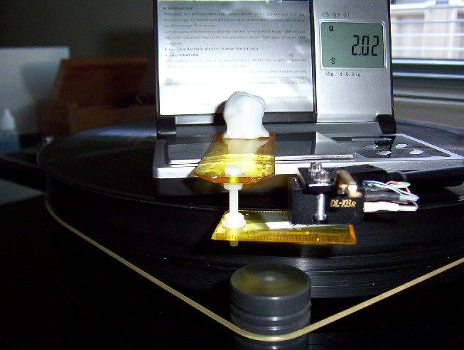 staram się wyważyć ramię na zero, ustawiam za pomocą pokrętła nacisk na 1,5 i sprawdzam na igle czy jest ok, jeśli nie to staram się ustawić tak ciężarek aby było ok.