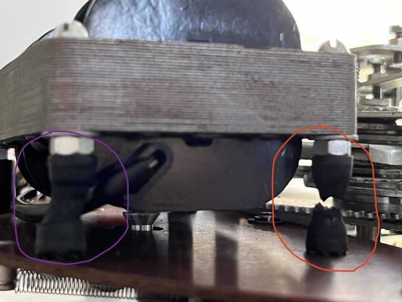 Jedna jest pęknięta a dwie poskręcane i tylko jedna (kolor zielony) wyglada na dobrą. Wygląda też na to, że z racji różnej wysokości cały silnik był nie do końca równy w pionie, ale tego nie jestem jeszcze pewien. Na pewno na zdjęciu wyglada to nieciekawie. Dodam, że między silnikiem a nakrętką wtopioną w gumę jest jeszcze dodatkowa nakrętka z podkładką.