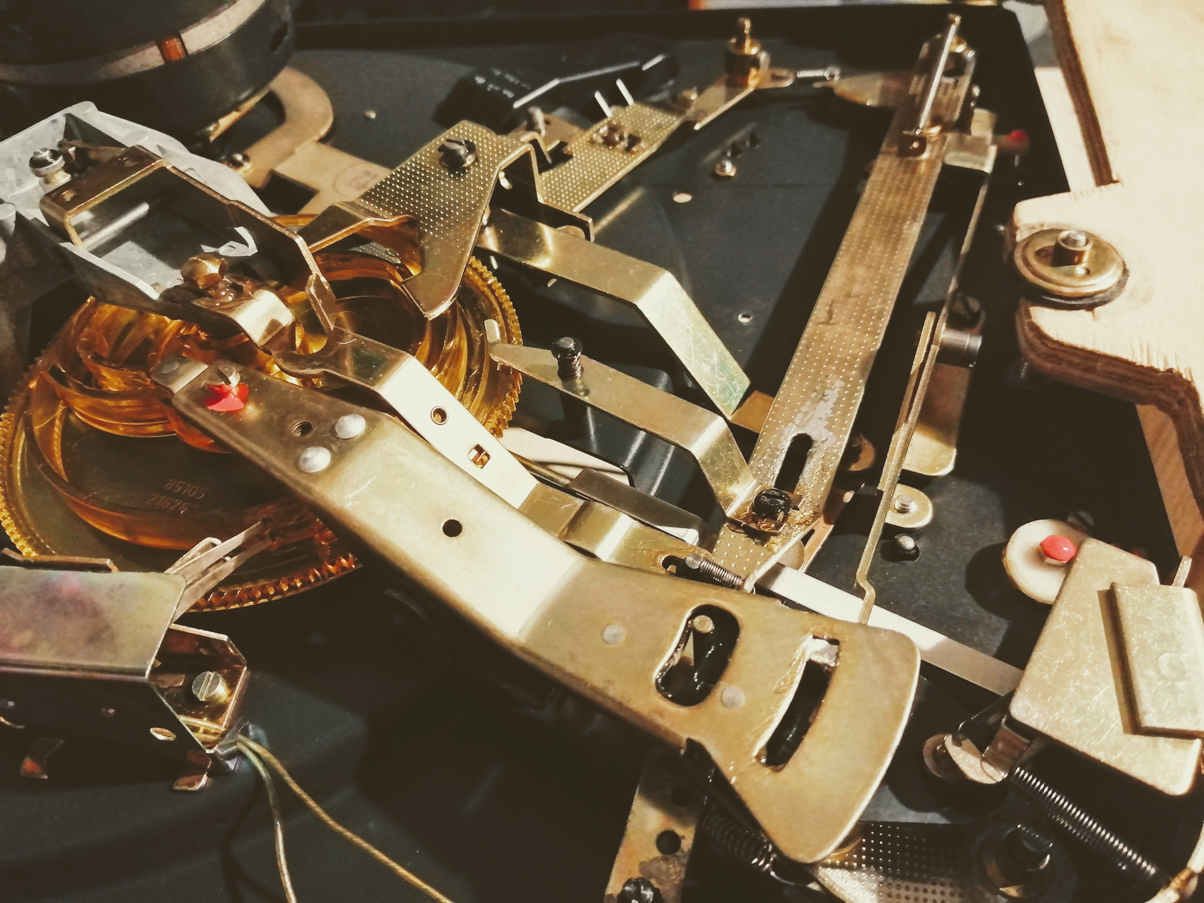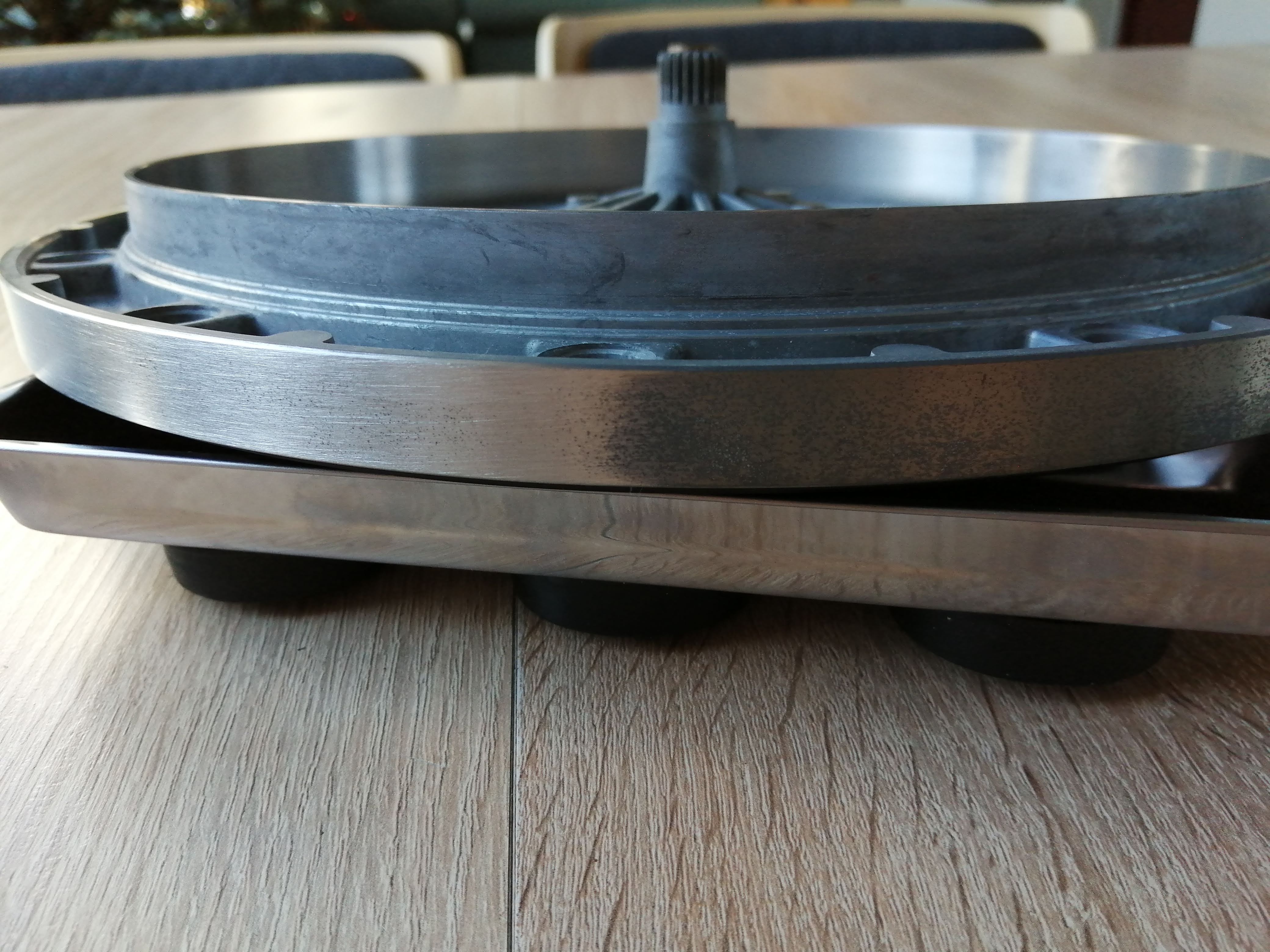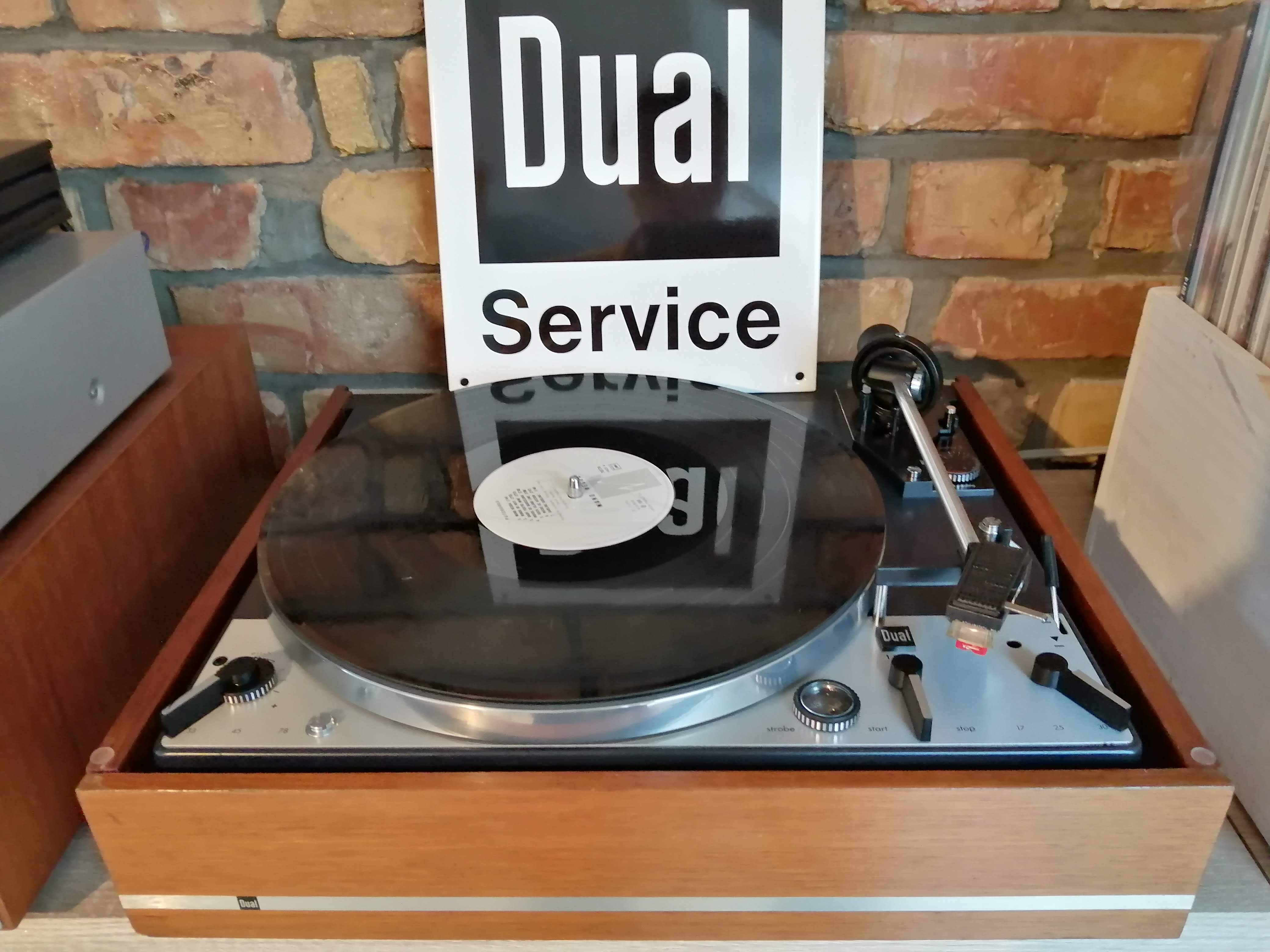 Stał u mnie ze 2 lata. Bez obudowy. Z biegiem czasu służył jako mały dawca części. A to podebrałem lamkę strobo, a to szpic z łożyska ramienia bo był potrzebny w innym Dualu, a to szpindel, bo w jakimś serwisowanym Dualu nie było. Dodatkowo pęknięta tarcza antyskatingu. W końcu skompletowałem brakujące części i zabrałem się za remont ;) Dobrałem obudowę, zapyziały talerz wypolerowałem i w końcu gra :)