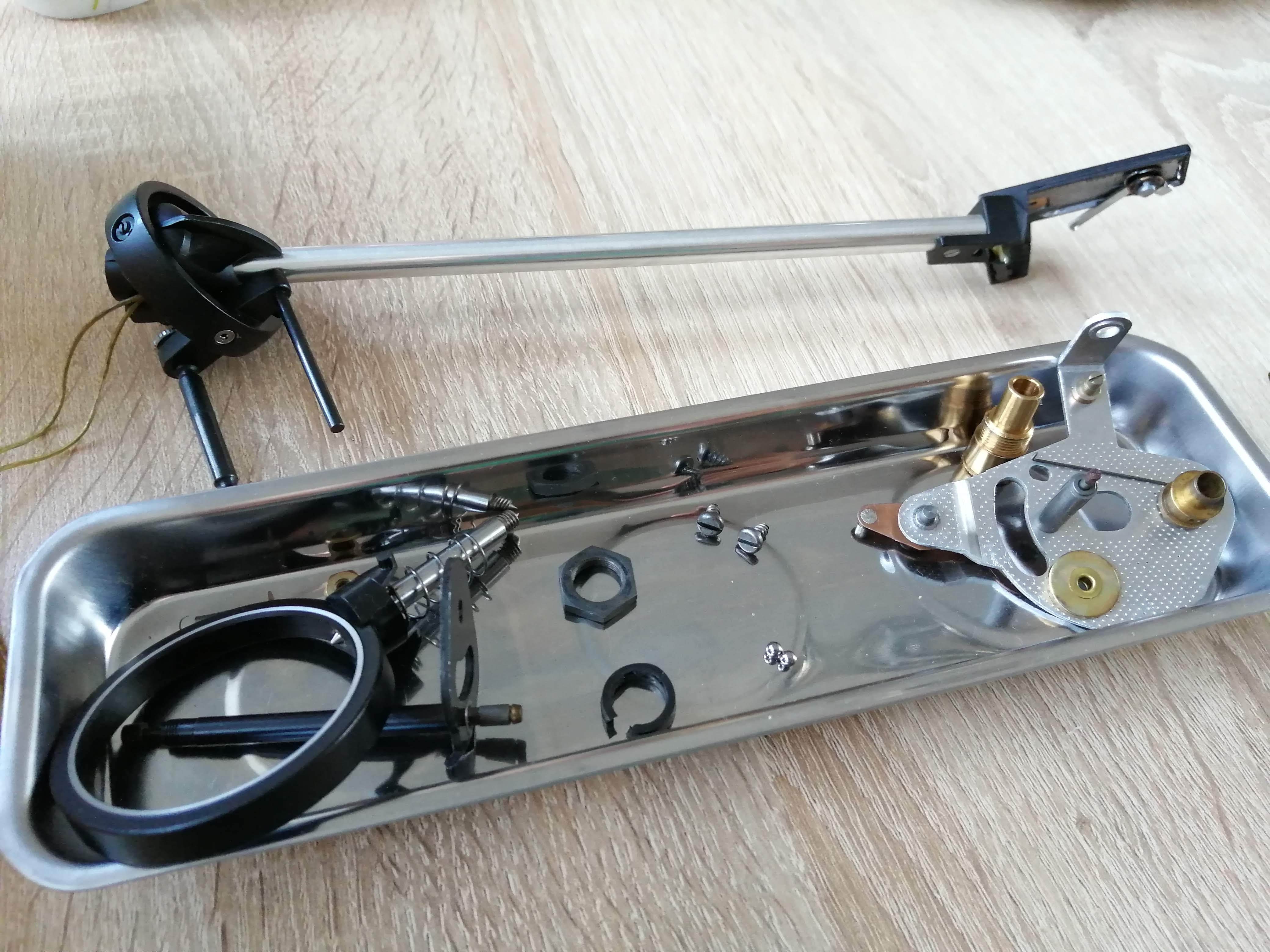 Ważny jest punkt zerowy, który wyznacza ta dziurka w kółku. Oryginalnie w serwisie mieli do tego przyrząd, który to ustawia. Ja zrobiłem pomiary i posiłkowałem się zdjęciami oraz sprawdzałem na żywo w drugim egzemplarzu pozycję zerową. Jak już skręciłem i zalakowałem lakierem, to poluzowałem lekko łożysko ramienia i ustawiłem ostatecznie AS. Na koniec korekta łożyska ramienia. Później jeszcze płytą testową sobie sprawdzam.