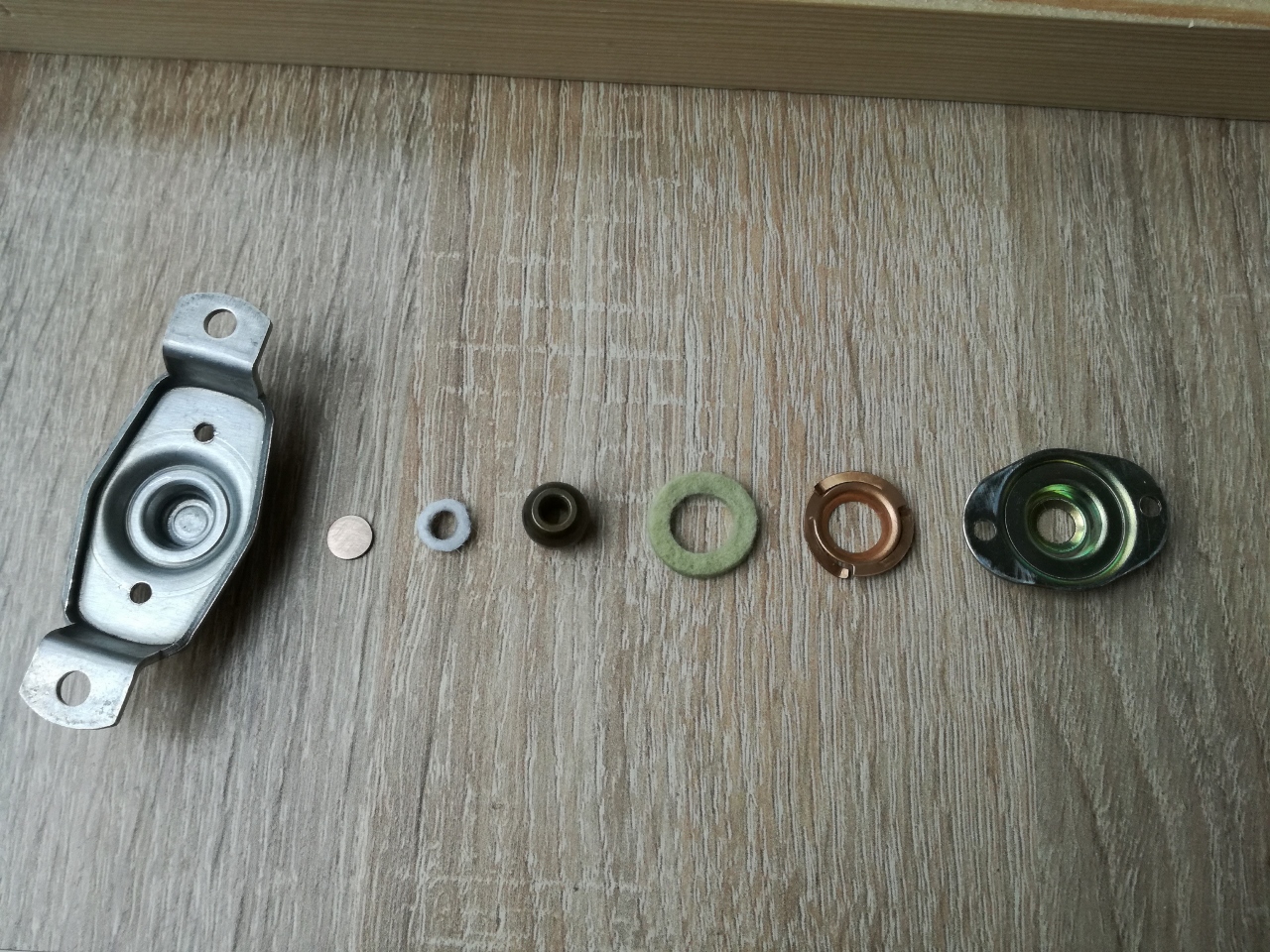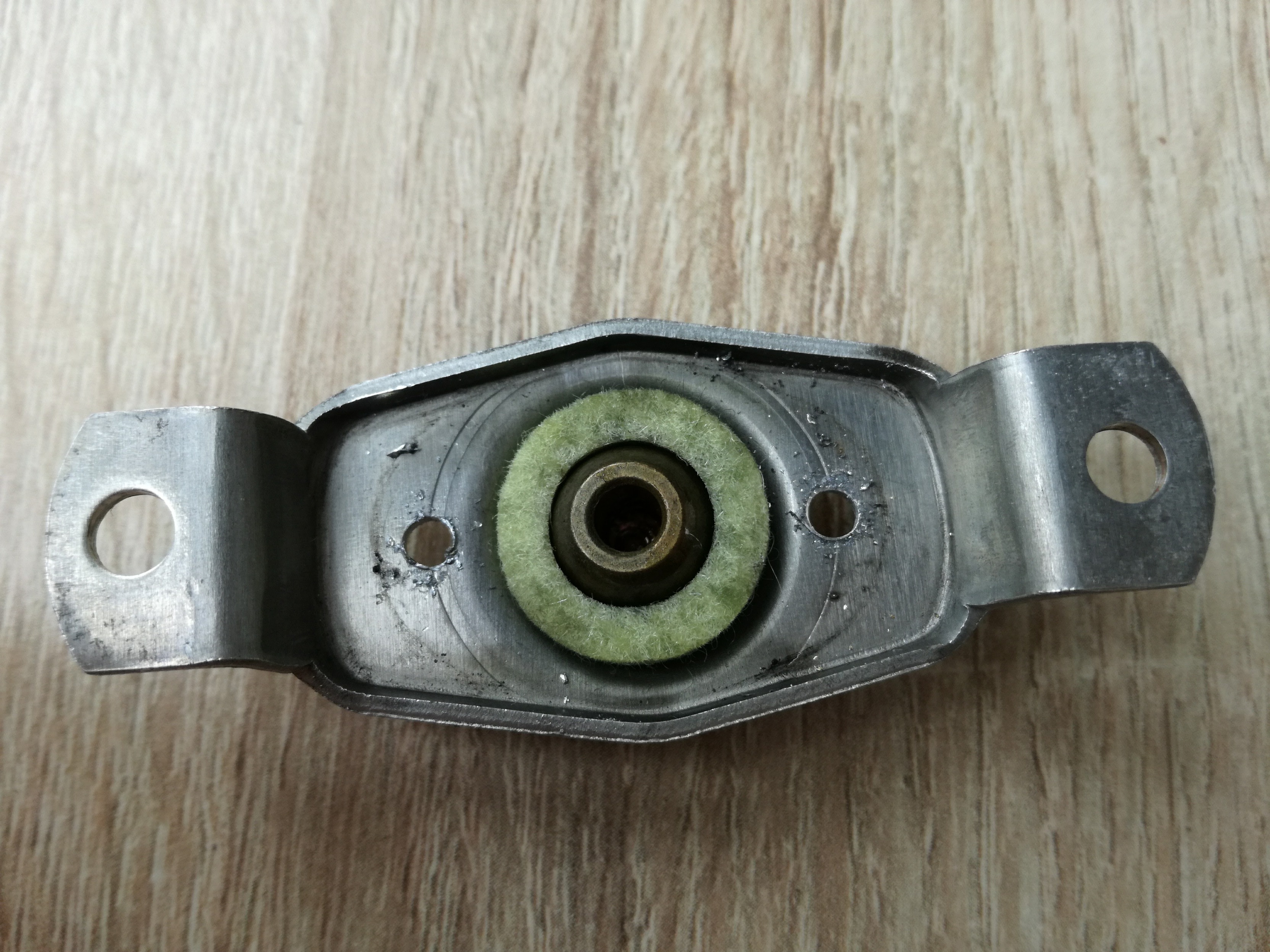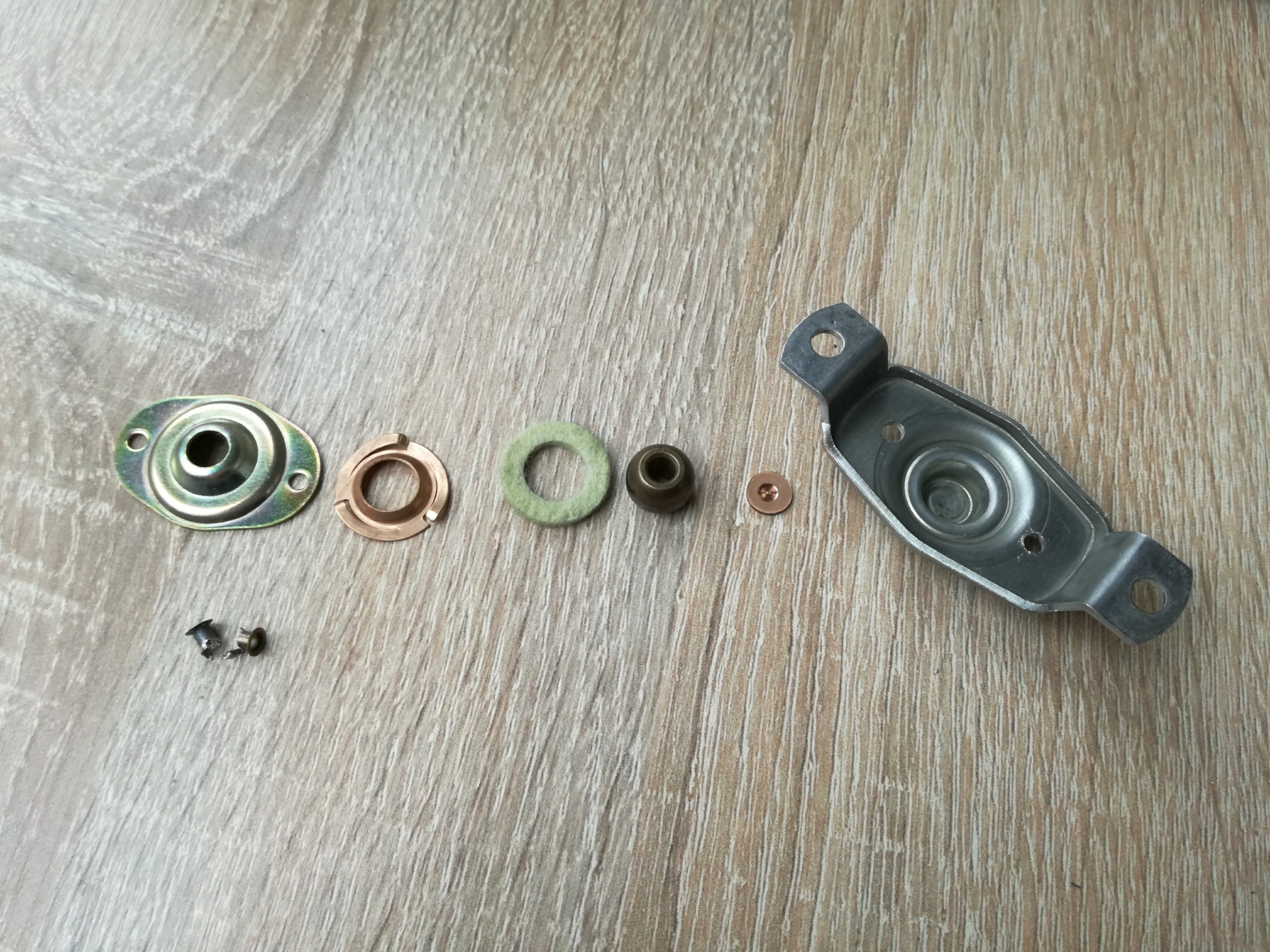 Trochę musiałem pokombinować żeby dorobić podkładkę z gąbki, która ze starości się rozpuściła. Podobno spotykane były podkładki z gąbki ale też filcowe. Zdecydowałem się zrobić z filcu. Próbowałem robić też z pianki. W domu mam jeszcze jakiś materiał gąbczasty, który powinien się nadać, więc do kolejnego silnika zrobię z gąbki i zobaczę co lepsze.