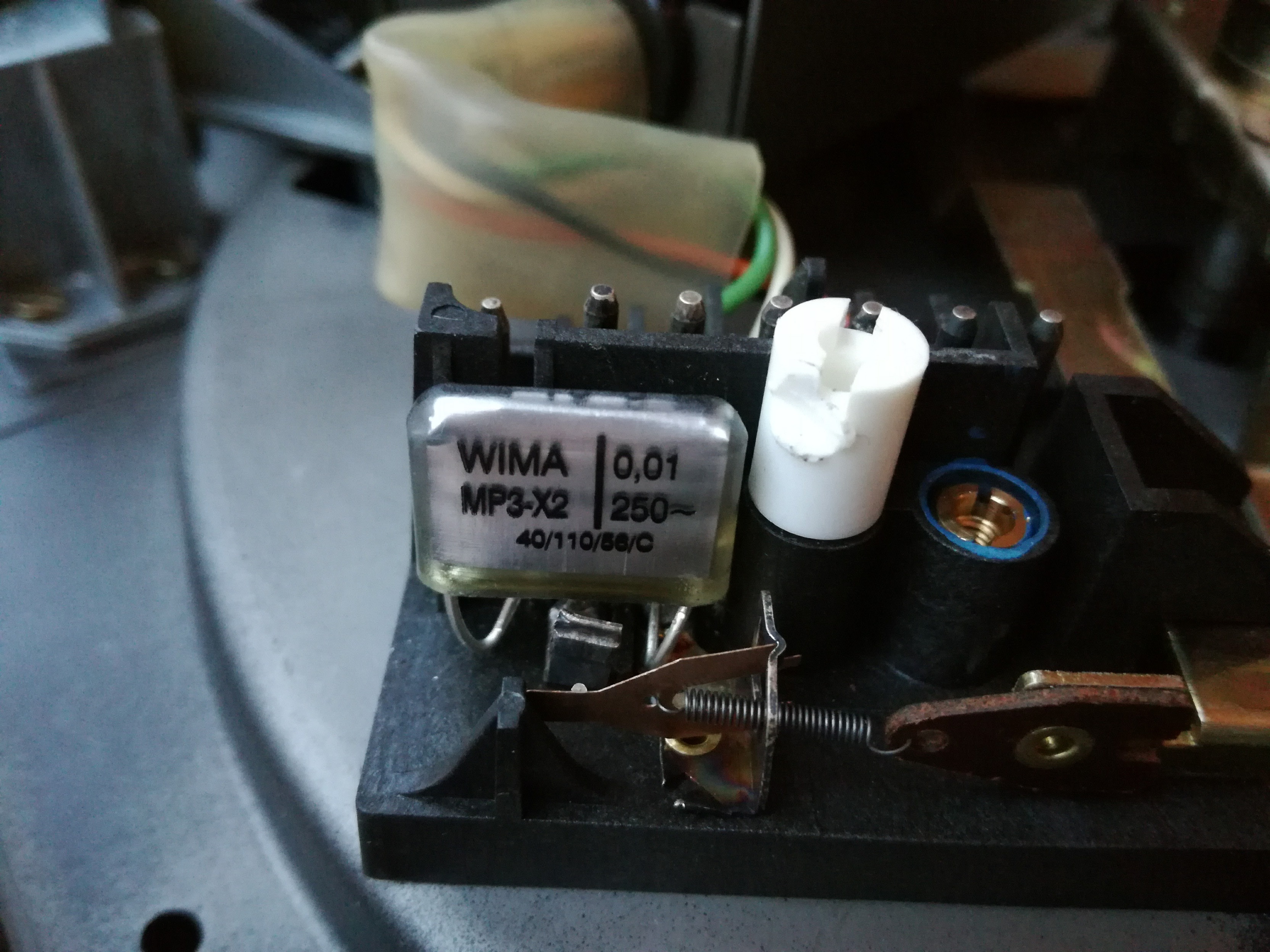 Wszystko wyczyszczone i nasmarowane ale silnik nadal kręci od razu po włożeniu wtyczki do gniazdka. Przejrzałem i wyregulowałem mechanizm odpowiadający za auto-stop. Sam mechanizm działa i powinien wyłączać silnik ale tak się nie dzieje. Winowajcą takiego stanu rzeczy okazał się padnięty kondensator przeciwzakłóceniowy (specyfikacja widoczna na zdjęciu). Po odlutowaniu kondensatora problem od razu się rozwiązał-nawet nie trzeba wlutowywać nowego, aby sprawdzić czy to wina kondensatora. Wymieniłem na nowy. Ważne aby był klasy X2, czyli niepalny i bezpieczny dla użytkownika. Teraz silnik elegancko się wyłącza i nie kręci od razu po włożeniu wtyczki do gniazdka.