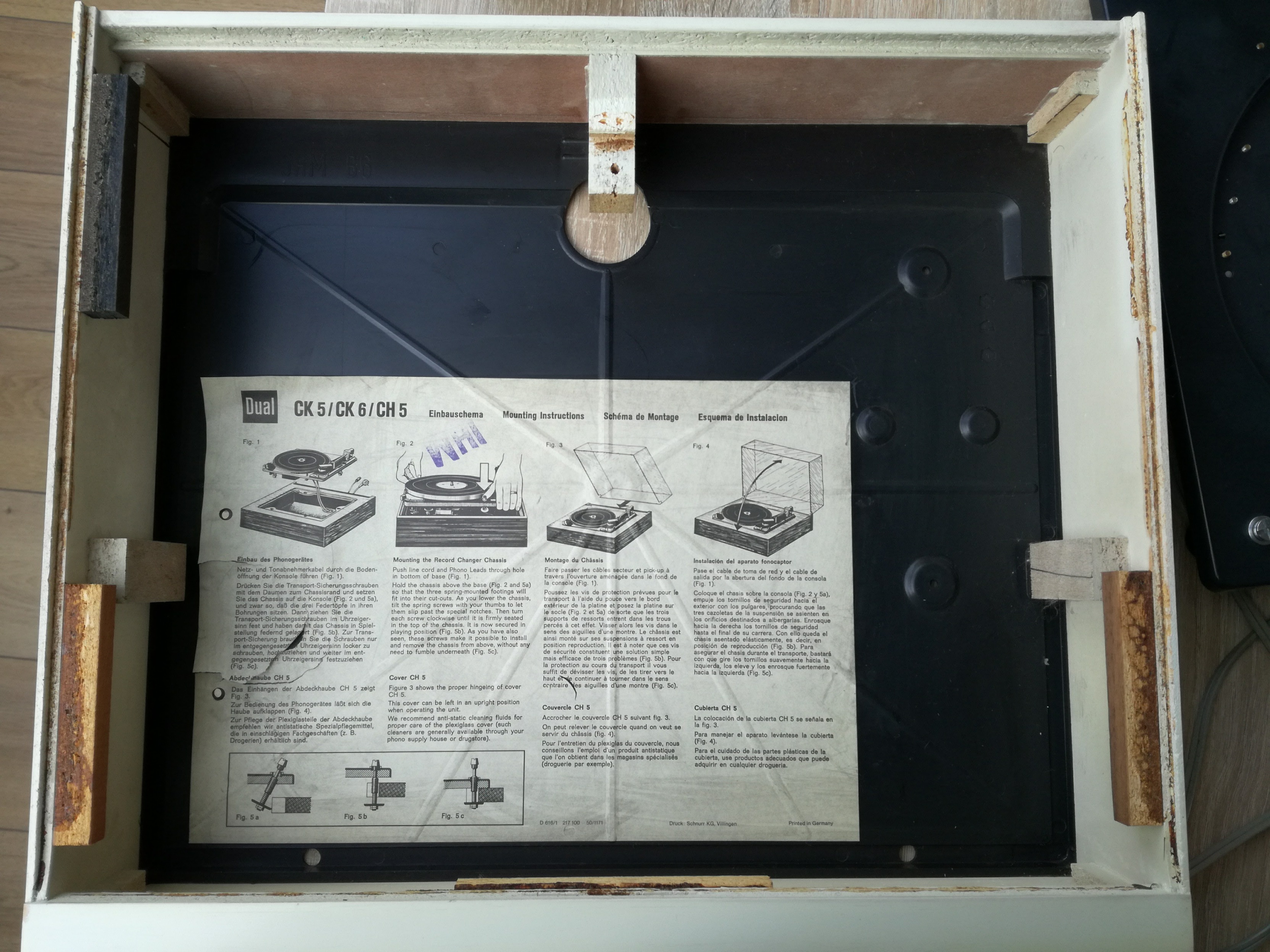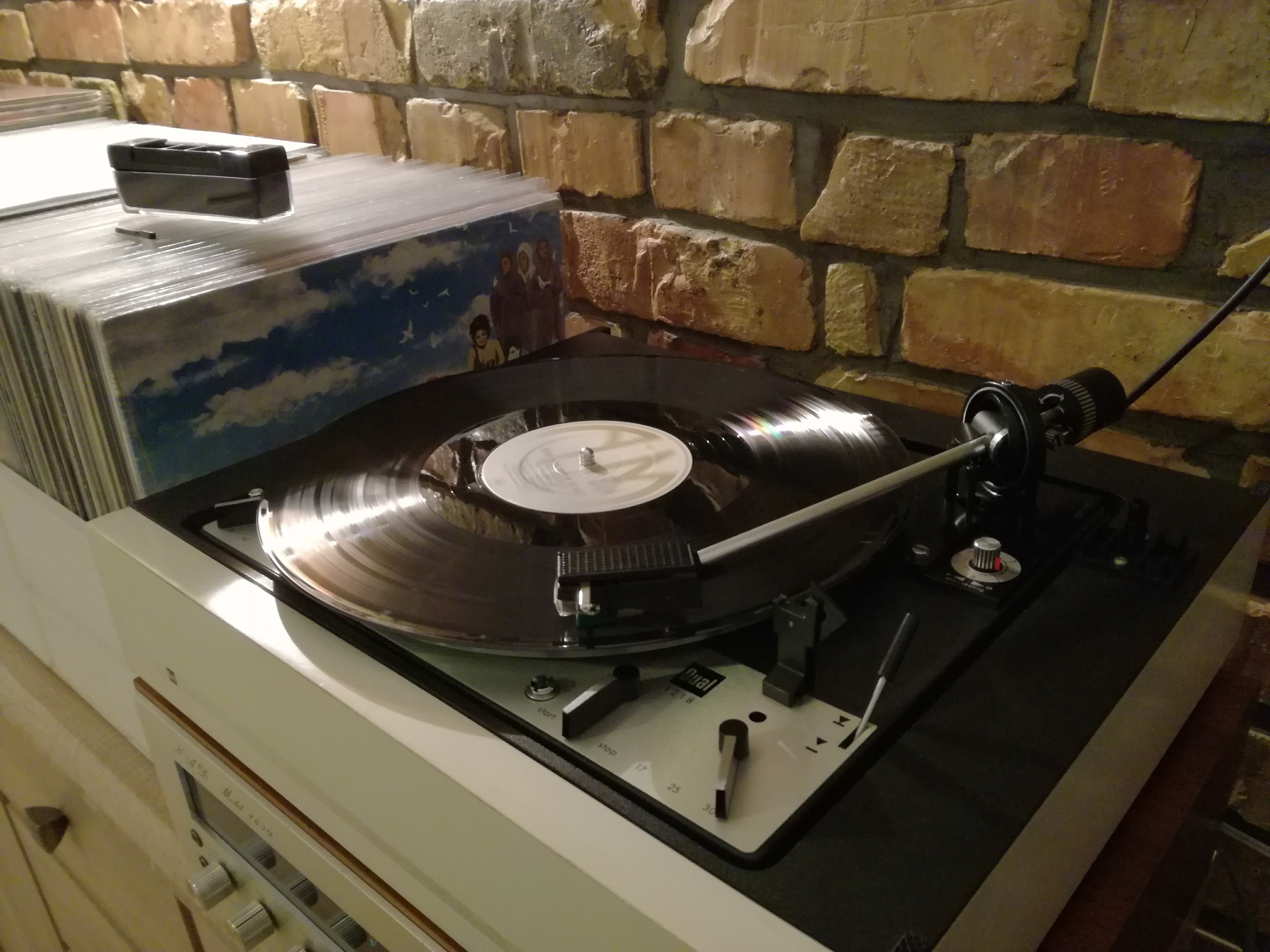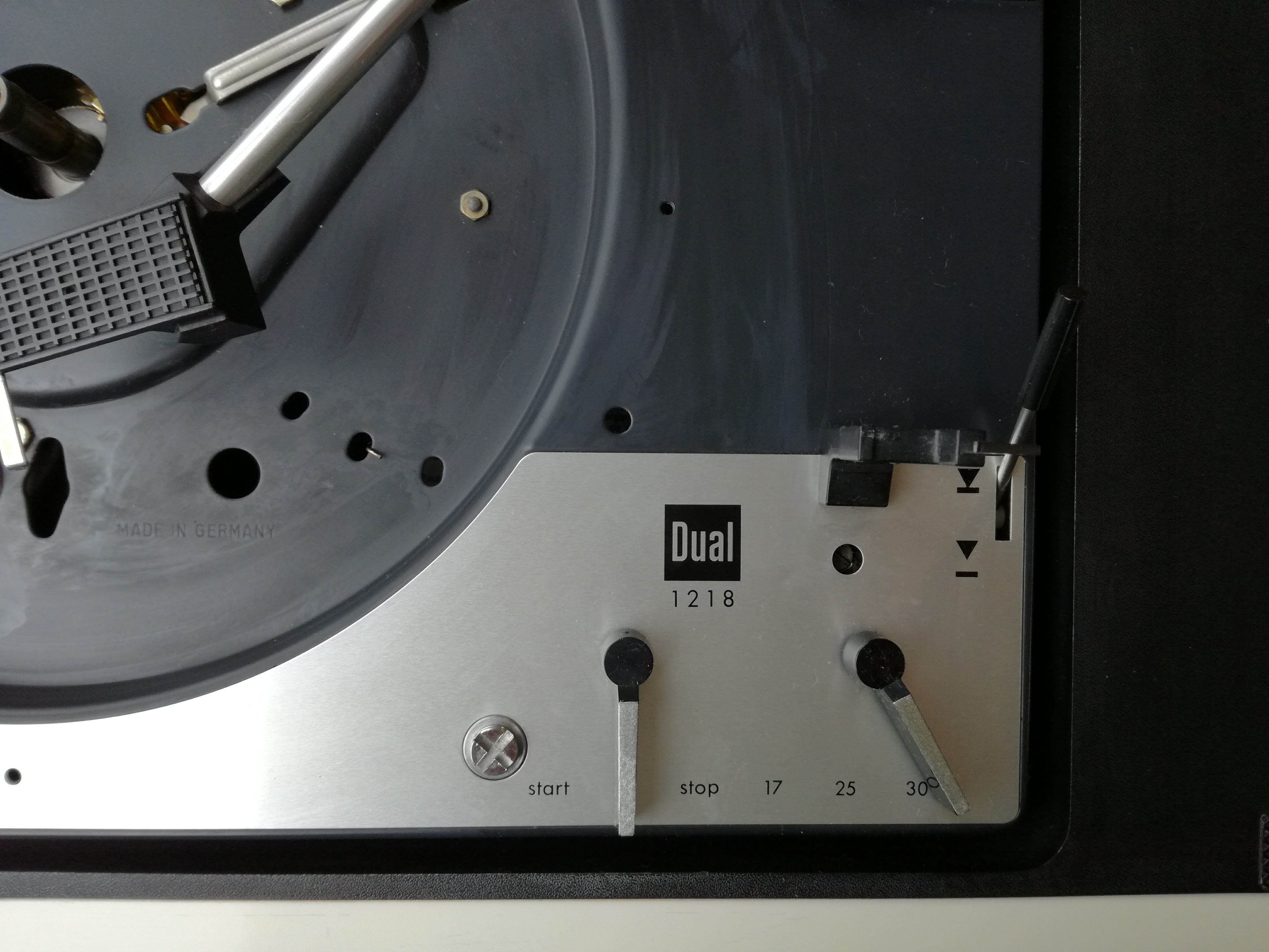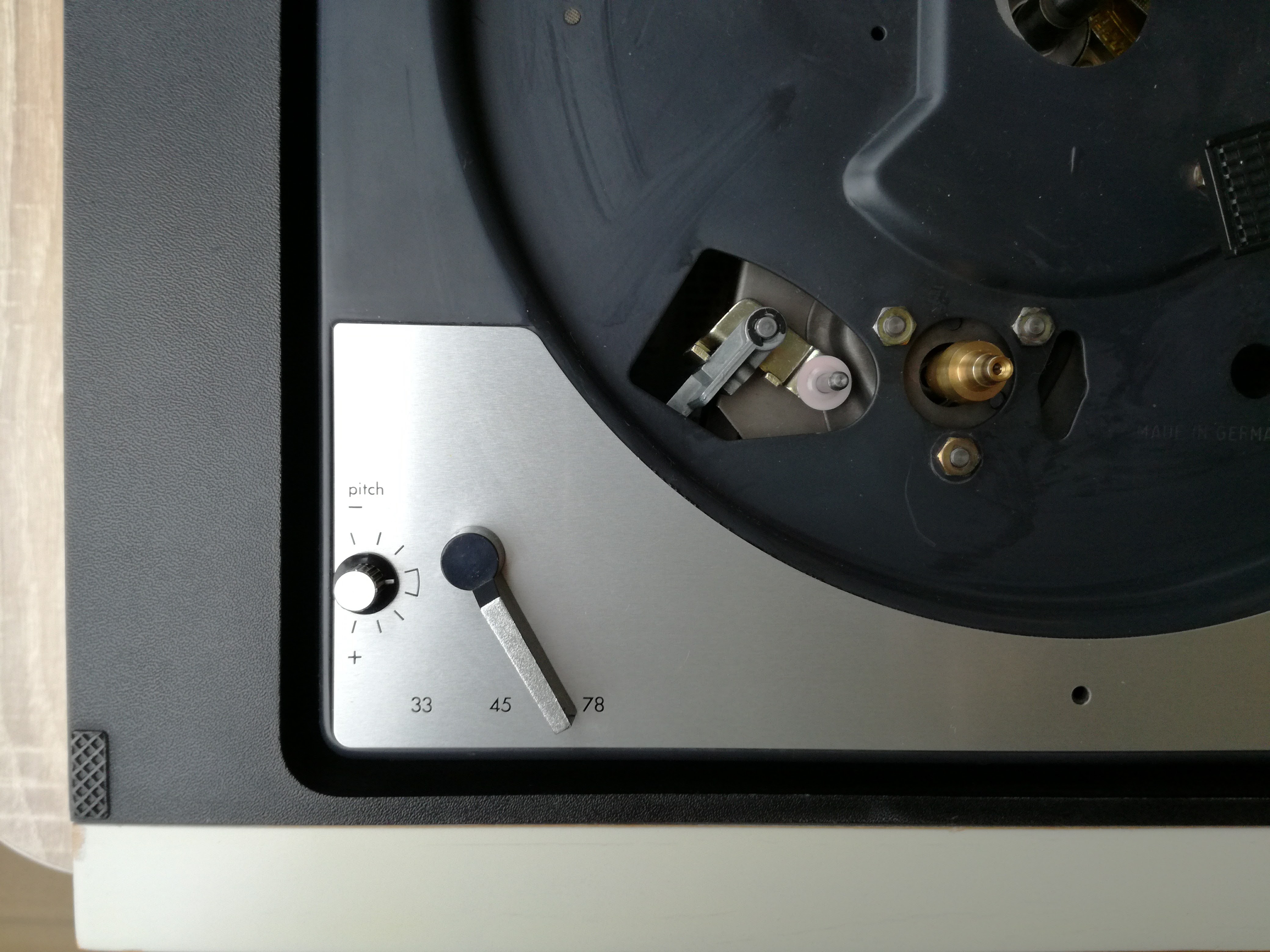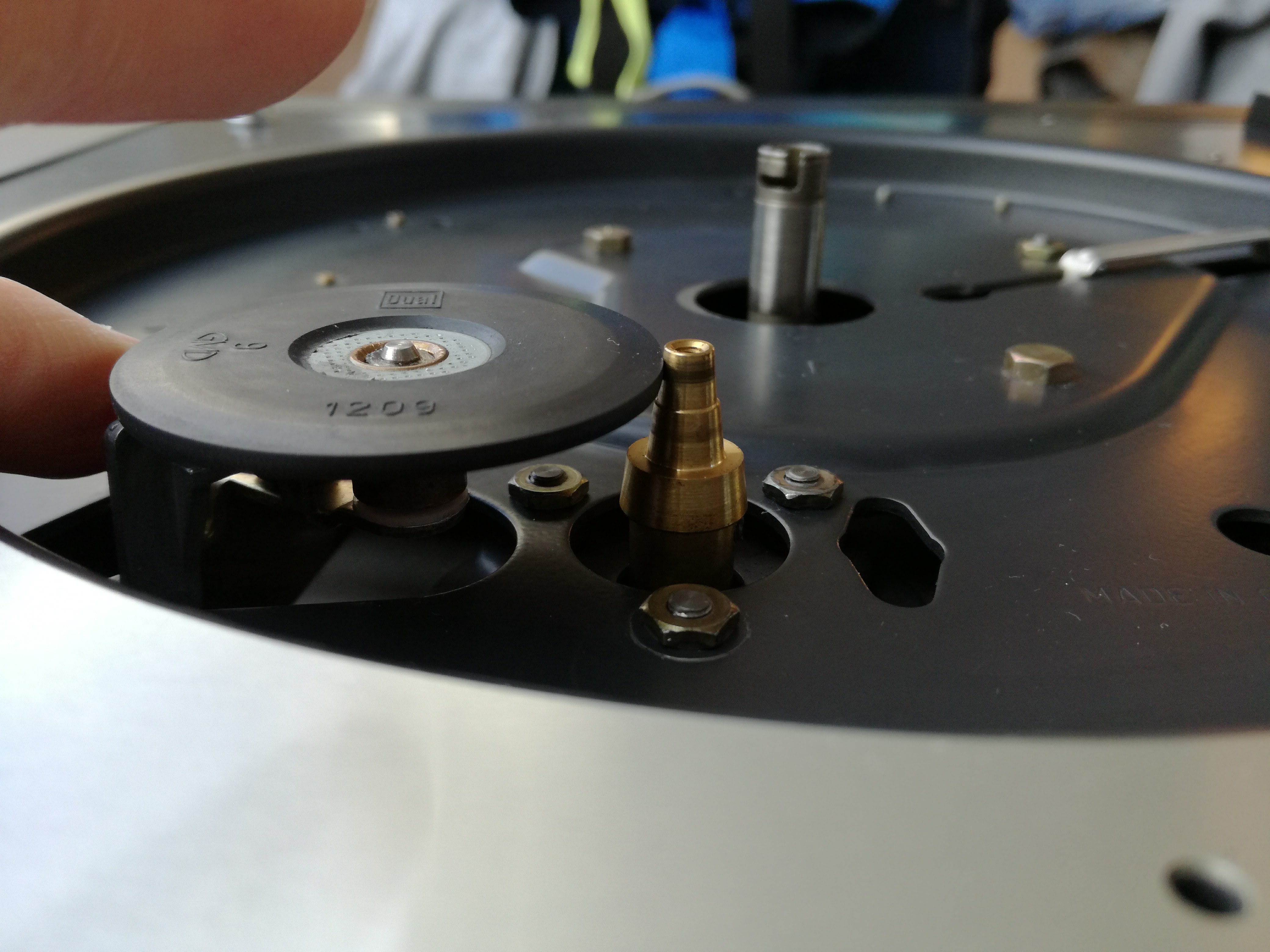 Udało mi się też wyregulować antyskating. Ramię już nie ucieka na zewnątrz. Wyszedł jeszcze jeden problem z funkcją zmieniarki. Po zrzuceniu drugiej w kolejności płyty, ramię nie dochodziło do rozbiegówki, tylko gdzieś do połowy między płytą a podpórką ramienia i wracało z powrotem na podpórkę. Musiałem zrobić krok w tył, rozebrać ponownie gramofon i zdemontować to czego wcześniej nie zrobiłem, czyli koło zębate (Kurvenrad). Działa