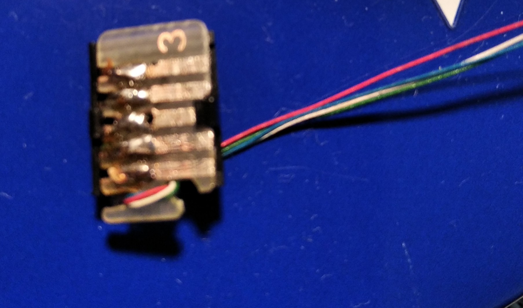 Ktoś coś mocno kombinował z okablowaniem ramienia. Porobione mostki i polutowane masy sygnałów. Zdziwiło mnie to. Normalnie powinno być 5 żył w osobnych przewodach. Osobny przewód z masą ramienia. Zaskoczyło mnie, że tutaj było starsze okablowanie, znane raczej z poprzedniej serii, czyli jeszcze 4 żyły. Ale na jednym zdjęciu poniżej jest chyba rozwiązanie zagadki, dlaczego ktoś tak to zrobił. Tak czy siak, wymieniłem całkowicie okablowanie ramienia i zrobiłem porządek.