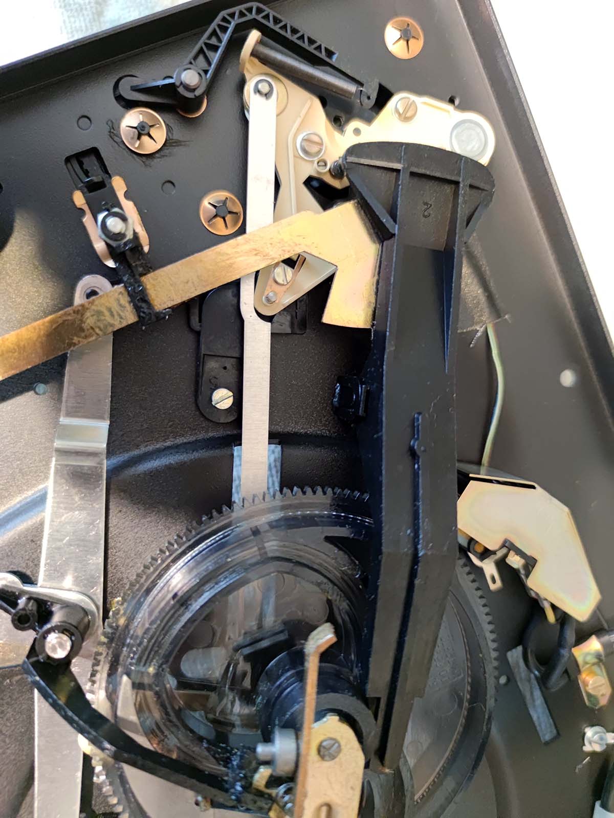 Popychacz "detektora" końca płyty powinien pracować na sucho. Smar w tym miejscu nie pomaga, powoduje dodatkowy opór przesuwu ramienia.