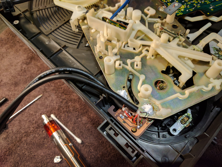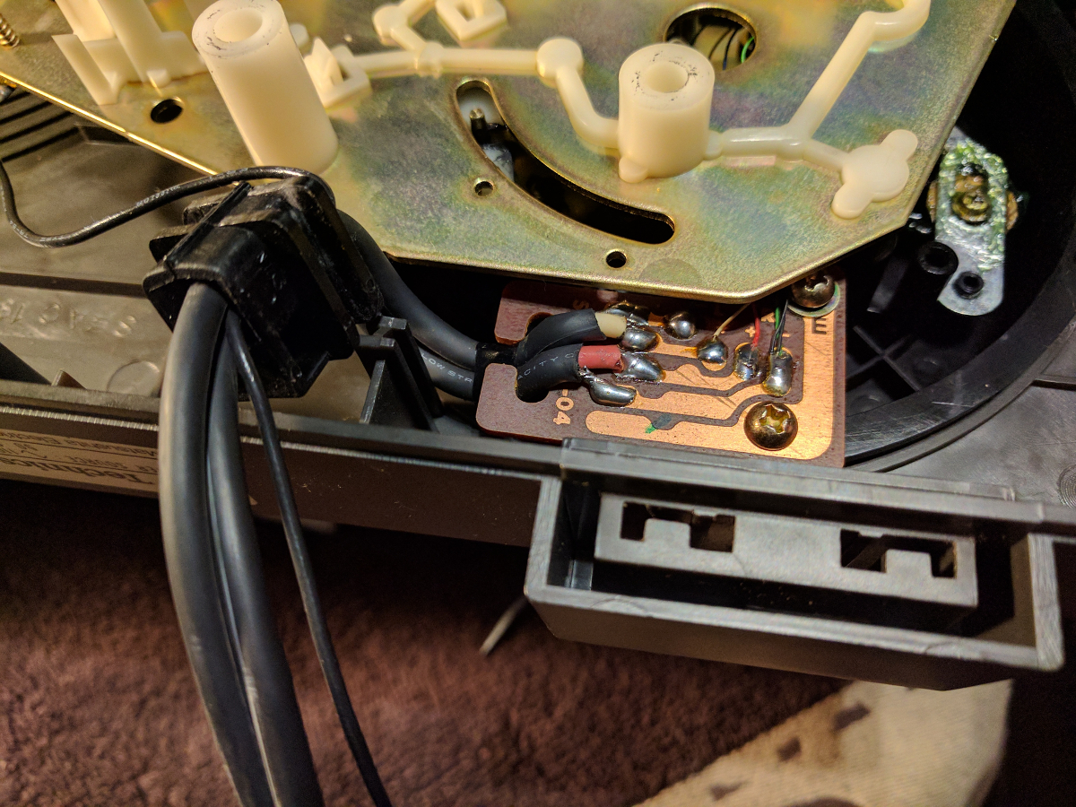 Myślę sobie... oryginalny kabel słaby? Myślałem że tak dobrych kabli jak kiedyś wrzucali, w obecnych czasach już się kupić nawet nie da. No ale miałem jeszcze trochę mikrofonowego i polutowałem sobie rozwiązanie opisane w temacie o Sabie (link wyżej, wyyyżej) i spierniczyłem całe feng szui wewnątrz gramofonu.