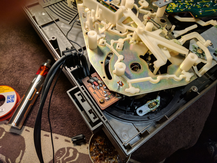 Myślę sobie... oryginalny kabel słaby? Myślałem że tak dobrych kabli jak kiedyś wrzucali, w obecnych czasach już się kupić nawet nie da. No ale miałem jeszcze trochę mikrofonowego i polutowałem sobie rozwiązanie opisane w temacie o Sabie (link wyżej, wyyyżej) i spierniczyłem całe feng szui wewnątrz gramofonu.