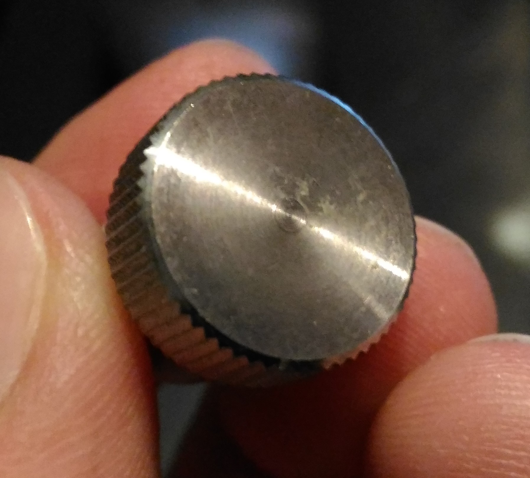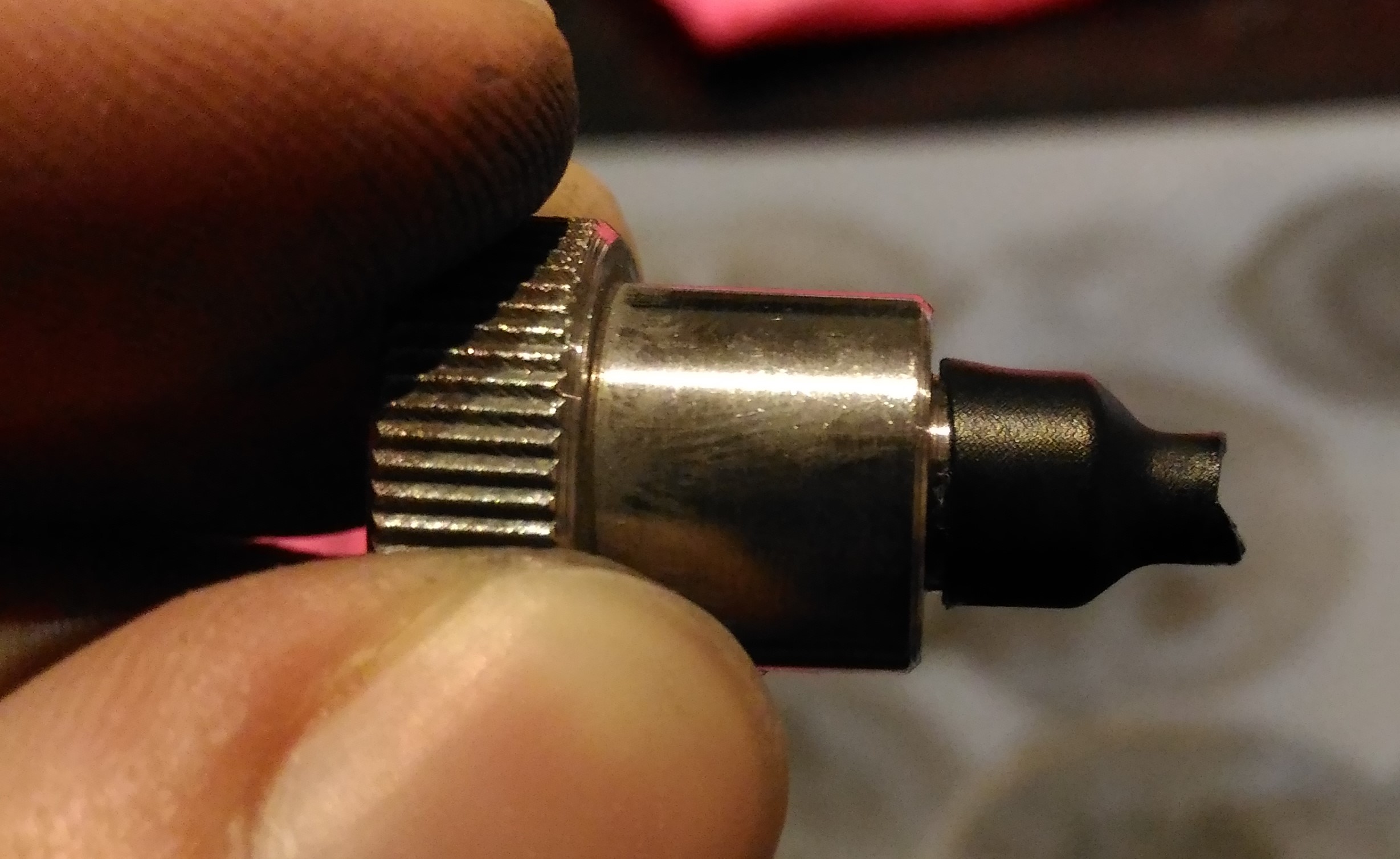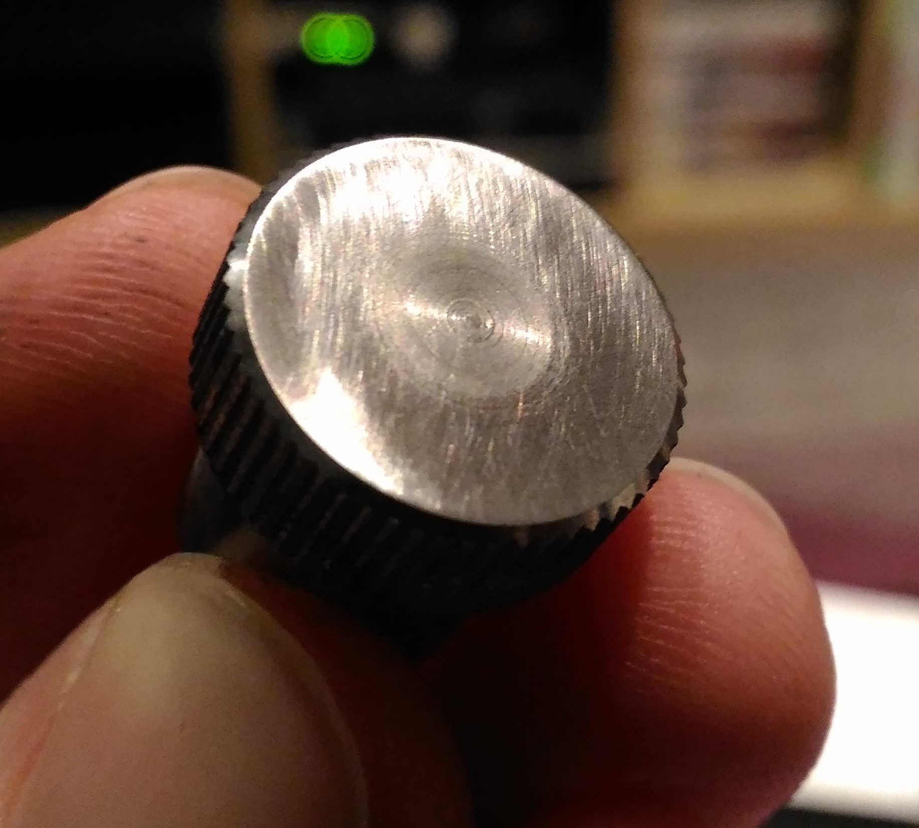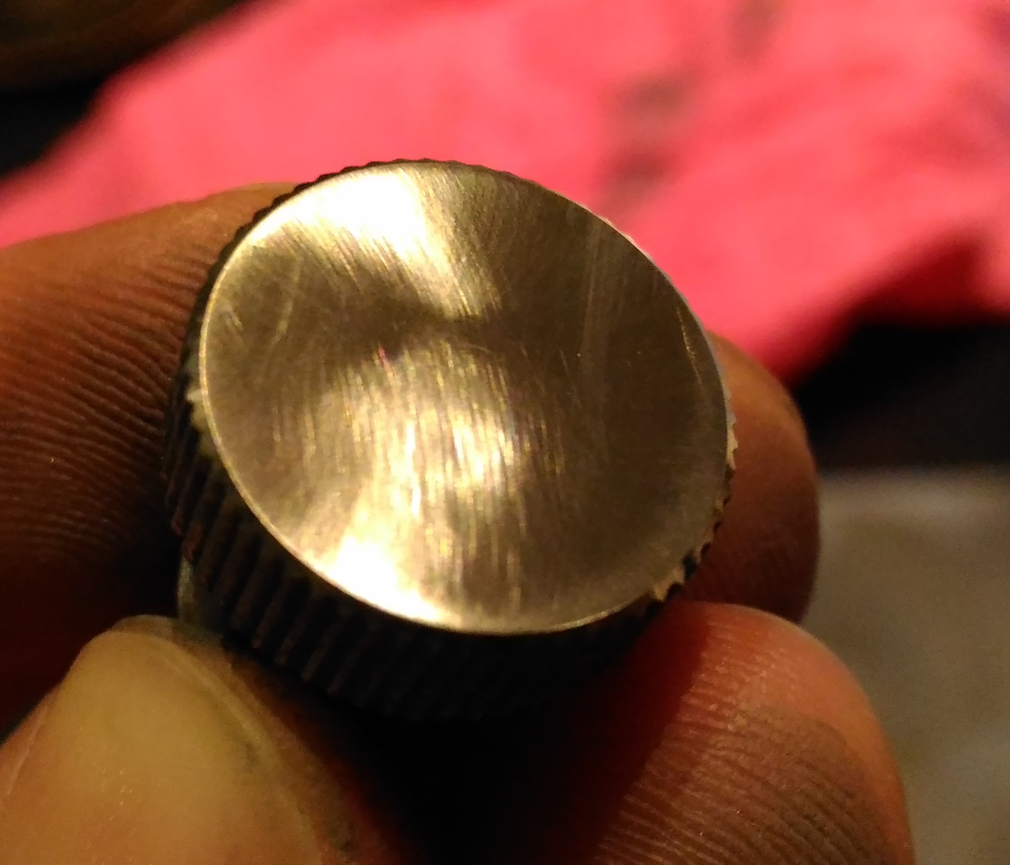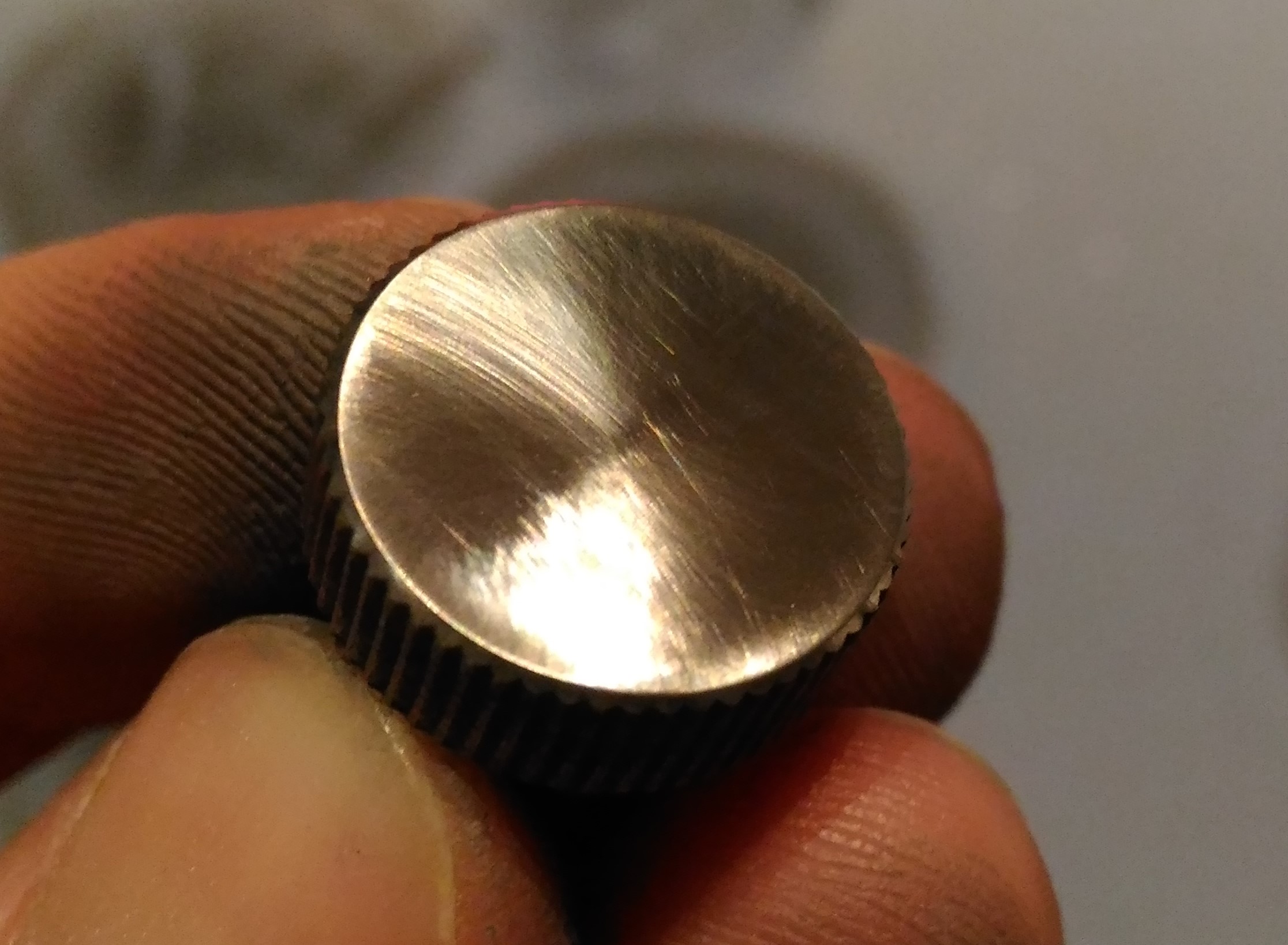 4. Jedziemy z 2000. I tu trochę mniej pracy, bo to już tylko wygłaskanie powierzchni. Nie martwcie się ryskami - już mi się ich nie chciało niwelować, a i tak są widoczne wyłącznie pod światło: 5. Zakładamy pacjentowi czapeczkę z termokurczki: 6. Instalujemy gamonia w głowicy wiertarki, obroty załóżmy... średnie