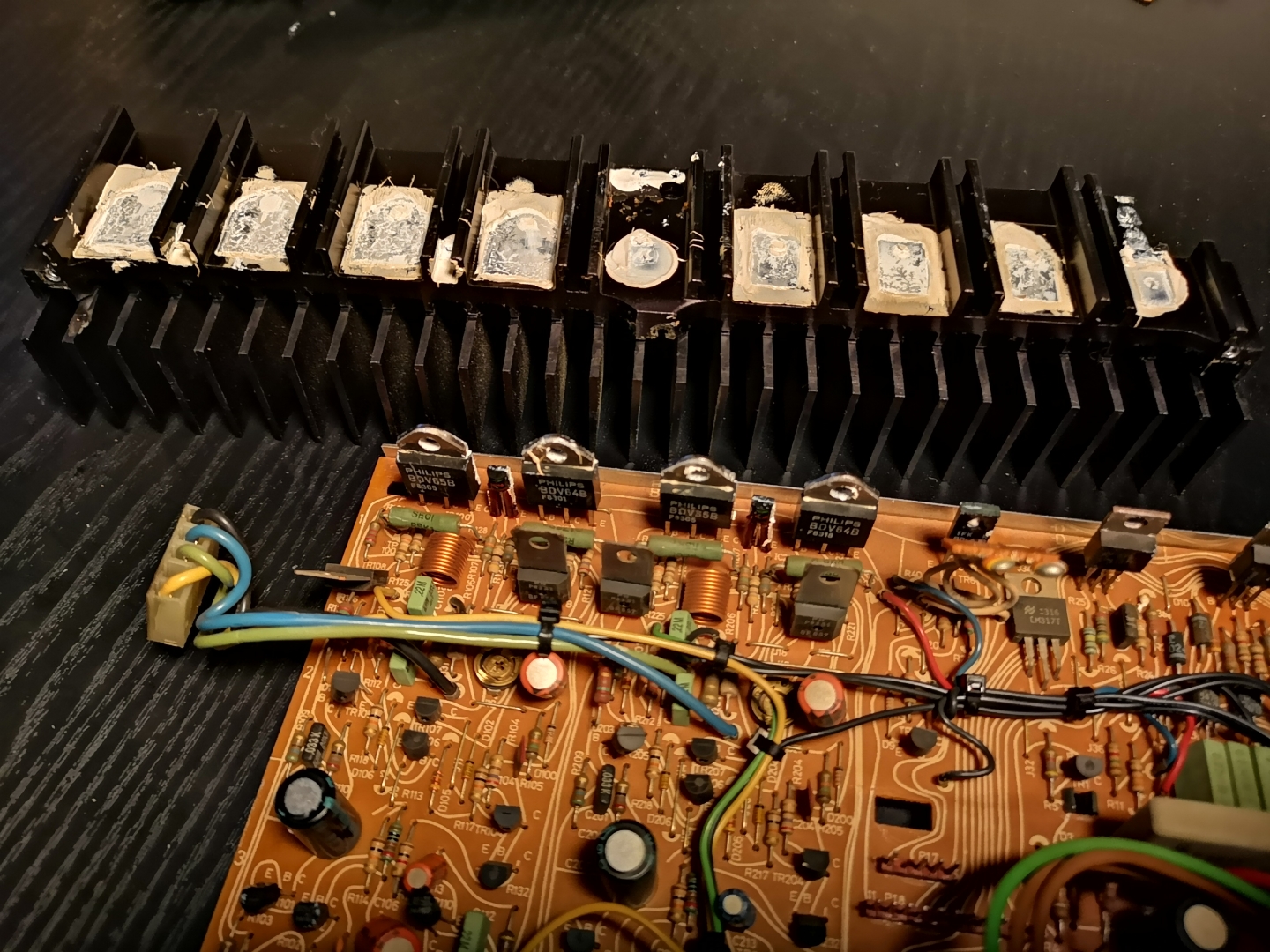 Wzmacniacz przyszedł do mnie w stanie niewiadomym. Po podłączeniu do Infinity po chwili się przegrzewał i zabezpieczenia uniemożliwiały odsłuch. Po otworzeniu i pomiarach zdecydowałem się na kompletną wymianę kondensatorów.