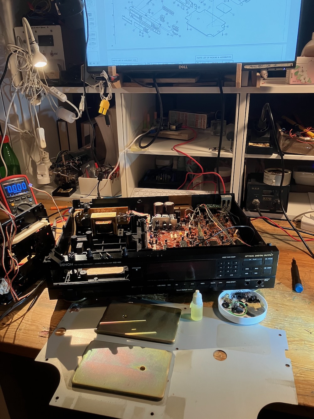 Prąd diody sprawdzony, 4,5 proc. wyższy niż na nalepce, plomba nie ruszana, więc tak po prostu mu się z latami porobiło, ale do granicy 10 proc. jeszcze trochę pogra, mam nadzieję. Gajnów trakingów i innych takich nie poprawiałem, błyskawicznie wybiera to i po co. Kilka kondensatorów wymieniłem (w torze audio bipolarne i jakieś jeszcze dwa w serwie). Poprawiłem też wadę konstrukcyjną tych denków – za ciasno polutowane zenery i rezystory szeregowe w zasilaczach, więc laminat skwierczy smażony jak frytki w Mielnie.