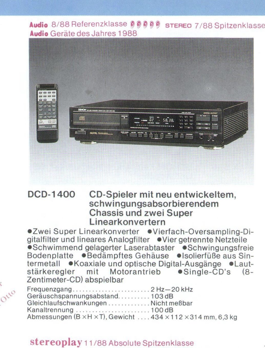Wracając. Seria denonów z tamtych lat słynie ze swojej brzydoty, a także pancernej budowy. Na pokładzie laser KSS-152A, orginały jeszcze bywają do zdobycia. Niemniej, ten akurat laser, w odróżnieniu od modeli dwieściecośtam, które zwykle spotyka się w latach 90., jest dość żywotny. I fenomenalnie łatwy do czyszczenia całej optyki z pryzmatem. Jeśli oczywiście trafi się orginał z charakterystyczną blaszaną klapką na spodzie. Tak czy owak, jak głosi stempel na kartce z katalogu poniżej, ten denon to był „Absolute Spitzenklasse”.