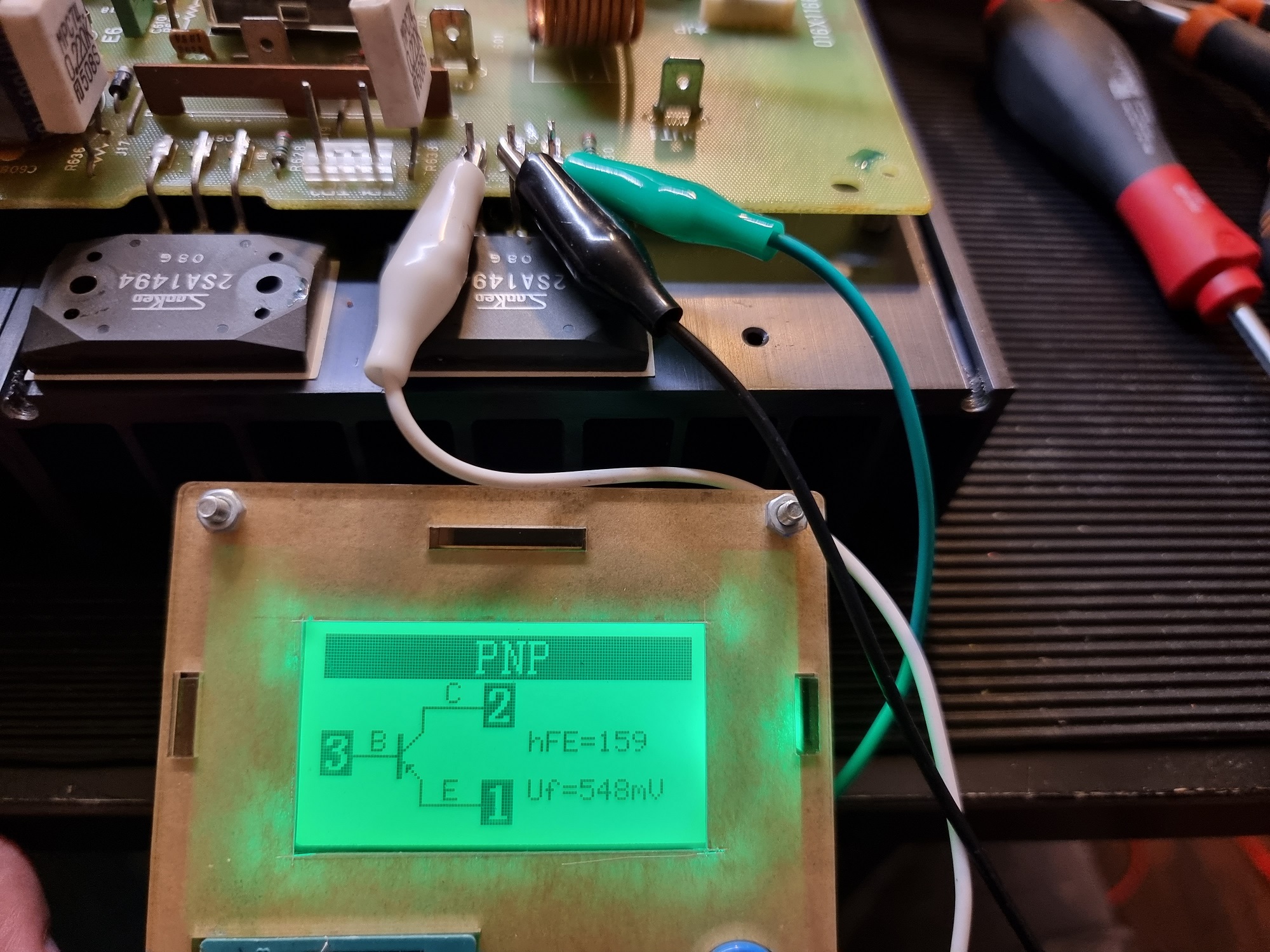 Sprawdizłem więc jeszcze raz bias i... w tym wzmacniaczu mamy dwa punkty pomiaru na kanał i jedną regulację. Ustawiając na jednym zacisku mamy 70mV i to samo jest na drugim i tak jest na prawym kanale. Na lewym kanale przy wyregulowaniu spadku na 70mV na drugim rezystorze emiterowym mamy spadek około 60mV. To może być to. albo rezytor się rozjechał albo jeden z tranzystorów się wyłamał. Zaraz okaże się, że to kolejny 5cio nóżkowy 2SA979 które ostatnio mnie prześladują
