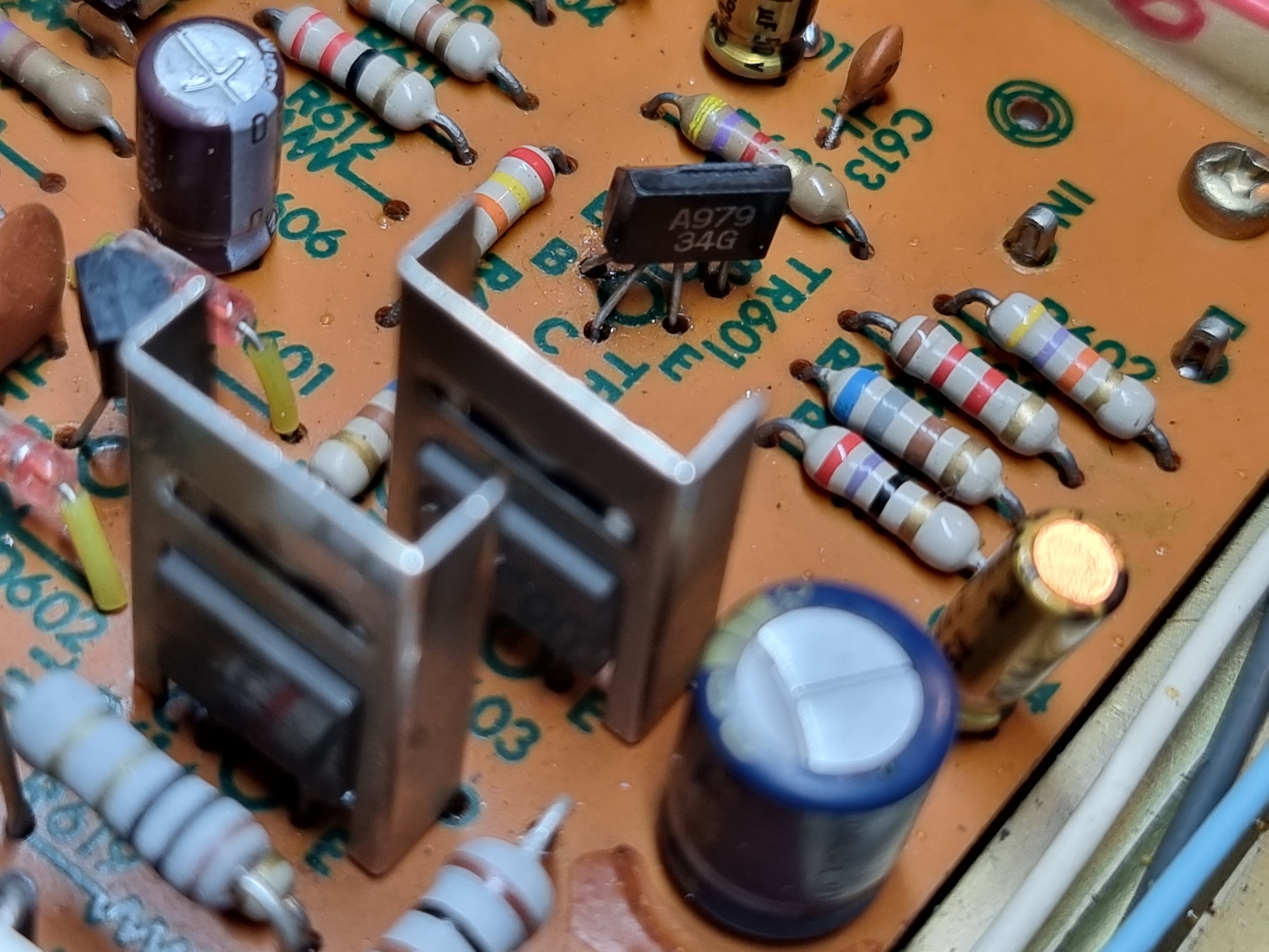 Potem jakoś spojrzałem na końcówki i okazało się, że siedzą tam 2N3773, a że mam ich trochę w domu to dobrałem coś o zbliżonych parametreach bo tu wzmocnienie w nich było od 30 do 70...