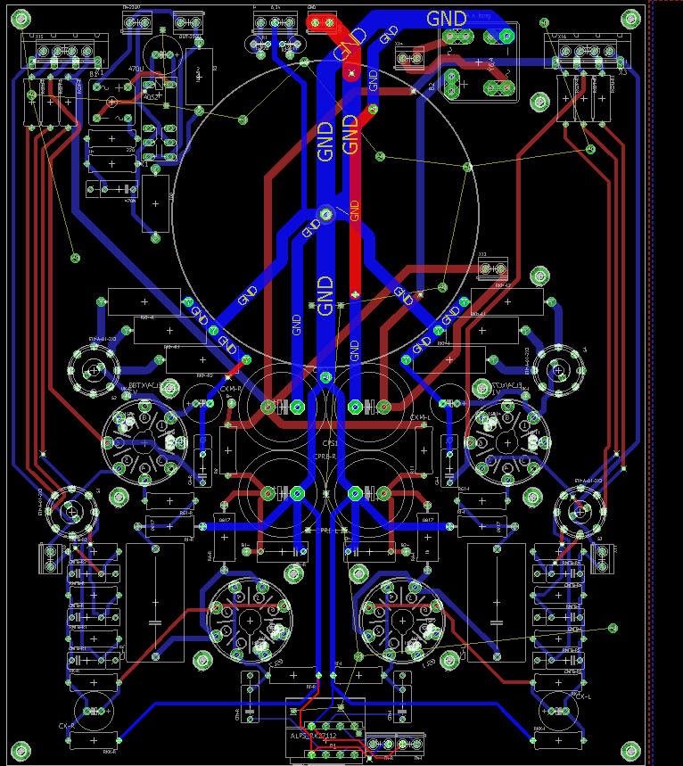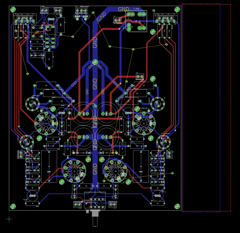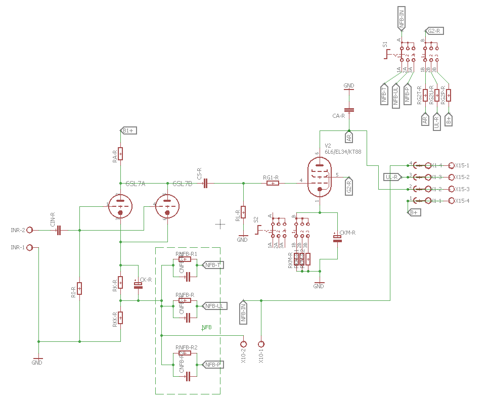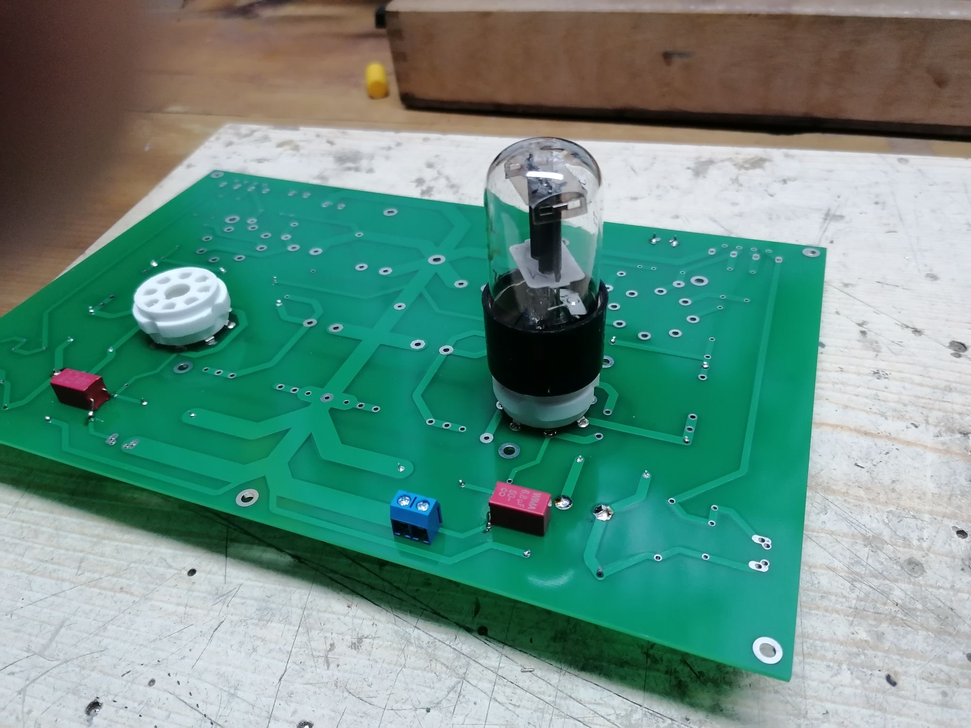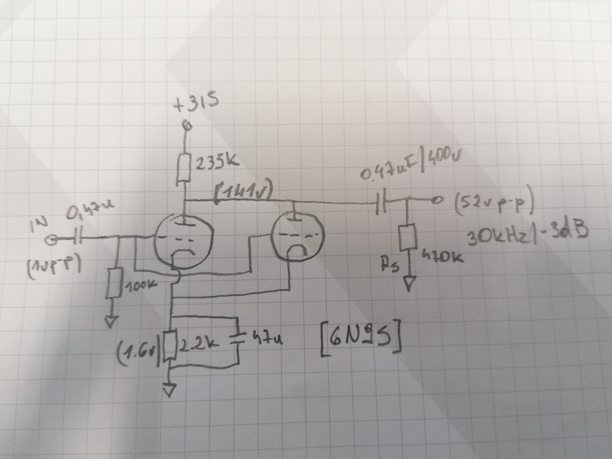 Idąc za ciosem poskładałem na desce taki oto stopień wejściowy - równolegle spiąłem ruską 6n9s, to czy elementy są dobrane optymalnie na razie chciałbym pominąć... wzmocnienie 1kHz pokrywa się z tym co obliczyłem jak również z symulacją ltspice. wzmocnienie 52 v/v