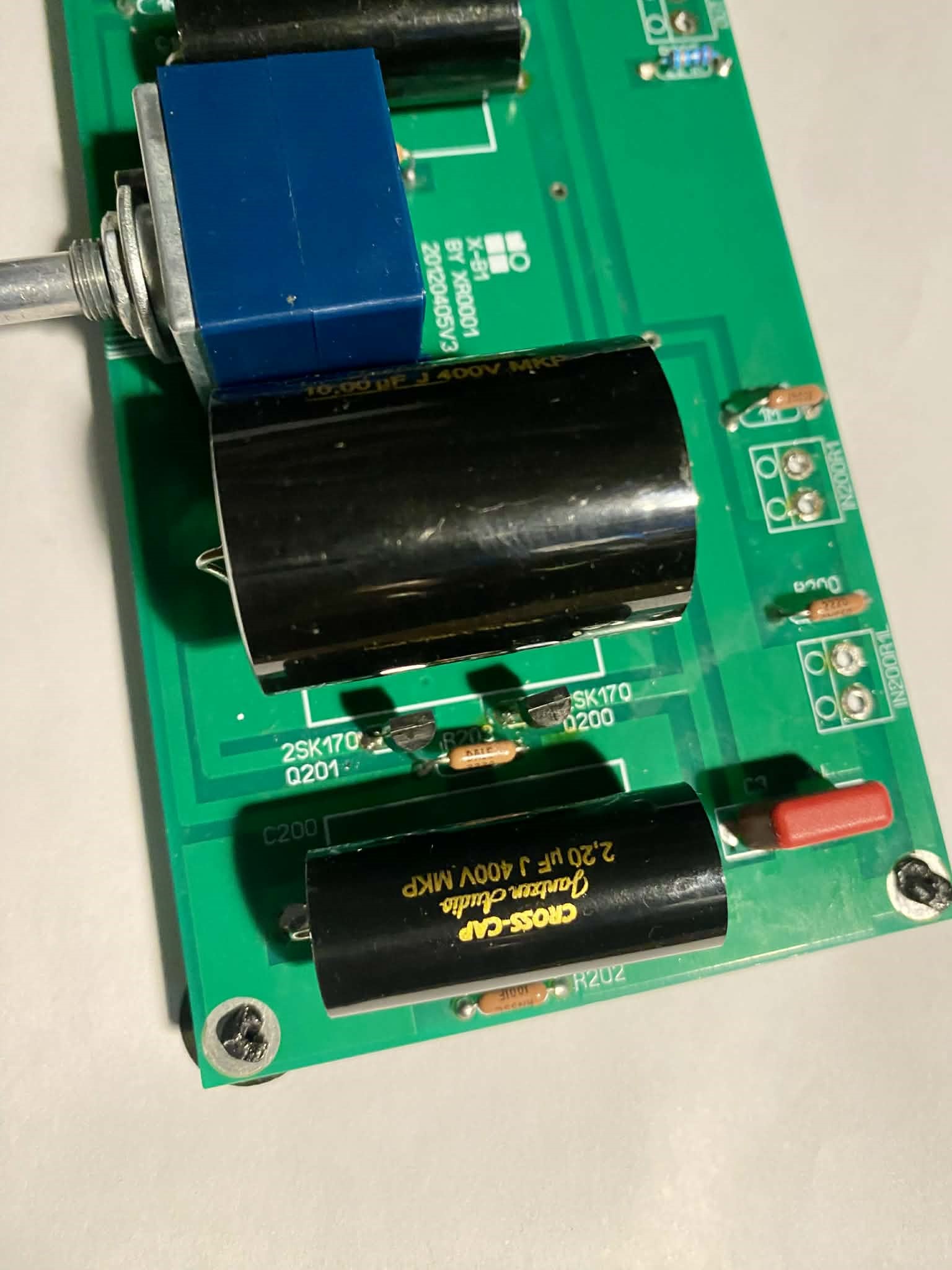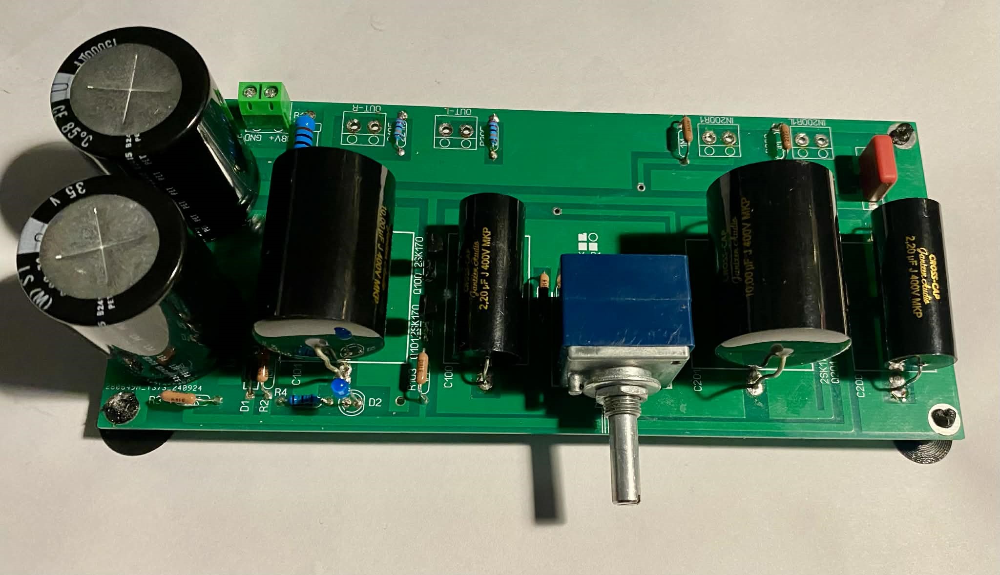 Buduje powolutku preamp/bufor B1 . Co prawda modyfikuje klona z Ali, ale schemat i budowa płytki podobne. Sam układ dźwiękowo prawie nic nie dodaje, a bardziej porządkuje impedancje pomiędzy źródłem a końcówką. Najważniejsze w tym układzie to parowanie 2SK170 bl i kondensatory wejściowe . Dobrałem z przeszło 20 sztuk kupionych na Ebay dwie pary z zbliżonym IDSS. udało się "znaleźć" cztery z identycznym 8,9-9mA -test z zasilaczem ustawionym na 9V i zwartymi G z S. Jako kondensatory wejściowe założyłem 2,2uF, popularne i niedrogie zwrotnicowe folie MKP Cross-Cup Jentzen Audio.Na wyjściu podobne 10uF. Wejściowe zmienię po przetestowaniu jeszcze wartości 1i 3,3uF. Po doborze pojemności, wybiorę coś z lepszych czerwonych Jentzen albo Mundorfów. Zasilanie -tu nie wiem jeszcze bo rozważam baterię na ogniwach 21700 , Samsunga 5000 mAh . Lub coś z możliwie najmniejszym trafem bo układ pobiera max 25 mA. W sekcji filtrującej dałem zamiast zestawowych 6800-15000uF Nichicona LS Taniego Alpsa 20K stosuje na czas testów, domyślnie ma być jakaś lepsza drabinka rezystorowa. Z tego co udało mi sie doczytać masa bufora ma być izolowana od obudowy ,ewentualnie zwarta przez blider z rezystora i małej pojemności. Oczywiście całość- zasilanie, bufor i selektor wejść będą w jednej obudowie.