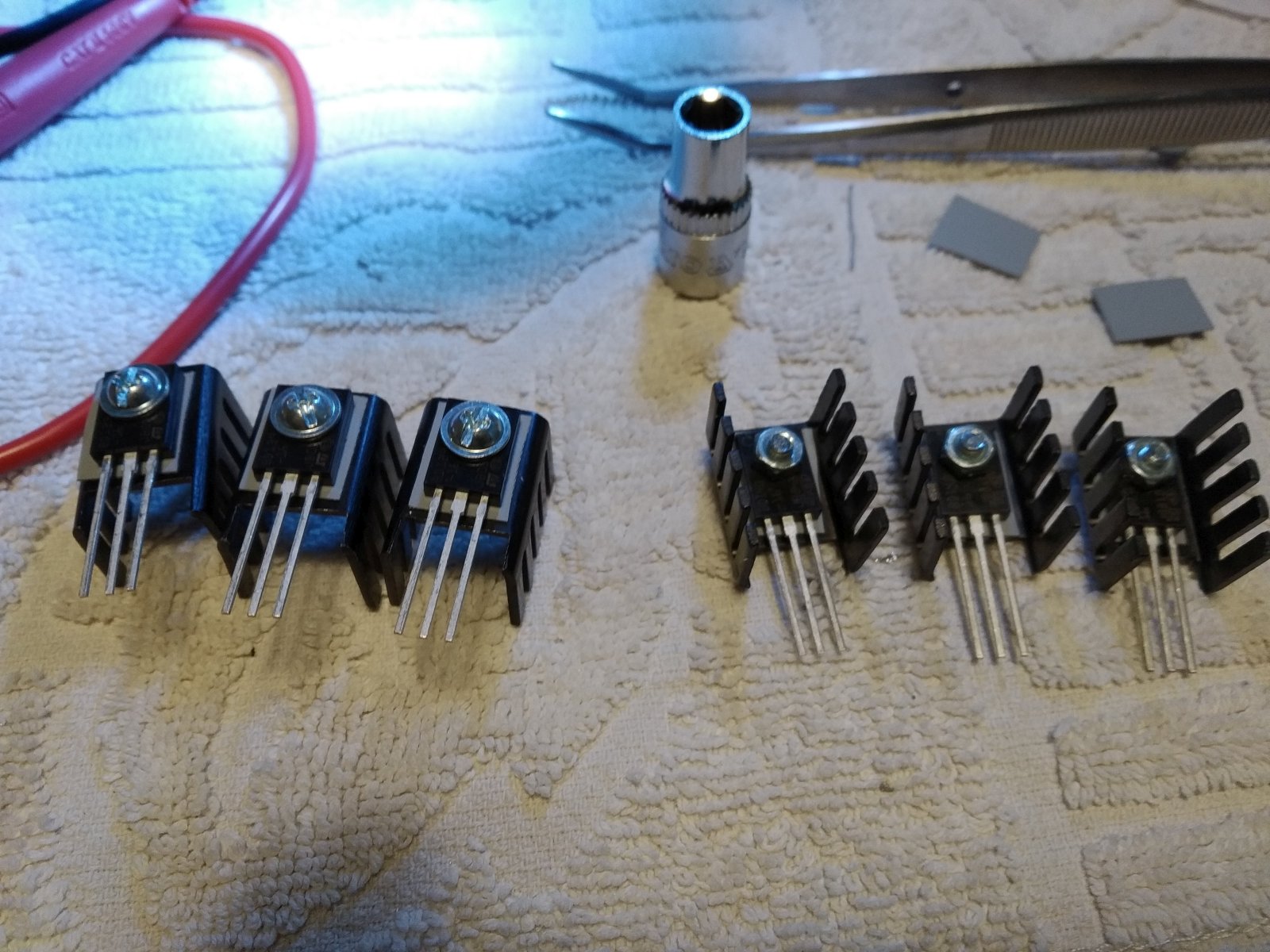 Trzy BD139 i trzy BD140 ubrane w radiatorki grzecznie czekaj na wlutowanie do płytki.