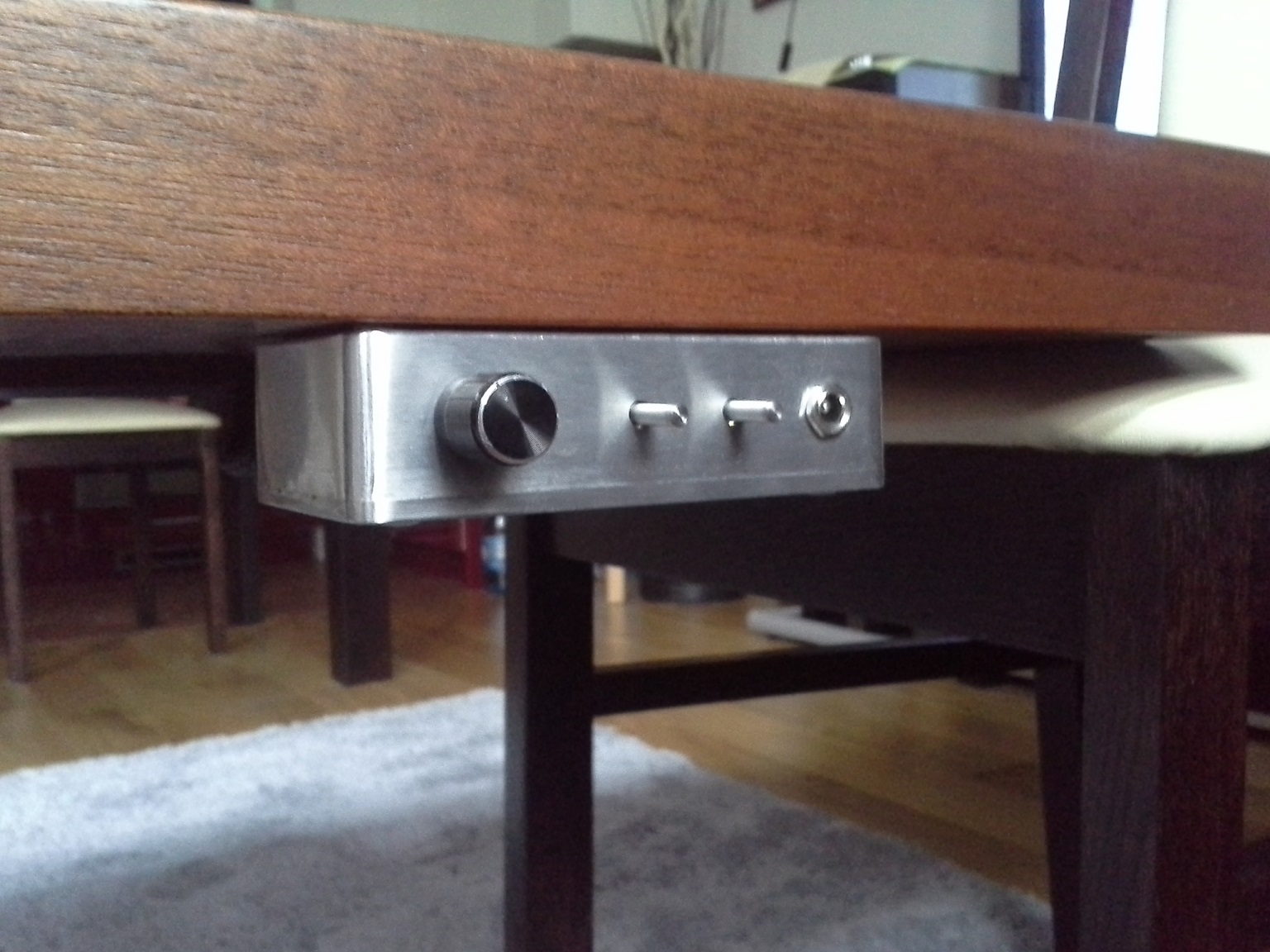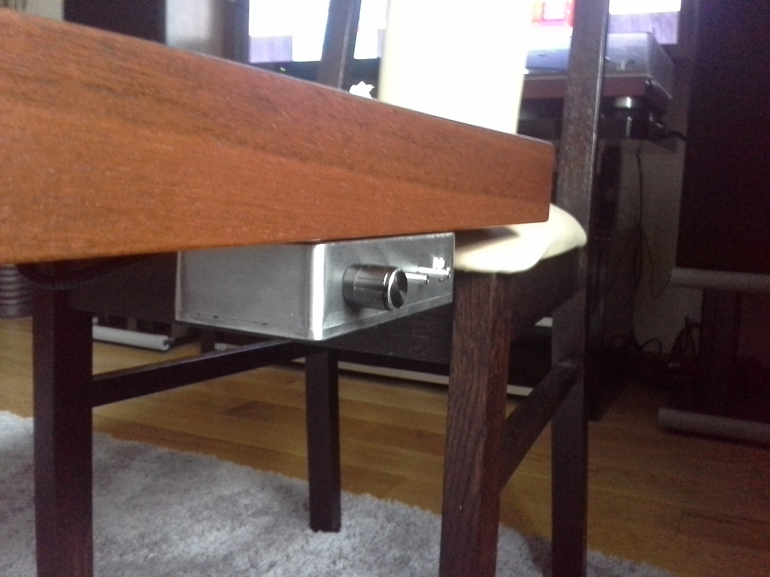 Dodatkowo zamontowałem "puszkę" sterowania silnikiem do plinty. Teraz łatwiej gramofon przenieść, odkurzyć blat pod nim, itp. Do tego celu użyłem taśmy dwustronnej - w 4 narożnikach po kawałku ok 2x2mm, żeby bez problemu oderwać kiedy będzie potrzeba i nie zniszczyć forniru. Dojście do wnętrza puszki jest od spodu (dekiel i 4 śrubki), zatem problemu nie ma. Puszkę miałem w planie malować lub anodować na czarno, ale odpuściłem temat. Zawsze można do niego wrócić.
