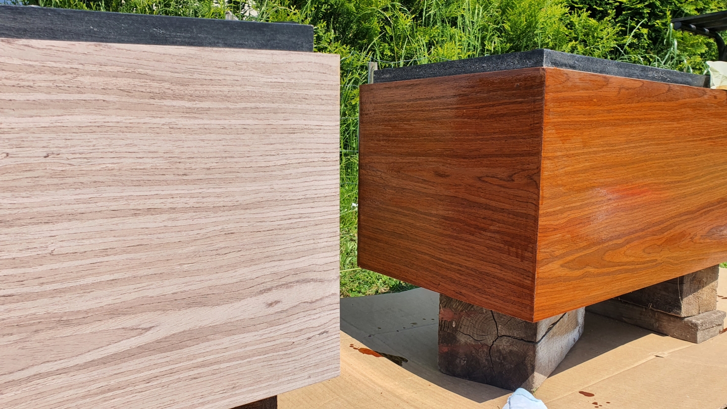 Ponieważ wraz z kolumnami właściciel posiada również inny sprzęt Sansui w orzechu, trzeba było fornir do reszty kolorystyki dopasować. Nie było to łatwe, ponieważ w Sansui orzech wpada w pomarańcz, z pomocą przyszedł dodatek oleju z mahoniem. Widać różnicę pomiędzy gołym orzechem a świeżo po nałożeniu pierwszej warstwy oleju: