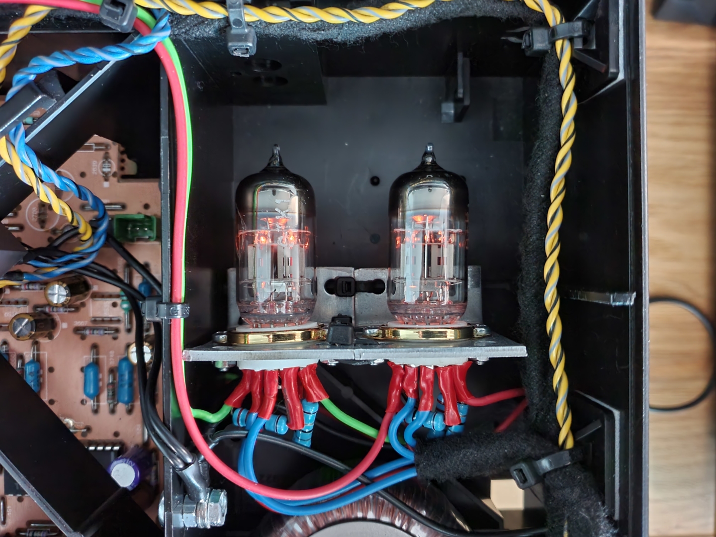 Już tutaj zaczął brzmieć naprawdę dobrze i tak przygotowany otrzymał kolejną modyfikację: wyjście analogowe na lampach 6N2P, dobrałem punkt pracy na niskim napięciu anodowym. Po 24 godzinnej pracy podwyższona temperatura na obudowie w zasadzie niezauważalna.