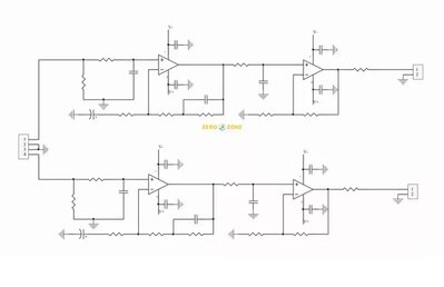 Te 100pF to zdaje się jest równoległe do 47kohm z wejścia. Z kolei na schemacie nie ma 1nF, który na pcb zapewne jest za rezystorem 75kohm do masy ...