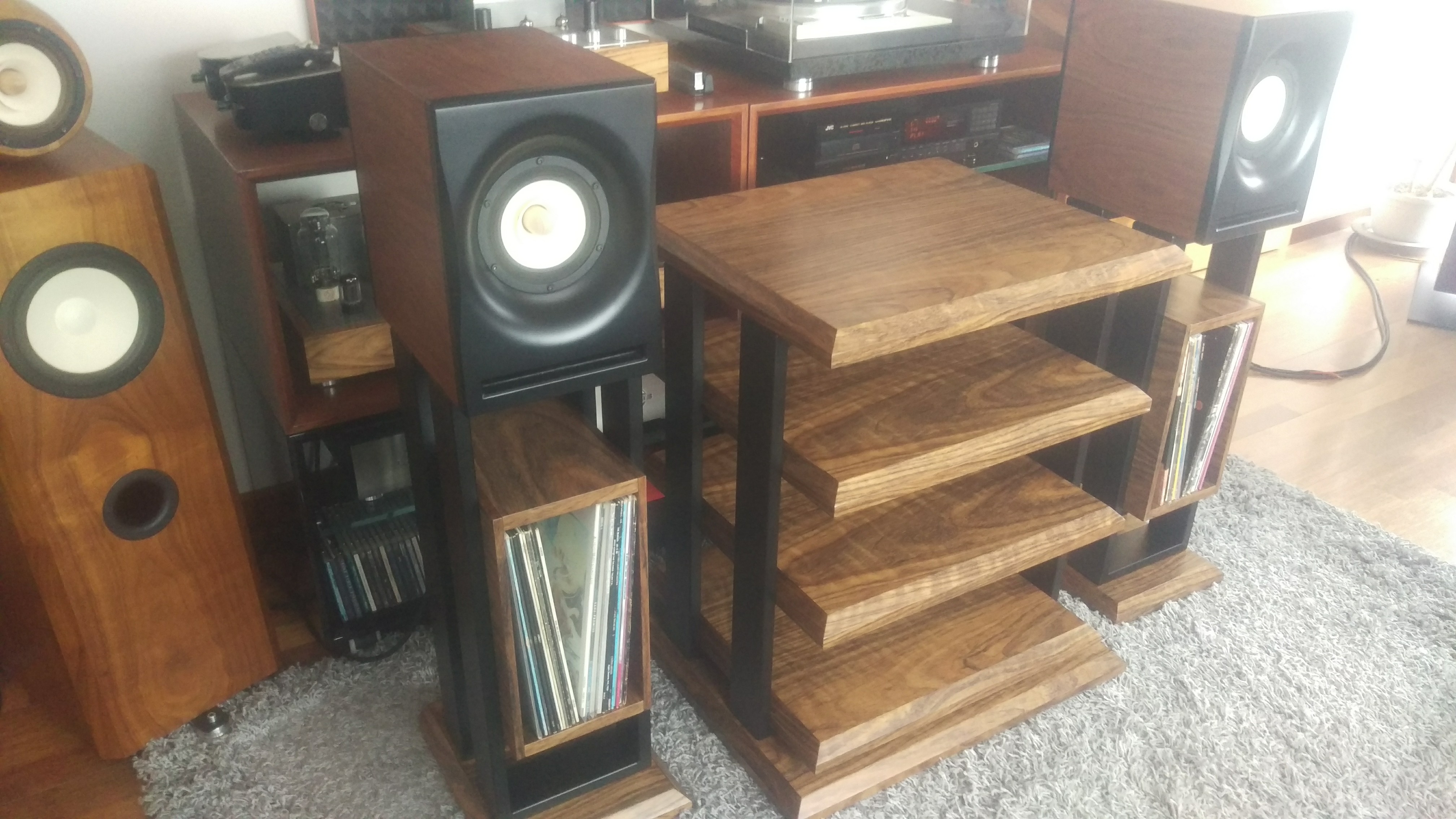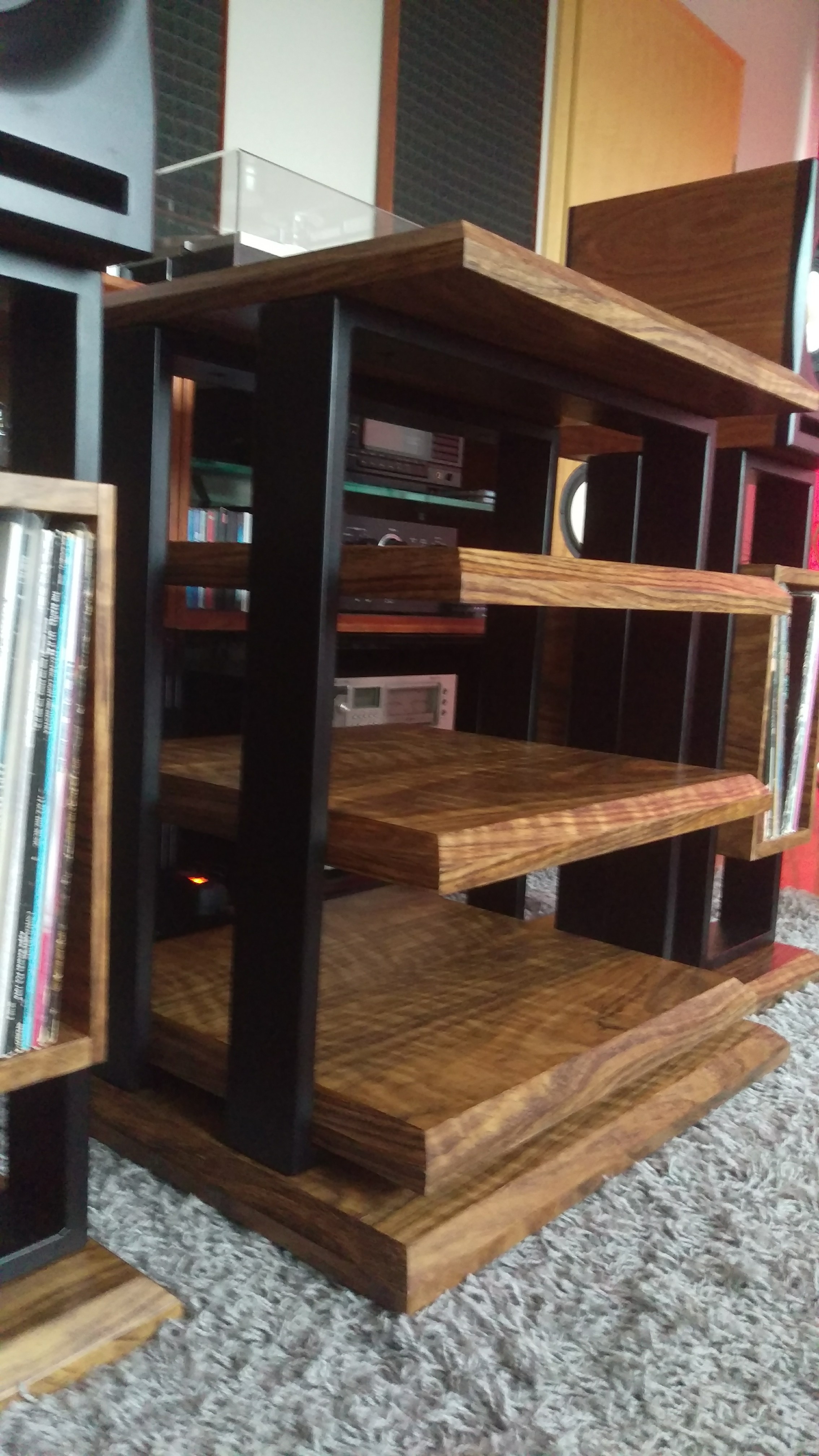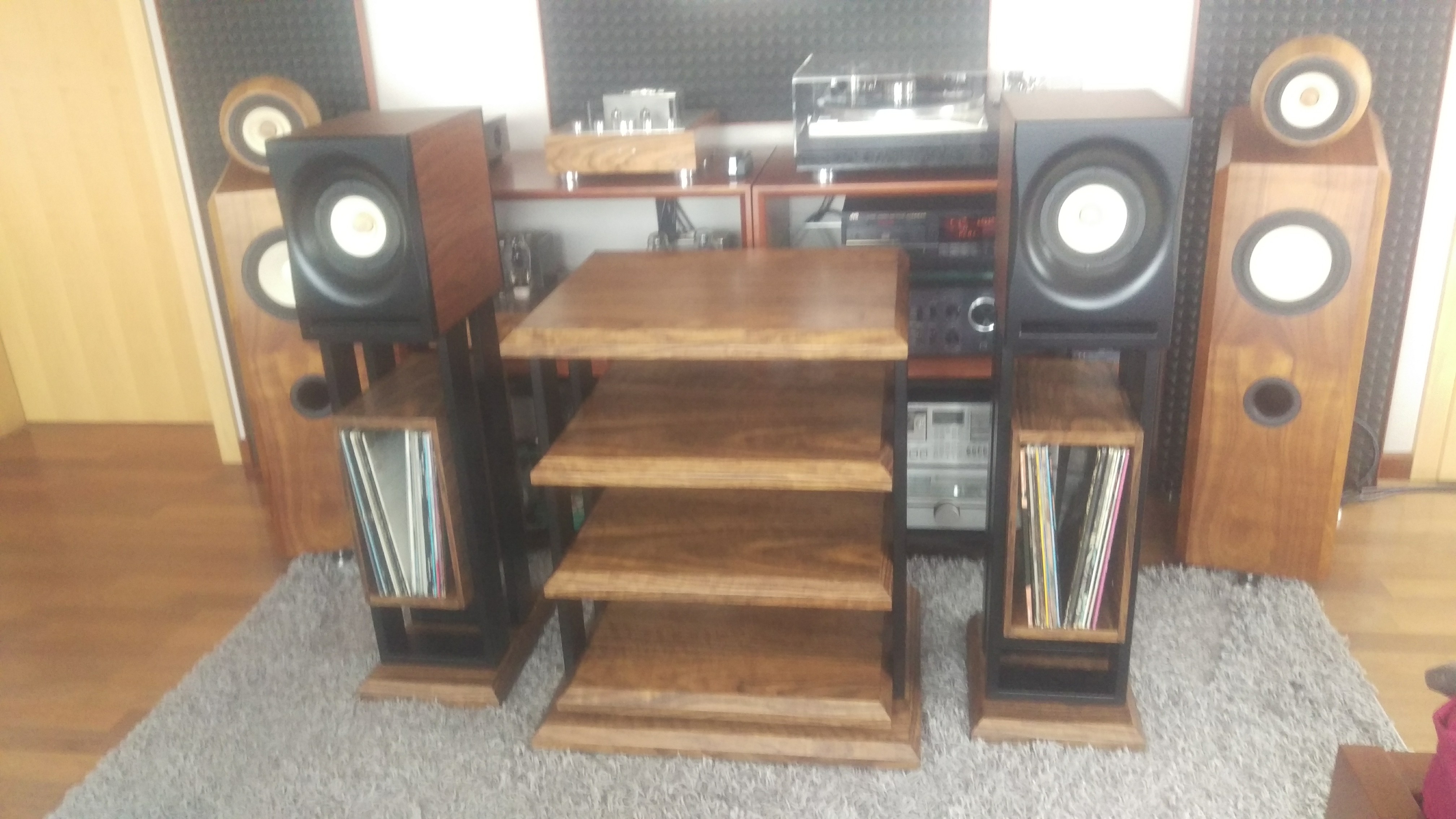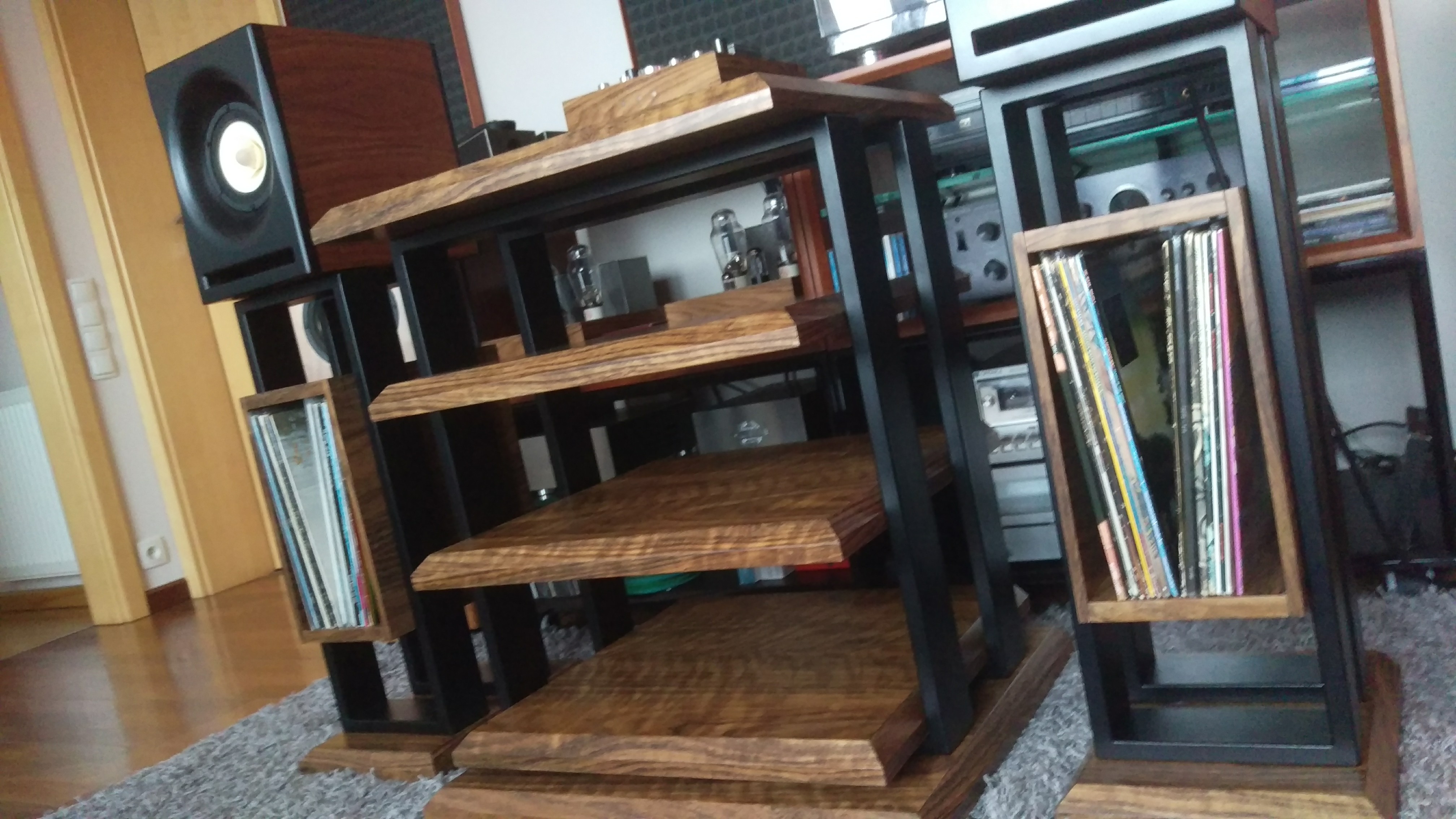 Jakiś czas temu postanowiłem zrobić zestaw mebelków pod sprzęt. Cztery półki - gramofon na wierzchu. Do zestawu stendy na monitorki z wykorzystaniem miejsca na podręczne płyty. Całość spięta konstrukcją stalową malowaną proszkowo na czarno. Półki MDF 36 mm oklejony fornirem i polakierowany - półmat. Ciężkie jak cholera, więc ze stabilnością nie ma problemu. Wczoraj udało się je skręcić. Kilka fotek z telefonu na gorąco. Jakość zdjęć fatalna bo chyba mam problem z aparatem :)