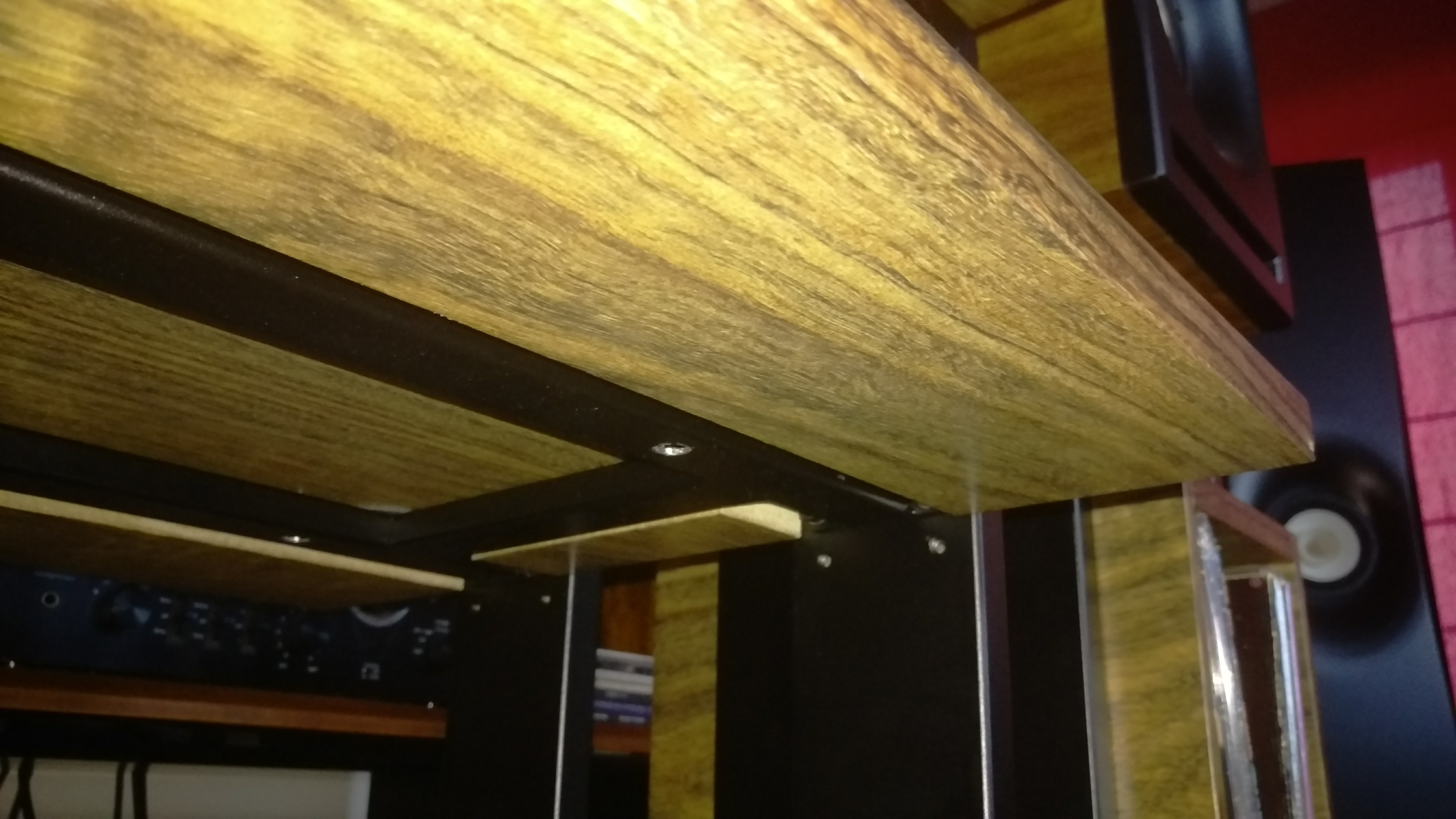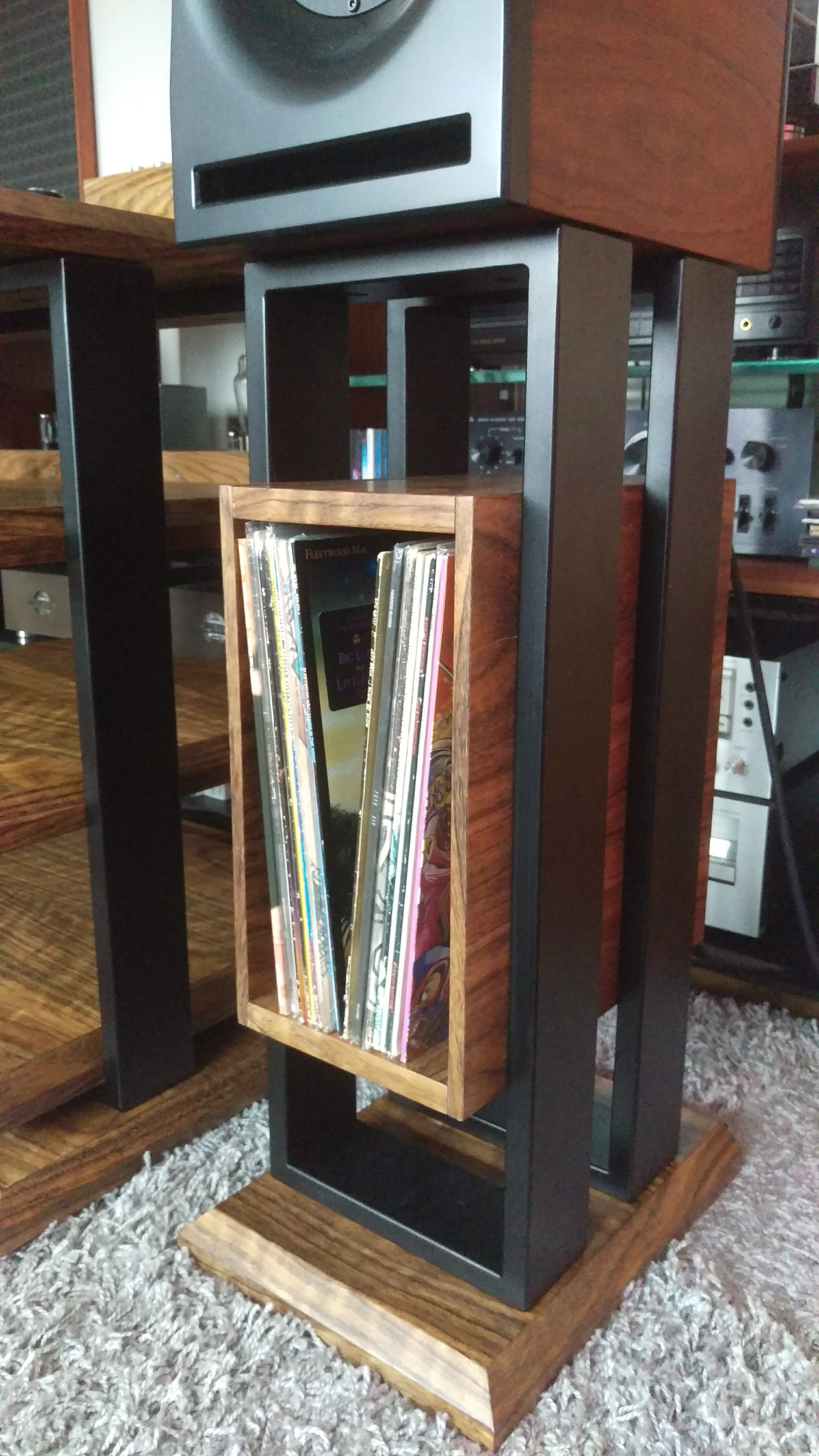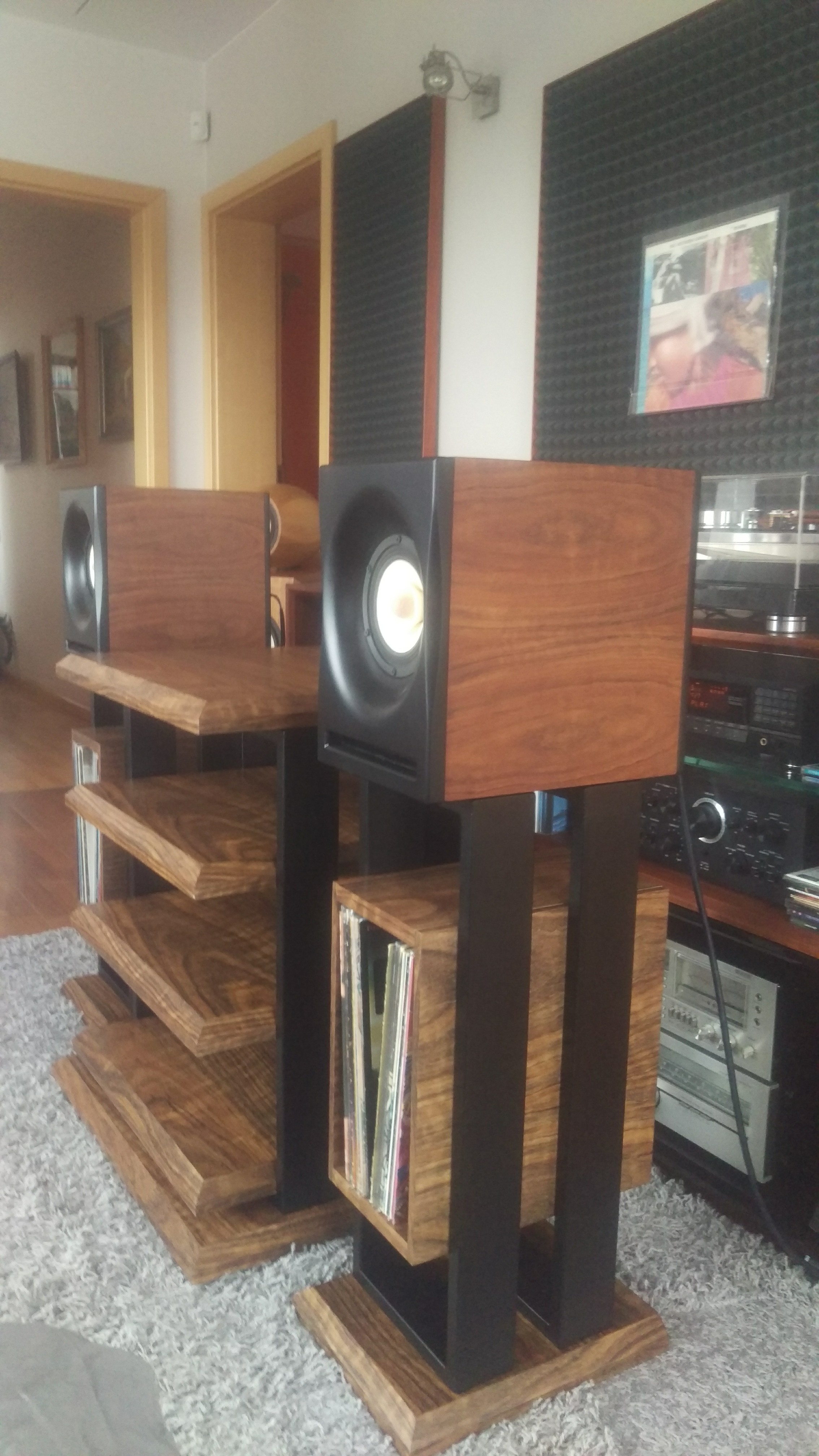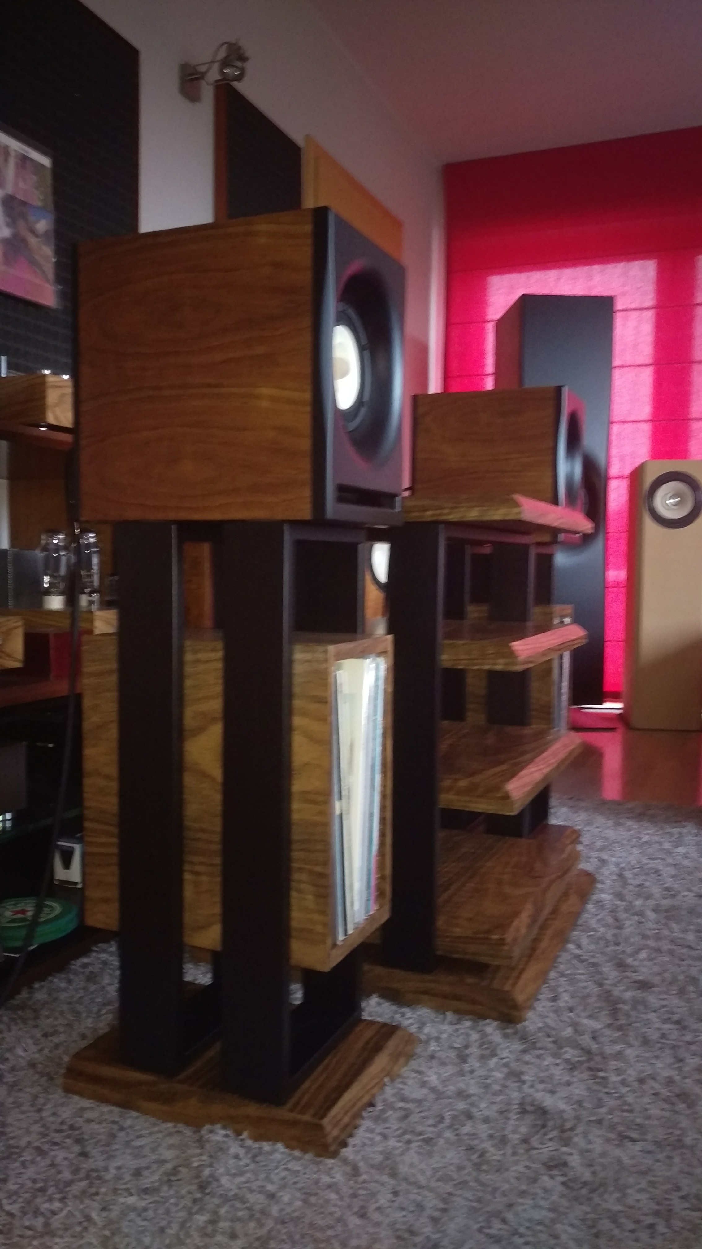 Jakiś czas temu postanowiłem zrobić zestaw mebelków pod sprzęt. Cztery półki - gramofon na wierzchu. Do zestawu stendy na monitorki z wykorzystaniem miejsca na podręczne płyty. Całość spięta konstrukcją stalową malowaną proszkowo na czarno. Półki MDF 36 mm oklejony fornirem i polakierowany - półmat. Ciężkie jak cholera, więc ze stabilnością nie ma problemu. Wczoraj udało się je skręcić. Kilka fotek z telefonu na gorąco. Jakość zdjęć fatalna bo chyba mam problem z aparatem :)