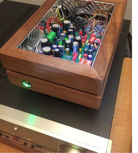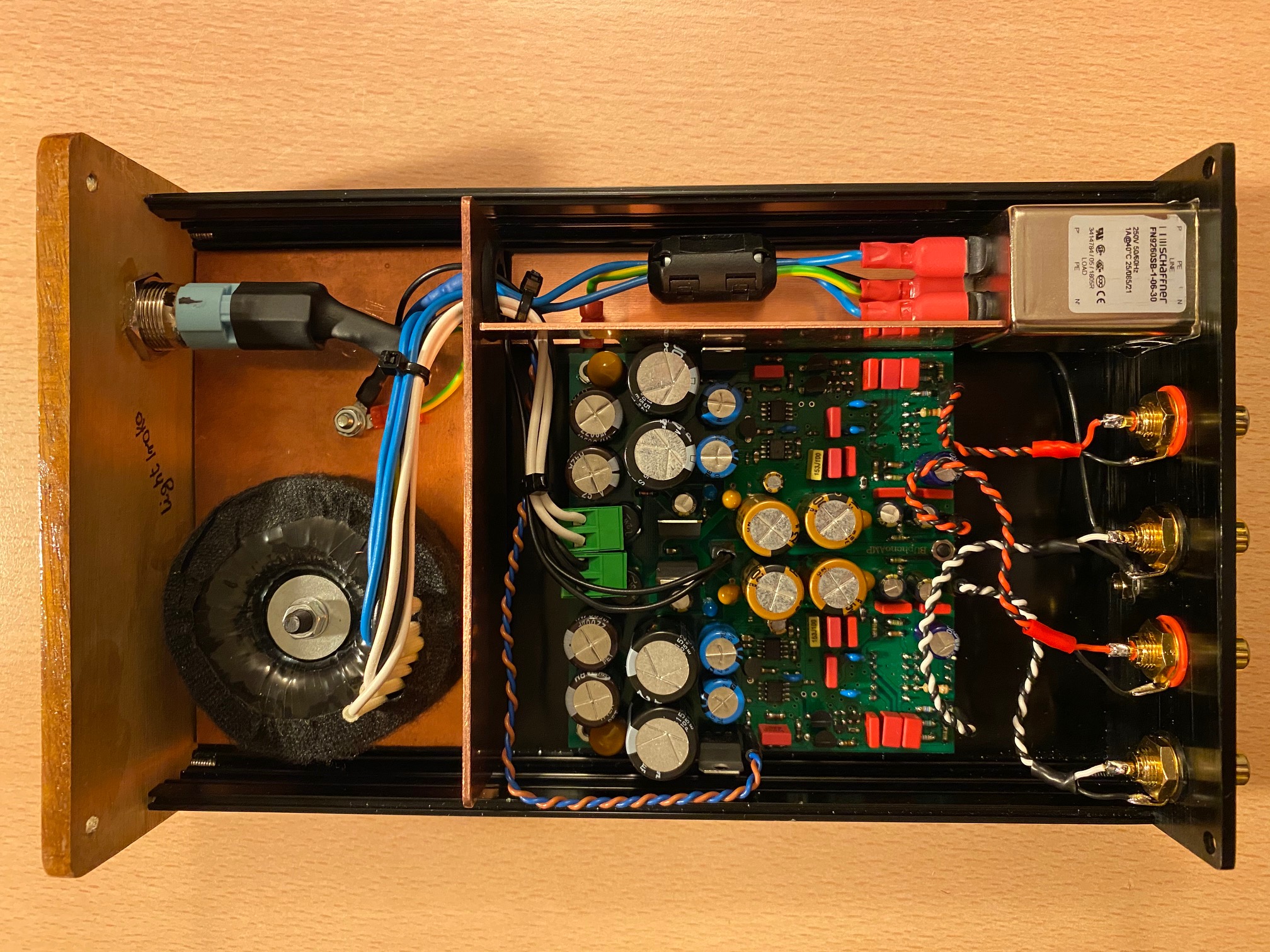 Noooo :D jest efekt WOW :) Fajnie wygląda drewniany froncik i ta blacha miedz wygląda super :) Co do obrócenia płyty. No cóż, chciałem maksymalnie odsunąć złącza wejściowe od kabli sieciowych Niby jest ekranowany filtr, załóż chociaż jakąś kostkę ferrytową na te przewody sieciowe. Coś w ten deseń