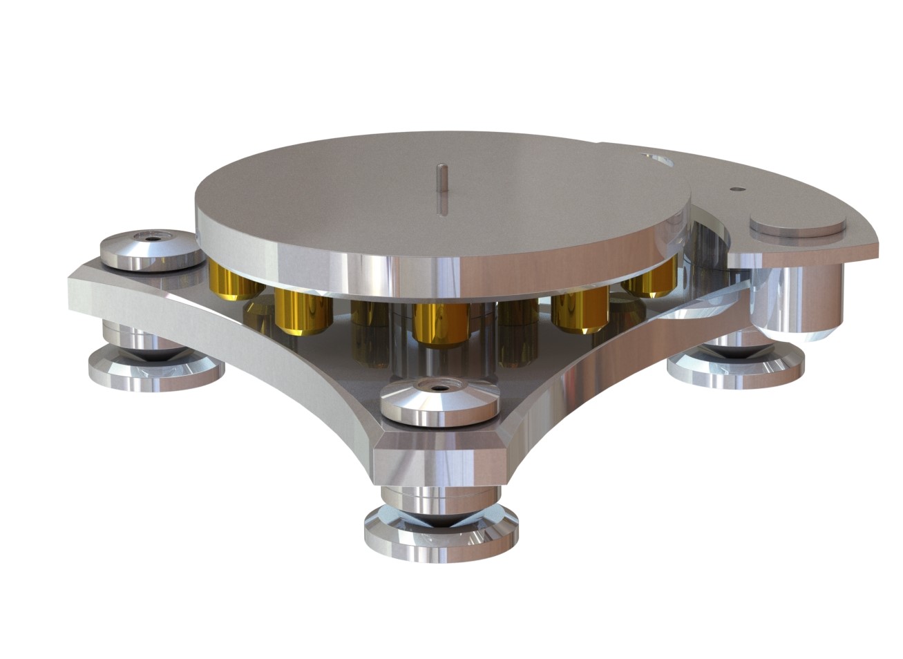 dlatego liczę na pomoc. Jako zachętę do pomocy, załączam render gramofonu (zaprojektowałem go w 3D, opierałem się na modelu Transrotora). Wszystkie elementy są wykonywane przeze mnie na precyzyjnej maszynie CNC włącznie z łożyskiem(które moim zdaniem mogłoby konkurować z topowymi markami przy naprawdę niedużym koszcie wykonania).