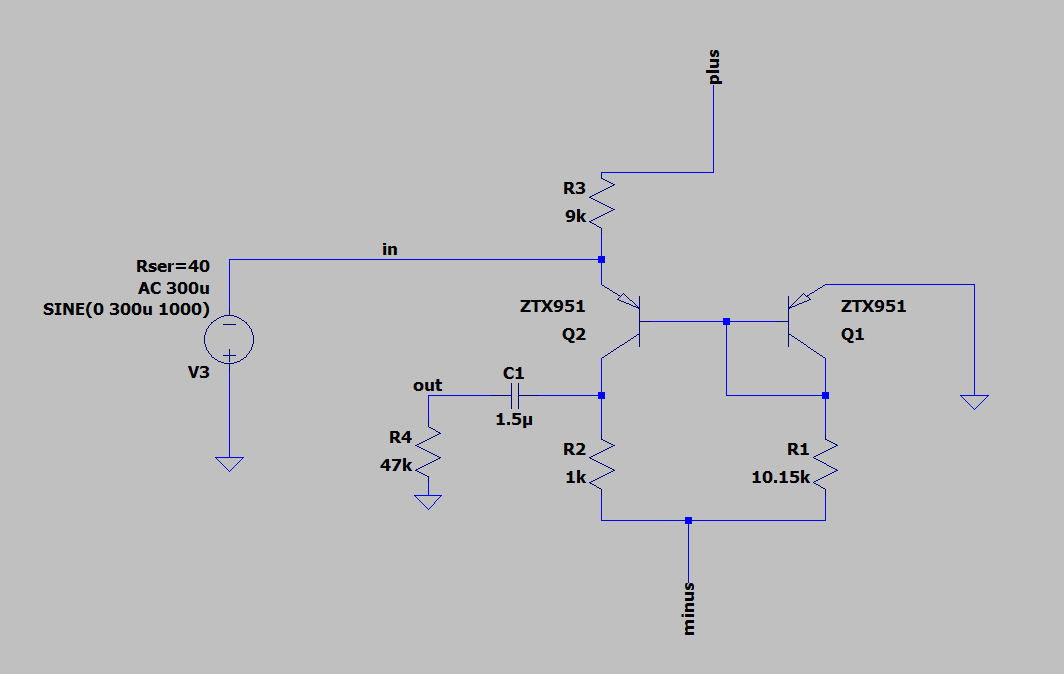 Skleciłem ten układ z innymi tranzystorami tj. MPSA92 i zasiliłem +-10V